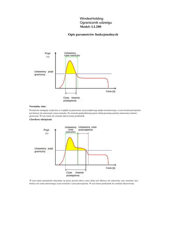 WindexHolding Ogranicznik udzwigu Model: LL200 Opis parametrów funkcjonalnych Prąd [A] Ustawiony czas rozruchu Ustawiony prąd graniczny Czas [s] Czas trwania przetężenia Normalny stan: Przetężenie następuje wyłącznie ze względu na pojawienie się początkowego prądu rozruchowego, a czas trwania przetężenia jest krótszy niż ustawienie czasu rozruchu. Po rozruchu prąd pobierany przez silnik pozostaje poniżej ustawionej wartości granicznej. W tym stanie nie zostanie aktywowany przekaźnik. Chwilowe obciążenie Prąd [A] Ustawiony Ustawiony czas czas przeciążenia rozruchu Ustawiony prąd graniczny Czas [s] Czas trwania przetężenia W tym stanie przetężenie utrzymuje się przez pewien okres czasu, który jest dłuższy niż ustawiony czas rozruchu, lecz krótszy niż suma ustawionego czasu rozruchu i czasu przeciążenia. W tym stanie przekaźnik nie zostanie aktywowany. Ustawiony czas rozruchu Prąd [A] Ustawiony czas przeciążenia Ustawiony czas zerowania Ustawiony prąd graniczny Czas [s] Czas trwania przetężenia Stan przeciążenia Jeśli prąd w uzwojeniach silnika pozostaje wyższy niż ustawiona wartość graniczna przez czas dłuższy niż suma czasu rozruchu i czasu przeciążenia, nastąpi aktywacja przekaźnika. W tym stanie tak długo jak prąd pozostaje powyżej wartości granicznej, przekaźnik przerywa obwód. Jeśli prąd spada poniżej wartości granicznej, przekaźnik pozostaje aktywowany przez okres czasu potrzebny do wyzerowania, a następnie powraca do stanu normalnej pracy (dezaktywacja). Prąd [A] Ustawiony czas rozruchu Ustawiony czas rozruchu Ustawiony czas przeciążenia Ustawiony czas zerowania Ustawiony prąd graniczny Czas [s] Czas trwania przetężenia Czas trwania przetężenia Ustawiony czas przeciążenia Przeciążenie podczas pracy Jeśli podczas pracy zdarzy się, iż prąd przekroczy wartość graniczną i pozostanie powyżej tego poziomu przez czas dłuższy niż suma czasu rozruchu plus ustawiony czas przeciążenia, nastąpi aktywacja przekaźnika. Prąd [A] Ustawiony czas rozruchu Ustawiony czas przeciążenia Ustawiony czas zerowania Ustawiony czas zerowania Ustawiony prąd graniczny Czas [s] Czas trwania przetężenia Zerowanie a dezaktywacja przekaźnika Po aktywacji przekaźnika, pozostaje on aktywny tak długo jak przekroczona jest graniczna wartość prądu. Jeśli natężenie spada poniżej wartości progowej, lecz stan ten nie utrzyma się na czas równy czasowi zerowania, przekaźnik pozostanie aktywny. Przetężenie a aktywacja przekaźnika Prąd Ustawiony czas rozruchu Ustawiony czas rozruchu [A] Ustawiony czas przeciążenia Ustawiony prąd graniczny Czas trwania przetężenia Ustawiony czas przeciążenia Czas [s] Czas trwania przetężenia Jeśli podczas pracy przetężenie nie będzie trwało dłużej niż czas równy sumie ustawionego czasu rozruchu i przeciążenia, przekaźnik nie zostanie aktywowany. Obwód nie zostanie przerwany nawet jeśli stan przetężenia utrzymywał będzie się dłużej niż ustawiony czas przeciążenia.