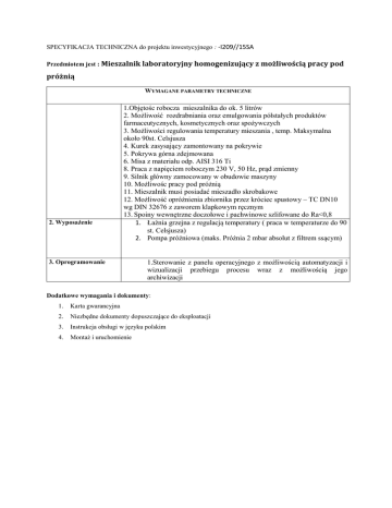 SPECYFIKACJA TECHNICZNA do projektu inwestycyjnego : -I209//15SA Przedmiotem jest : Mieszalnik laboratoryjny homogenizujący z możliwością pracy pod próżnią WYMAGANE PARAMETRY TECHNICZNE 2. Wyposażenie 1.Objętośc robocza mieszalnika do ok. 5 litrów 2. Możliwość rozdrabniania oraz emulgowania półstałych produktów farmaceutycznych, kosmetycznych oraz spożywczych 3. Możliwości regulowania temperatury mieszania , temp. Maksymalna około 90st. Celsjusza 4. Kurek zasysający zamontowany na pokrywie 5. Pokrywa górna zdejmowana 6. Misa z materiału odp. AISI 316 Ti 8. Praca z napięciem roboczym 230 V, 50 Hz, prąd zmienny 9. Silnik główny zamocowany w obudowie maszyny 10. Możliwośc pracy pod próżnią 11. Mieszalnik musi posiadać mieszadło skrobakowe 12. Możliwość opróżnienia zbiornika przez króciec spustowy – TC DN10 wg DIN 32676 z zaworem klapkowym ręcznym 13. Spoiny wewnętrzne doczołowe i pachwinowe szlifowane do Ra<0,8 1. Łaźnia grzejna z regulacją temperatury ( praca w temperaturze do 90 st. Celsjusza) 2. Pompa próżniowa (maks. Próżnia 2 mbar absolut z filtrem ssącym) 3. Oprogramowanie 1.Sterowanie z panelu operacyjnego z możliwością automatyzacji i wizualizacji przebiegu procesu wraz z możliwością jego archiwizacji Dodatkowe wymagania i dokumenty: 1. Karta gwarancyjna 2. Niezbędne dokumenty dopuszczające do eksploatacji 3. Instrukcja obsługi w języku polskim 4. Montaż i uruchomienie