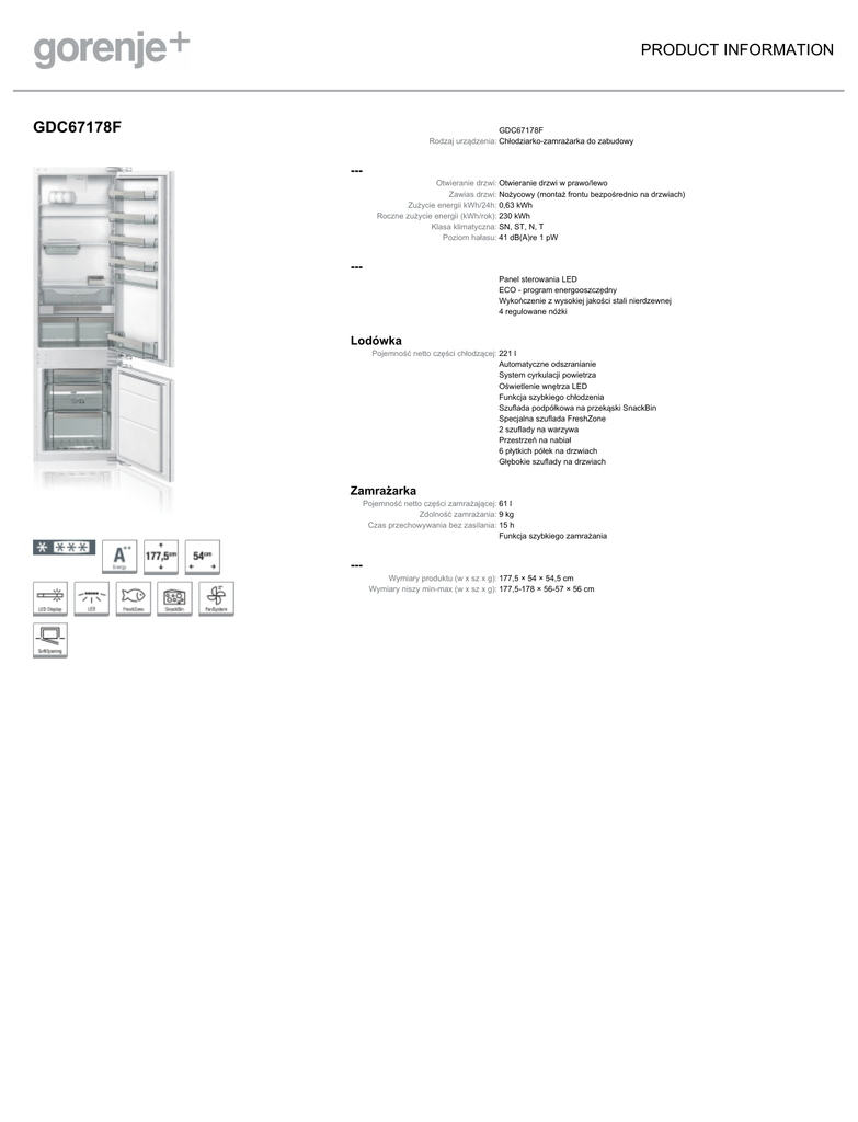 PRODUCT INFORMATION GDC67178F GDC67178F Rodzaj urządzenia: Chłodziarko-zamrażarka do zabudowy --Otwieranie drzwi: Otwieranie drzwi w prawo/lewo Zawias drzwi: Nożycowy (montaż frontu bezpośrednio na drzwiach) Zużycie energii kWh/24h: 0,63 kWh Roczne zużycie energii (kWh/rok): 230 kWh Klasa klimatyczna: SN, ST, N, T Poziom hałasu: 41 dB(A)re 1 pW -- Panel sterowania LED ECO - program energooszczędny Wykończenie z wysokiej jakości stali nierdzewnej 4 regulowane nóżki Lodówka Pojemność netto części chłodzącej: 221 l Automatyczne odszranianie System cyrkulacji powietrza Oświetlenie wnętrza LED Funkcja szybkiego chłodzenia Szuflada podpółkowa na przekąski SnackBin Specjalna szuflada FreshZone 2 szuflady na warzywa Przestrzeń na nabiał 6 płytkich półek na drzwiach Głębokie szuflady na drzwiach Zamrażarka Pojemność netto części zamrażającej: 61 l Zdolność zamrażania: 9 kg Czas przechowywania bez zasilania: 15 h Funkcja szybkiego zamrażania --Wymiary produktu (w x sz x g): 177,5 × 54 × 54,5 cm Wymiary niszy min-max (w x sz x g): 177,5-178 × 56-57 × 56 cm