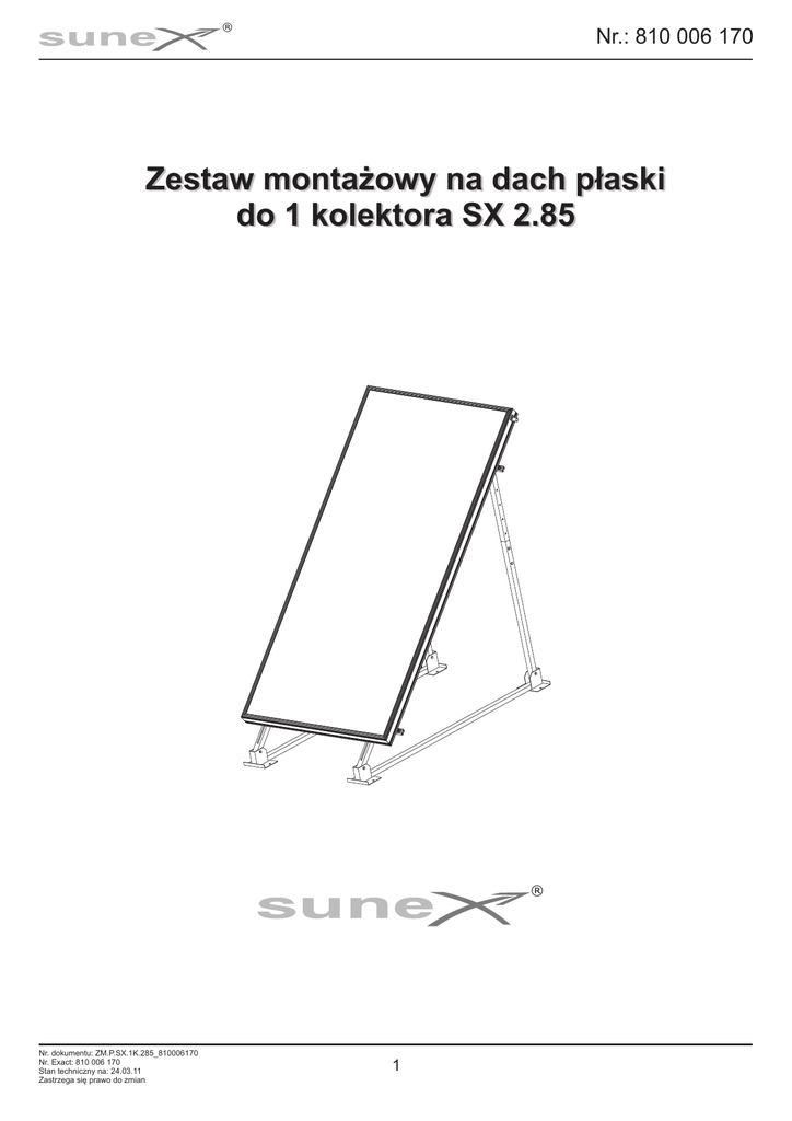 ® Nr.: 810 006 170 Zestaw montażowy na dach płaski do 1 kolektora SX 2.85 ® Nr. dokumentu: ZM.P.SX.1K.285_810006170 Nr. Exact: 810 006 170 Stan techniczny na: 24.03.11 Zastrzega się prawo do zmian 1 ® Nr.: 810 006 170 170 70 134 Ø 194 0 1467 1570 1707 12 Podstawa dolna Ø 12 150 1039 1339 150 Wykaz elementów Poz. Opis Ilość 1 Podstawa dolna 1706mm (stal nierdzewna) 2 szt. 2 Teleskop 950 mm (stal nierdzewna) 2 kpl. 3 Belka kolektora 2100mm (stal nierdzewna) 2 szt. 4 Profil aluminiowy 16x34 - L= 1339mm 2 szt. 5 Wieszak 100x4 - długi 2 szt. 6 Nakładka nierdzewna 30x74mm 2 szt. 7 Nakładka nierdzewna 30x35mm 4 szt. 8 Śruba sześciokątna nierdzewna M8x60 + nakrętka kołnierzowa 10 kpl. 9 Śruba zamkowa nierdzewna M8x20 + nakrętka kołnierzowa 8 kpl. 10 Nakładka nierdzewna 30x30mm 4 szt. 11 Nakładka aluminiowa 30x120mm - łącznik belki 2 szt. 12 Śruba zamkowa nierdzewna M8x30 + nakrętka kołnierzowa 8 szt. Nr. dokumentu: ZM.P.SX.1K.285_810006170 Nr. Exact: 810 006 170 Stan techniczny na: 24.03.11 Zastrzega się prawo do zmian 2 ® Nr.: 810 006 170 1 2 3 8 9 i profili aluminiowych 4 . 8 4 10 9 8 3 2 1 8 Poz. Opis 4 10 9 8 1 Podstawa dolna 2 Teleskop 3 Belka kolektora 4 Profil aluminiowy 5 Wieszak długi 6 Nakładka nierdzewna 30x74 7 Nakładka nierdzewna 30x35 8 9 Nr. dokumentu: ZM.P.SX.1K.285_810006170 Nr. Exact: 810 006 170 Stan techniczny na: 24.03.11 Zastrzega się prawo do zmian 3 Śruba sześciokątna nierdzewna M8x60 + nakrętka kołnierzowa Śruba zamkowa nierdzewna M8x20 + nakrętka kołnierzowa 10 11 Nakładka nierdzewna 30x30mm Nakładka aluminiowa-łącznik belki 12 Śruba zamkowa nierdzewna M8x30 + nakrętka kołnierzowa ® Nr.: 810 006 170 3. Założyć wieszaki na dolny profil aluminiowy celem podtrzymania kolektora z jego dwóch stron. 2. Sposób montażu wieszaka długiego 5 . 5 4 5. Przymocować kolektor przy pomocy nakładki nierdzewnej kompletu śrub 9 . 4. Wsunąć kolektor od góry. 7 Nr. dokumentu: ZM.P.SX.1K.285_810006170 Nr. Exact: 810 006 170 Stan techniczny na: 24.03.11 Zastrzega się prawo do zmian 4 9 7 oraz ® Nr.: 810 006 170 6. Montaż kolektora na profilach aluminiowych 4 . 9 7 10 4 9 9 7 Poz. Opis 10 4 9 5 1 Podstawa dolna 2 Teleskop 3 Belka kolektora 4 Profil aluminiowy 5 Wieszak długi 6 Nakładka nierdzewna 30x74 7 Nakładka nierdzewna 30x35 8 9 Nr. dokumentu: ZM.P.SX.1K.285_810006170 Nr. Exact: 810 006 170 Stan techniczny na: 24.03.11 Zastrzega się prawo do zmian 5 Śruba sześciokątna nierdzewna M8x60 + nakrętka kołnierzowa Śruba zamkowa nierdzewna M8x20 + nakrętka kołnierzowa 10 11 Nakładka nierdzewna 30x30mm Nakładka aluminiowa-łącznik belki 12 Śruba zamkowa nierdzewna M8x30 + nakrętka kołnierzowa ® Nr.: 810 006 170 7. Przykład montażu dwóch zestawów. 4 12 11 12 Wsunąć dwie śruby 12 w dolną część profilu aluminiowego 4 jednego zestawu montażowego oraz dwie śruby w dolną część profilu aluminiowego drugiego zestawu montażowego. Zsunąć profile aluminiowe, a następnie założyć aluminiowy łącznik belki 11 i mocno przykręcić. 8. Przymocować kolektory przy pomocy nakładki nierdzewnej Czynność należy powtórzyć na górnym profilu. 9 6 9 Nr. dokumentu: ZM.P.SX.1K.285_810006170 Nr. Exact: 810 006 170 Stan techniczny na: 24.03.11 Zastrzega się prawo do zmian 6 6 oraz kompletu śrub 9 .
