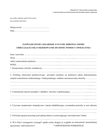 Załącznik Nr 2 do procedury postępowania w sprawach dotyczących kierowania osób do domów pomocy społecznej pieczątka zakładu opieki zdrowotnej lub praktyki lekarskiej Miejscowość ……………….………………. Data ………………………………………... ZAŚWIADCZENIE LEKARSKIE O STANIE ZDROWIA OSOBY UBIEGAJĄCEJ SIĘ O SKIEROWANIE DO DOMU POMOCY SPOŁECZNEJ Imię i nazwisko ……………………………………………..........….......……………………………. Wiek ………………………………………………….........……………........………………………. Adres zamieszkania (pobytu) ……………………….........……….........…………………………….. PESEL ……………………………………………….........…………….........………………………. 1. Rozpoznanie choroby zasadniczej …………………............………………………….......……….. ………………………………………………….............……………………….........……………….. 2. Przebieg schorzenia podstawowego– początek (ustalony na podstawie jakiej dokumentacji), stopień uszkodzenia strukturalnego i funkcjonalnego; stadium zaawansowania choroby ..………….. …………………………………………………………………………………………………............ ………………………………………………………………………………………………..........….. ………………………………………………………………………………………………..........….. 3. Uszkodzenia innych narządów i układów, choroby współistniejące …………………..........…….. ……………………………………………………………………………………………...........……. …………………………………………………………………………………………..........……….. …………………………………………………………………………………………..........……….. 4. Używane zaopatrzenie ortopedyczne i sprzęt rehabilitacyjny; ewentualne potrzeby w tym zakresie …………………………………………………….......................……………………………………. ………………………………………………………………..........………………………………...... 5. Od kiedy pacjent pozostaje pod opieką lekarza wystawiającego zaświadczenie? (data) ………………………………………….........………………………………………….…………….. 6. W/w Pan/i wymaga/nie wymaga* opieki osoby drugiej ze względu na niemożność samodzielnej egzystencji: stale/okresowo* * ODPOWIEDNIE PODKREŚLIĆ 7. Zakres niezbędnych do zapewnienia przez dom pomocy społecznej świadczeń zdrowotnych: a) pielęgnacja chorych, b) pielęgnacja i opieka na niepełnosprawnymi, c) leczenie, badania i porady lekarskie, d) rehabilitacja lecznicza, e) badania i terapia psychologiczna, f) działania zapobiegawcze 8. Stan zdrowia i możliwości psychofizyczne pozwalają na umieszczenie w DPS dla: a) osób w podeszłym wieku, b) osób przewlekle somatycznie chorych, c) osób przewlekle psychicznie chorych, d) dorosłych niepełnosprawnych intelektualnie, e) dzieci i młodzieży niepełnosprawnych intelektualnie, f) osób niepełnosprawnych fizycznie UWAGA: W przypadku występowania choroby psychicznej u osoby ubiegającej się o umieszczenie w DPS do niniejszego zaświadczenia lekarskiego dołącza się zaświadczenie lekarza psychiatry. W przypadku występowania upośledzenia umysłowego u osoby ubiegającej się o umieszczenie w DPS do niniejszego zaświadczenia dołącza się zaświadczenie psychologa. ……………………………………………………. pieczątka i podpis lekarza wystawiającego zaświadczenie