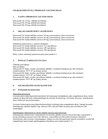 CHARAKTERYSTYKA PRODUKTU LECZNICZEGO 1. NAZWA PRODUKTU LECZNICZEGO Simvacard 10, 10 mg , tabletki powlekane Simvacard 20, 20 mg, tabletki powlekane Simvacard 40, 40 mg, tabletki powlekane 2. SKŁAD JAKOŚCIOWY I ILOŚCIOWY Simvacard 10: każda tabletka zawiera 10 mg symwastatyny (Simvastatinum). Simvacard 20: każda tabletka zawiera 20 mg symwastatyny (Simvastatinum). Simvacard 40: każda tabletka zawiera 40 mg symwastatyny (Simvastatinum). Substancje pomocnicze o znanym działaniu: Simvacard 10: każda tabletka zawiera 74,5 mg laktozy. Simvacard 20: każda tabletka zawiera 149 mg laktozy. Simvacard 40: każda tabletka zawiera 298 mg laktozy. Pełny wykaz substancji pomocniczych, patrz punkt 6.1. 3. POSTAĆ FARMACEUTYCZNA Tabletka powlekana. Opis produktu: Simvacard 10: białe, owalne, powlekane tabletki z rowkiem dzielącym po obu stronach i oznakowaniem ‘SVT 10’ po jednej stronie. Simvacard 20: białe, owalne, powlekane tabletki z rowkiem dzielącym po obu stronach i oznakowaniem ‘SVT 20’ po jednej stronie. Simvacard 40: białe, owalne, powlekane tabletki z rowkiem dzielącym po obu stronach i oznakowaniem ‘SVT 40’ po jednej stronie. 4. SZCZEGÓŁOWE DANE KLINICZNE 4.1 Wskazania do stosowania Hipercholesterolemia Leczenie pierwotnej hipercholesterolemii lub mieszanej dyslipidemii, jako uzupełnienie diety, kiedy reakcja na dietę lub inne niefarmakologiczne metody leczenia (np. ćwiczenia fizyczne, zmniejszenie masy ciała) jest niewystarczająca. Leczenie homozygotycznej hipercholesterolemii rodzinnej jako uzupełnienie diety i innego leczenia obniżającego stężenie lipidów (np. afereza LDL) lub jeśli takie leczenie jest niewłaściwe lub niedostępne. Zapobieganie zdarzeniom ze strony układu sercowo-naczyniowego Zmniejszenie zachorowań i umieralności na choroby układu sercowo-naczyniowego u pacjentów z jawną miażdżycą naczyń serca lub cukrzycą, z prawidłowym lub podwyższonym stężeniem cholesterolu, jako leczenie wspomagające, mające na celu skorygowanie innych czynników ryzyka lub uzupełnienie innej terapii zapobiegającej chorobom serca (patrz punkt 5.1) 1 4.2 Dawkowanie i sposób podawania Zakres dawkowania to 5-80 mg podawane raz na dobę, doustnie, wieczorem. Jeśli jest to konieczne, dawkę należy korygować w odstępach co najmniej 4 tygodni do maksymalnie 80 mg podawanych raz na dobę, wieczorem. Dawka 80 mg na dobę jest zalecana tylko pacjentom z ciężką hipercholesterolemią i dużym ryzykiem powikłań ze strony układu sercowo-naczyniowego, którzy nie osiągnęli celów leczenia za pomocą niższej dawki oraz kiedy spodziewane korzyści przewyższają potencjalne ryzyko (patrz punkty 4.4 i 5.1). Hipercholesterolemia Pacjent powinien stosować standardową niskocholesterolową dietę, którą należy kontynuować podczas leczenia produktem leczniczym Simvacard. Zazwyczaj początkową dawką jest 10-20 mg na dobę, wieczorem. Pacjenci, u których konieczne jest znaczne obniżenie LDL-C (powyżej 45%), mogą rozpocząć od dawki 20-40 mg raz na dobę, podawanej wieczorem. Jeśli konieczna jest korekta dawki, należy ją przeprowadzić tak, jak opisano powyżej. Homozygotyczna hipercholesterolemia rodzinna W oparciu o wyniki kontrolowanych badań klinicznych, zalecana dawka początkowa produktu leczniczego Simvacard to 40 mg raz na dobę, wieczorem. W tej grupie pacjentów, Simvacard należy stosować jako lek uzupełniający inne metody leczenia zmniejszające stężenie lipidów (np. afereza LDL) lub jeśli takie leczenie jest niedostępne lub niewłaściwe. Zapobieganie zdarzeniom ze strony układu sercowo-naczyniowego Zalecaną dawką produktu leczniczego Simvacard u pacjentów z dużym ryzykiem wystąpienia zdarzeń wieńcowych (choroba wieńcowa, z hiperlipidemią lub bez) jest 20 do 40 mg na dobę, w pojedynczej dawce wieczorem. Leczenie może być rozpoczęte jednocześnie ze stosowaniem diety i ćwiczeniami fizycznymi. Jeśli konieczna jest korekta dawkowania, należy ją przeprowadzić tak, jak opisano powyżej. Jednoczesne stosowanie z innymi lekami zmniejszającymi stężenie lipidów Simvacard jest skuteczny w monoterapii lub w skojarzeniu z preparatami wiążącymi kwasy żółciowe. Produkt leczniczy należy podawać albo nie mniej niż 2 godziny przed lub nie mniej niż 4 godziny po podaniu preparatów wiążących kwasy żółciowe. Pacjenci przyjmujący jednocześnie z produktem leczniczym Simvacard fibraty, z wyjątkiem gemfibrozylu (patrz punkt 4.3) lub fenofibratu, nie mogą stosować dobowej dawki produktu leczniczego Simvacard większej niż 10 mg na dobę. Pacjenci przyjmujący jednocześnie z produktem leczniczym Simvacard amiodaron, amlodypinę, werapamil lub diltiazem nie mogą stosować dawki produktu leczniczego Simvacard większej niż 20 mg na dobę. (Patrz punkty 4.4 i 4.5) Niewydolność nerek Nie ma konieczności zmiany dawkowania u pacjentów z umiarkowaną niewydolnością nerek. U pacjentów z ostrą niewydolnością nerek (klirens kreatyniny < 30 ml/min), należy bardzo starannie rozważyć podawanie dawki większej niż 10 mg na dobę i jeśli jest to niezbędne, bardzo ostrożnie rozpocząć leczenie. Stosowanie u pacjentów w podeszłym wieku Dostosowanie dawkowania nie jest konieczne. Stosowanie u dzieci i młodzieży (w wieku 10-17 lat) Zwykle zalecana dawka początkowa dla dzieci i młodzieży (chłopców w fazie II i powyżej wg skali Tannera oraz dziewcząt, u których minął co najmniej jeden rok od pierwszej miesiączki, w wieku 10– 17 lat) z heterozygotyczną hipercholesterolemią rodzinną wynosi 10 mg raz na dobę wieczorem. Przed rozpoczęciem leczenia symwastatyną u dzieci i młodzieży należy zastosować standardową dietę obniżającą stężenie cholesterolu; dietę należy kontynuować w trakcie leczenia symwastatyną. Zalecany zakres dawki wynosi 10-40 mg na dobę; najwyższa zalecana dawka wynosi 40 mg na dobę. Dawki należy dostosowywać indywidualnie zgodnie z zalecanym