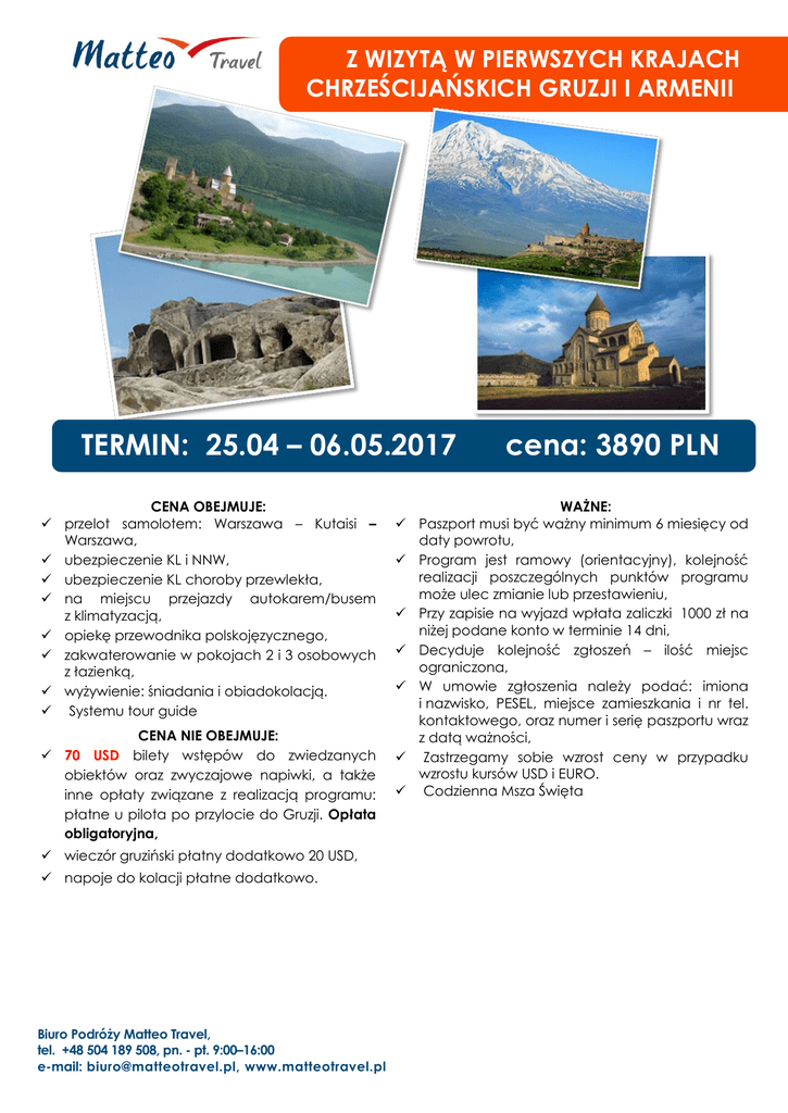 Z WIZYTĄ W PIERWSZYCH KRAJACH CHRZEŚCIJAŃSKICH GRUZJI I ARMENII TERMIN: 25.04 – 06.05.2017 CENA OBEJMUJE: przelot samolotem: Warszawa – Kutaisi – Warszawa, ubezpieczenie KL i NNW, ubezpieczenie KL choroby przewlekła, na miejscu przejazdy autokarem/busem z klimatyzacją, opiekę przewodnika polskojęzycznego, zakwaterowanie w pokojach 2 i 3 osobowych z łazienką, wyżywienie: śniadania i obiadokolacją. Systemu tour guide CENA NIE OBEJMUJE: 70 USD bilety wstępów do zwiedzanych obiektów oraz zwyczajowe napiwki, a także inne opłaty związane z realizacją programu: płatne u pilota po przylocie do Gruzji. Opłata obligatoryjna, wieczór gruziński płatny dodatkowo 20 USD, napoje do kolacji płatne dodatkowo. Biuro Podróży Matteo Travel, tel. +48 504 189 508, pn. - pt. 9:00–16:00 e-mail: [email protected], www.matteotravel.pl cena: 3890 PLN WAŻNE: Paszport musi być ważny minimum 6 miesięcy od daty powrotu, Program jest ramowy (orientacyjny), kolejność realizacji poszczególnych punktów programu może ulec zmianie lub przestawieniu, Przy zapisie na wyjazd wpłata zaliczki 1000 zł na niżej podane konto w terminie 14 dni, Decyduje kolejność zgłoszeń – ilość miejsc ograniczona, W umowie zgłoszenia należy podać: imiona i nazwisko, PESEL, miejsce zamieszkania i nr tel. kontaktowego, oraz numer i serię paszportu wraz z datą ważności, Zastrzegamy sobie wzrost ceny w przypadku wzrostu kursów USD i EURO. Codzienna Msza Święta GRUZJA I ARMENIA 1. DZIEŃ - 25.04.2017 – wtorek. Spotkanie na lotnisku im. F. Chopina Warszawa – Okęcie, msza święta. Od godziny 14:00. nadanie bagażu i wylot do Kutaisi o godz. 16:05. Lądowanie w Kutaisi 21:25 i przejazd autokarem na nocleg w okolice Tbilisi. Zakwaterowanie, późna kolacja i nocleg. 2. DZIEŃ - 26.04.2017 – śr. Śniadanie. Około południa przejedziemy do duchowej stolicy Gruzji – Mcchety. Wjedziemy pod górujący nad miastem Kościół Dżwari (VI w.), skąd roztacza się niezapomniany widok na „gruziński Wawel” oraz łączące się rzeki Aragwi i Mtkwari. Następnie odwiedzamy wpisaną na listę światowego dziedzictwa UNESCO katedrę Sveti Cchoveli (Drzewa Życia), gdzie złożono szatę Pana Jezusa i gdzie znajdują się groby gruzińskich królów z dynastii Bagratydów. Udajemy się również do żeńskiego klasztoru Samtavro, w którym pochowano króla Miriana i królową Nanę – władców, którzy w 337 roku przyjęli chrześcijaństwo. Tu można pomodlić się również u grobu XX-wiecznego świętego – Gabriela. nastepnie Monastyr (klasztor) Sziomgwime — męski klasztor prawosławny działający do dnia dzisiejszego. Inicjatorem powstania zespołu klasztornego był św. Szio – jeden z 13 Ojców Syryjskich, których przybycie w VI wieku do starożytnej Gruzji zapoczątkowało na jej terytorium rozwój monastycyzmu. Najstarsze części zespołu klasztornego powstały na początku VI wieku. Powrót do hotelu, obiadokolacja i nocleg. 3. DZIEŃ - 27.04. – czw. Po śniadaniu wyruszymy do Kachetii, której stolicą jest Telawi. Odwiedzimy założony w VI wieku kompleks klasztorny w Ikalto z trzema cerkwiami oraz pozostałościami po słynnej akademii, a także malowniczy, XI-wieczny klasztor Alawerdi z kopułą na wysokości 55 metrów. Zobaczymy jeden z ważniejszych zabytków architektury gruzińskiej: pozostałości po średniowiecznym mieście, dawnej stolicy Kachetii – Gremi, z zachowanym na wzgórzu kościołem św. Archaniołów i trzypoziomową wieżą mieszkalną – zamkiem. Czeka nas również degustacja wina w jednej z gruzińskich winiarni, gdzie dowiemy się co różni europejską i gruzińską metodę produkcji wina. Powrót do Tbilisi na nocleg. *Dla chętnych tradycyjna gruzińska supra (czyli uczta w cenie 20 USD os osoby) w restauracji. Nocleg. Dla pozostałych obiadokolacja w hotelu. 4. DZIEŃ - 28.04 – pt. Po śniadaniu wyruszymy w stronę gór Wysokiego Kaukazu jedną z najciekawszych tras w kraju - Gruzińską Drogą Wojenną. Po drodze zwiedzimy twierdzę Ananuri (XVI-XVII w.), urokliwie położoną nad zasilającym tutejszą elektrownię zbiornikiem wodnym Żinwali. Następnie, jadąc wzdłuż rzeki Aragavi, miniemy kurort narciarski Gudauri i dotrzemy do Stepancmindy (dawniej Kazbegi). Miasto otoczone jest gigantycznymi górami z malowniczym widokiem na szczyt Kazbek (5047 m n.p.m.), jeden z sześciu najwyższych szczytów Kaukazu. Biuro Podróży Matteo Travel, tel. +48 504 189 508, pn. - pt. 9:00–16:00 e-mail: [email protected], www.matteotravel.pl * Dla chętnych – wjazd jeepami pod kościół Św. Trójcy (Cminda Sameba), zbudowany na wysokości 2170 m n.p.m. – jeden z symboli Gruzji (10 lari – ok. 16 zł). Powrót do Tbilisi. Obiadokolacja. Nocleg. 5. DZIEŃ - 29.04 – sb. Śniadanie. Całodzienna wycieczka po Tbilisi. Zawitamy do największej świątyni gruzińskiej – Kościoła Świętej Trójcy (Cminda Sameba), pospacerujemy po wielokulturowej tbiliskiej starówce, wjedziemy kolejką gondolową pod górujący nad miastem pomnik Matki Gruzji, przejdziemy pod murami twierdzy Narikala, odwiedzimy najstarszą dzielnicę miasta - Abanotubani – z łaźniami siarkowymi i meczetem, zobaczymy most i kościół Metechi, z którymi związane są losy gruzińskich męczenników, katedrę Sioni, w której przechowywany jest krzyż najważniejszej świętej gruzińskiej - Nino, a także najstarszą świątynię w Tbilisi – bazylikę Anczischati, synagogę żydowską, oraz słynny Most Pokoju. Po południu czas wolny. Wieczorem powrót na kolację. 6. DZIEŃ – 30 .04 – ndz. Po śniadaniu ruszymy do Upliscyche – najstarszego skalnego miasta Gruzji, którego historia sięga V w. p.n.e. Przejedziemy przez Gori, rodzinne miasto Stalina, w którym znajduje się poświęcone mu muzeum (wejście dla chętnych, za dodatkową opłatą). W miejscowości uzdrowiskowej Bordżomi można będzie pospacerować po Parku Zdrojowym oraz skosztować leczni