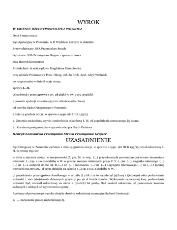 WYROK W IMIENIU RZECZYPOSPOLITEJ POLSKIEJ Dnia 8 maja 2014r. Sąd Apelacyjny w Poznaniu, w II Wydziale Karnym w składzie: Przewodniczący: SSA Przemysław Strach Sędziowie: SSA Przemysław Grajzer - sprawozdawca SSA Henryk Komisarski Protokolant: st.sekr.sądowy Magdalena Ziembiewicz przy udziale Prokuratora Prok. Okręg. del. do Prok. Apel. Alicji Woźniak po rozpoznaniu w dniu 8 maja 2014r. sprawy L. H. oskarżonej o przestępstwa z art. 284§2kk w zw. z art. 294§1kk z powodu apelacji wniesionej przez obrońcę oskarżonej od wyroku Sądu Okręgowego w Poznaniu z dnia 19 grudnia 2013r. w spawie o sygn. akt III K 155/13 1. Zmienia zaskarżony wyrok i uniewinnia oskarżoną L. H. od popełnienia zarzucanego jej czynu. 2. Kosztami postępowania w sprawie obciąża Skarb Państwa. Henryk Komisarski Przemysław Strach Przemysław Grajzer UZASADNIENIE Sąd Okręgowy w Poznaniu wyrkiem z dnia 19 grudnia 2013r. w sprawie o sygn. akt III.K.155/13 uznał oskarżoną L. H. za winną tego że: w dniu 4 stycznia 2013r. w miejscowości Z. gm. M. w woj. (...) przywłaszczyła powierzone jej mienie stanowiące własność (...) sp. z o.o. z siedzibą w W. w postaci maszyn rolniczych: prasy C. V. (...)nr (...), ciągnika rolniczego (...) (...) nr (...), owijarki do bel M. B. (...) nr (...), ładowacza (...) nr (...) i agregatu talerzowego (...) nr (...) o łącznej wartości 192.363,00,- zł czym działała na szkodę (...) sp. z o.o. z siedzibą w W. – tj. popełnienia przestępstwa określonego w art.284 § 2 kk i za to wymierzył jej karę 1 (jednego) roku pozbawienia wolności i 100 (stu)stawek dziennych grzywny po 10 zł każda stawka. Wykonanie orzeczonej kary pozbawienia wolności Sąd zawiesił oskarżonej na okres 2 (dwóch) lat próby. Sąd zwolnił oskarżoną od ponoszenia kosztów sądowych i odstąpił od wymierzenia opłaty. Apelację od powyższego wyroku złożyła obrońca oskarżonej zarzucając Sądowi I instancji: 1/ „…naruszenie prawa materialnego tj. • art.284 § 2 kk w związku z art.22 i art.25 ustawy o zastawie rejestrowym i rejestrze zastawów, polegające na uznaniu oskarżonej za winną popełnienia przestępstwa z art.284 § 2 kk pomimo braku w działaniu oskarżonej znamion tego przestępstwa, • art.33 § 2 kk poprzez błędną jego wykładnię tj. uznanie, iż znajduje on zastosowanie w sytuacji skazania za przestępstwo przeciwko mieniu, 2/ obrazę przepisów postępowania w zakresie mającym wpływ na treść wyroku, a mianowicie: • naruszenie art.413 § 2 pkt.1 kpk w zw. z art.332 § 1 kpk, • naruszenie art.2 § 2 kpk poprzez rozstrzygnięcie sprawy w oparciu o ustalenia faktyczne nie odpowiadające prawdzie, • naruszenie art.4 kpk poprzez nie uwzględnienie okoliczności przemawiających na korzyść oskarżonej, • naruszenie art.7 kpk poprzez przekroczenie zasady swobodnej oceny dowodów 3/ błąd w ustaleniach faktycznych przyjętych za podstawę orzeczenia, który miał wpływ na treść wyroku,…” Podnosząc powyższe zarzuty obrońca oskarżonej wniosła o zmianę zaskarżonego wyroku i uniewinnienie oskarżonej ewentualnie o uchylenie zaskarżonego wyroku i przekazanie sprawy Sądowi I instancji do ponownego rozpoznania. Występująca na rozprawie przed Sądem Apelacyjnym Prokurator przychyliła się do apelacji obrońcy i wniosła o zmianę zaskarżonego wyroku i uniewinnienie oskarżonej od popełnienia zarzucanego jej czynu. ***** Sąd Apelacyjny zważył co następuje: Apelacja obrońcy oskarżonej zasługiwała na uwzględnienie, bowiem argumenty, mające za tym przemawiać, były przekonywujące i w efekcie prowadziły do wydania wyroku reformatoryjnego. Na wstępie należy zauważyć, że przedmiotem kontroli instancyjnej Sądu Apelacyjnego były przede wszystkim poczynione przez Sąd I instancji ustalenia faktyczne i to przede wszystkim przez pryzmat naruszenia prawa procesowego, mającego wpływ na treść rozstrzygnięcia, w szczególności art. 2§2 k.p.k., art. 4 k.p.k., art. 7 k.p.k., art. 410 k.p.k. i art. 424 k.p.k., rzutującego na proces subsumcji. Zgodnie z treścią art. 437 § 2 k.p.k. Sąd odwoławczy, jeżeli pozwalają na to zebrane dowody, może zmienić zaskarżone orzeczenie, orzekając odmiennie co do istoty, pod warunkiem, jak w tym wypadku, respektowania wymogów art. 7 k.p.k. oraz art. 410 k.p.k. (wyrok SN z 2 września 2009 r., WK 11/09, OSN w Sk 2009/1/1782). Przedmiotem kontroli instancyjnej jest analiza toku rozumowania sądu pierwszej instancji, który doprowadził go do przekonania o winie bądź niewinności oskarżonego. Sąd odwoławczy co do zasady ogranicza swoją działalność do weryfikacji racjonalności rozumowania sądu orzekającego, przedstawionego w zaskarżonym wyroku, nie wyłączając przeprowadzonego procesu subsumcji, który jest kwestionowany przez apelującego, przy braku kwestionowania ustaleń faktycznych, co jest zabiegiem słusznym i prawidłowym. Analiza uzasadnienia zaskarżonego rozstrzygnięcia, które odpowiada wymogom formalnym i umożliwia pełną kontrolę odwoławczą, pozwala na stwierdzenie, że Sąd Okręgowy dokonał generalnie prawidłowej oceny całokształtu materiału dowodowego zgromadzonego w niniejszej sprawie, która pozwoliła na poczynienie jednoznacznych i prawidłowych ustaleń faktycznych, mających zapewnić pełną realizację zasady prawdy materialnej określonej w art. 2 § 2 k.p.k., a zmierzającej do wykrycia sprawcy przestępstwa i pociągnięcia do odpowiedzialności karnej, ale także aby osoba niewinna nie powinna ponosić tej odpowiedzialności. Oczywiście aby do tego doszło musi być również właściwie przeprowadzony proces subsumcji, poprzez ocenę zachowań sprawcy, w celu ustalenia czy oskarżony wyczerpuje znamiona art. 284§2 k.k., kwalifikowanego wartością przedmiotu czynności wykonawczej. Bezspornym w sprawie jest, że w okresie do 9 lutego 2012r. do 21 maja 2012r. oskarżona zawarła trzy umowy pożyczki z S. (...) Sp z o.o.