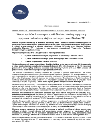Warszawa, 31 sierpnia 2015 r. Informacja prasowa Skarbiec Holding S.A. - wyniki finansowe w pierwszym półroczu 2015 roku i w roku obrotowym 2014/2015 Wzrost wyników finansowych spółki Skarbiec Holding napędzany napływami do funduszy akcji zarządzanych przez Skarbiec TFI Wzrost aktywów wynikający z dodatniej sprzedaży netto i dobrych wyników inwestycyjnych w funduszach zarządzanych przez Skarbiec TFI przełożył się na osiągnięcie wzrostów na przychodach i zyskach wypracowanych w okresie pierwszego półrocza 2015 roku przez Skarbiec Holding, właściciela Skarbiec TFI - jednego z największych, niezależnych Towarzystw Funduszy Inwestycyjnych na polskim rynku. W pierwszym półroczu 2015 r. Grupa Skarbiec Holding zanotowała: • 52,7 mln zł skonsolidowanych przychodów ze sprzedaży – wzrost o 18% r/r • 17,1 mln zł skonsolidowanego zysku operacyjnego EBIT – wzrost o 48% r/r • 13,9 mln zł zysku netto – wzrost o 50% r/r W skonsolidowanych przychodach Grupy Skarbiec Holding w pierwszym półroczu 2015, przychody z tytułu opłaty stałej za zarządzanie funduszami stanowią 37,4 mln zł (wzrost o 6% r/r), natomiast przychody z tytułu opłaty zmiennej (success fee) stanowią 11,5 mln zł i są o 100% wyższe od przychodów z opłaty zmiennej w pierwszym półroczu 2014 roku. „Na rynkach kapitałowych mieliśmy ostatnio do czynienia z dużymi zawirowaniami, ale dzięki zdywersyfikowanej geograficznie i produktowo ofercie funduszy Skarbiec TFI, wypracowaliśmy 11,5 mln zł success fee w pierwszym półroczu tego roku, co stanowi 92% całego success fee pobranego w 2014 roku. W pierwszym kwartale success fee zostało pobrane z 9 funduszy, a w drugim kwartale z 5 funduszy zarządzanych przez Skarbiec TFI. Większość success fee pochodziła z funduszy, które inwestują w aktywa za granicą” – mówi Marek Rybiec, prezes zarządu Skarbiec Holding S.A. W pierwszym półroczu 2015 r., a szczególnie w drugim kwartale, na rynkach kapitałowych przeważały trudne warunki. Jednak pomimo tego, cały czas napływają środki od nowych inwestorów, którzy szukają alternatywy dla lokat bankowych. Ponadto, coraz częściej inwestorzy przesuwają środki z funduszy dłużnych i pieniężnych do funduszy o wyższej oczekiwanej stopie zwrotu, jakimi są m.in. fundusze akcyjne. Skarbiec TFI zanotował w pierwszym półroczu tego roku wzrost napływów do funduszy akcji, mieszanych i alternatywnych. W pierwszym półroczu napływy netto (sprzedaż netto oraz konwersje) do funduszy tej klasy aktywów zarządzanych przez Skarbiec TFI wyniosły 315 mln zł i stanowiły 25% udziału w napływach do niezależnych krajowych TFI i 5,5% udziału w napływach do wszystkich TFI. „Bardzo dobrą sprzedaż w pierwszym półroczu osiągnęliśmy w funduszach inwestujących głównie w akcje zagraniczne. W obecnej sytuacji rynkowej, fundusze takie jak Skarbiec-Market Opportunities, SkarbiecSpółek Wzrostowych, Skarbiec-Top Brands czy Skarbiec III -Filar nadal powinny być bardzo atrakcyjną alternatywą dla osób szukających zysków wyższych niż lokaty” – mówi Marek Rybiec. Efektem nowych napływów, konwersji do funduszy o wyższej oczekiwanej stopie zwrotu oraz dobrych wyników inwestycyjnych jest dynamiczny wzrost aktywów w funduszach akcji i mieszanych w Skarbiec TFI. W pierwszym półroczu 2015 roku aktywa tej klasy, zarządzane przez Skarbiec TFI, wzrosły o 399 mln zł, co stanowiło wzrost o 30% w stosunku do końca grudnia 2014 r. Wartość aktywów netto pod zarządzaniem Skarbiec TFI na koniec czerwca br. wynosiła prawie 15 mld zł. Aktywa funduszy Skarbiec TFI skierowanych do szerokiego grona inwestorów wyniosły na koniec czerwca ok. 3,5 mld zł. Wyniki Grupy Skarbiec za okres 18 miesięcy zakończonych 30 czerwca 2015 roku Przechodząc do wyników finansowych Grupy Skarbiec Holding za okres od dnia 1 stycznia 2014 roku do dnia 30 czerwca 2015 roku, na wstępie należałoby podkreślić, że zmiana roku obrotowego dokonana w 2014 roku powoduje, że zaraportowany rok obrotowy, będący pierwszym po zmianie, obejmuje okres 18 miesięcy. Należy to uwzględniać przy dokonywaniu porównania do wyników finansowych wypracowanych w 2013 roku (za 12 miesięcy kalendarzowych). Wyniki osiągnięte w raportowanym roku obrotowym są bardzo dobre. Grupa Skarbiec Holding za okres 18 miesięcy od 1 stycznia 2014 roku do 30 czerwca 2015 roku wypracowała 143,8 mln zł skonsolidowanych przychodów, w tym ponad 109 mln z tytułu opłaty stałej za zarządzanie funduszami, a przychody z tytułu opłaty zmiennej stanowiły ponad 24 mln zł. Analizując wyniki operacyjne warto odnieść się do danych skorygowanych. W 2014 roku Skarbiec Holding S.A. poniósł koszty przeprowadzenia oferty publicznej oraz koszty rozliczenia długoterminowych programów motywacyjnych – w sumie było to 5,6 mln złotych. Po korekcie o tą kwotę skonsolidowany wynik operacyjny EBIT za okres 18 miesięcy od dnia 1 stycznia 2014 roku do dnia 30 czerwca 2015 roku wyniósł 45,7 mln zł, a zysk netto 37,5 mln zł. Raportowany skonsolidowany zysk operacyjny za ten okres był na poziomie 40,1 mln zł, a skonsolidowany wynik netto wyniósł 32,3 mln zł. Dywidenda Zgodnie z przyjętą w prospekcie emisyjnym polityką dywidendową – 28 sierpnia 2015 roku zarząd Spółki zarekomendował Radzie Nadzorczej oraz Walnemu Zgromadzeniu wypłatę 100% zysku wypracowanego przez Skarbiec Holding S.A. w formie dywidendy dla akcjonariuszy Spółki. Zysk netto, który może być w całości przeznaczony do wypłaty dywidendy z zysku za rok obrotowy obejmujący okres 18 miesięcy od 1 stycznia 2014 do 30 czerwca 2015 roku, wyniósł ponad 21,3 mln zł. „Przypomnę, że w poprzednich latach także wypłacaliśmy dywidendę i w przyszłości chcemy pozostać atrakcyjną spółką, dzielącą się zyskiem z akcjonariuszami. Ostateczna decyzja o wysokości dywidendy zostanie podjęta przez akcjonariuszy spółki S