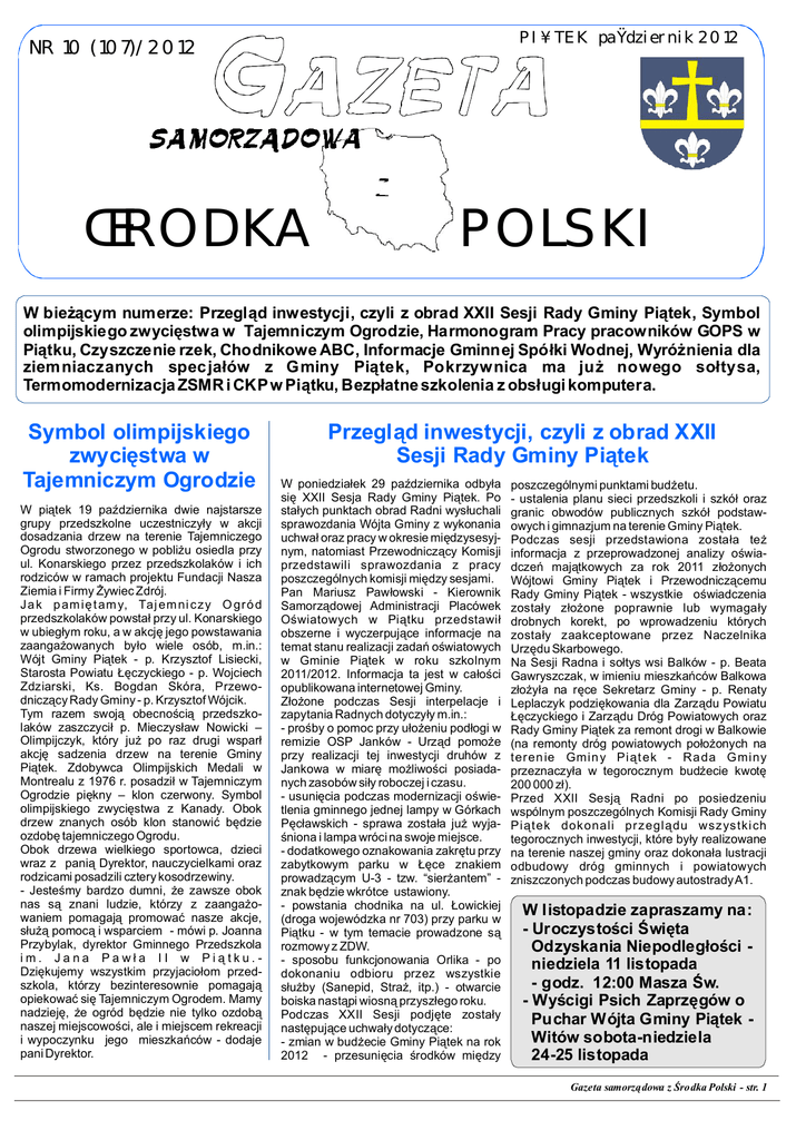 PI¥TEK paŸdziernik 2012 NR 10 (107)/2012 ŒRODKA z POLSKI W bie cym numerze: Przegl d inwestycji, czyli z obrad XXII Sesji Rady Gminy Pi tek, Symbol olimpijskiego zwyci stwa w Tajemniczym Ogrodzie, Harmonogram Pracy pracowników GOPS w Pi tku, Czyszczenie rzek, Chodnikowe ABC, Informacje Gminnej Spó ki Wodnej, Wyró nienia dla ziemniaczanych spec ja ów z Gminy Pi tek, Pokrzywnica ma ju nowego so tysa, Termomodernizacja ZSMR i CKP w Pi tku, Bezp atne szkolenia z obs ugi komputera. Symbol olimpijskiego zwyci stwa w Tajemniczym Ogrodzie W pi tek 19 pa dziernika dwie najstarsze grupy przedszkolne uczestniczy y w akcji dosadzania drzew na terenie Tajemniczego Ogrodu stworzonego w pobli u osiedla przy ul. Konarskiego przez przedszkolaków i ich rodziców w ramach projektu Fundacji Nasza Ziemia i Firmy ywiec Zdrój. Ja k p am i t am y, Taj em ni czy O gr ó d przedszkolaków powsta przy ul. Konarskiego w ubieg ym roku, a w akcj jego powstawania zaanga owanych by o wiele osób, m.in.: Wójt Gminy Pi tek - p. Krzysztof Lisiecki, Starosta Powiatu czyckiego - p. Wojciech Zdziarski, Ks. Bogdan Skóra, Przewodnicz cy Rady Gminy - p. Krzysztof Wójcik. Tym razem swoj obecno ci przedszkolaków zaszczyci p. Mieczys aw Nowicki – Olimpijczyk, który ju po raz drugi wspar akcj sadzenia drzew na terenie Gminy Pi tek. Zdobywca Olimpijskich Medali w Montrealu z 1976 r. posadzi w Tajemniczym Ogrodzie pi kny – klon czerwony. Symbol olimpijskiego zwyci stwa z Kanady. Obok drzew znanych osób klon stanowi dzie ozdob tajemniczego Ogrodu. Obok drzewa wielkiego sportowca, dzieci wraz z pani Dyrektor, nauczycielkami oraz rodzicami posadzili cztery kosodrzewiny. - Jeste my bardzo dumni, e zawsze obok nas s znani ludzie, którzy z zaanga owaniem pomagaj promowa nasze akcje, pomoc i wsparciem - mówi p. Joanna Przybylak, dyrektor Gminnego Przedszkola im. Jana Paw a II w Pi tku.Dzi kujemy wszystkim przyjacio om przedszkola, którzy bezinteresownie pomagaj opiekowa si Tajemniczym Ogrodem. Mamy nadziej e ogród b dzie nie tylko ozdob naszej miejscowo ci, ale i miejscem rekreacji i wypoczynku jego mieszka ców - dodaje pani Dyrektor. Przegl d inwestycji, czyli z obrad XXII Sesji Rady Gminy Pi tek W poniedzia ek 29 pa dziernika odby a si XXII Sesja Rady Gminy Pi tek. Po sta ych punktach obrad Radni wys uchali sprawozdania Wójta Gminy z wykonania uchwa oraz pracy w okresie mi dzysesyjnym, natomiast Przewodnicz cy Komisji przedstawili sprawozdania z pracy poszczególnych komisji mi dzy sesjami. Pan Mariusz Paw owski - Kierownik Samorz dowej Administracji Placówek wiatowych w Pi tku przedstawi obszerne i wyczerpuj ce informacje na temat stanu realizacji zada wiatowych w Gminie Pi tek w roku szkolnym 2011/2012. Informacja ta jest w ca ci opublikowana internetowej Gminy. one podczas Sesji interpelacje i zapytania Radnych dotyczy y m.in.: - pro by o pomoc przy u eniu pod ogi w remizie OSP Janków - Urz d pomo e przy realizacji tej inwestycji druhów z Jankowa w miar mo liwo ci posiadanych zasobów si y roboczej i czasu. - usuni cia podczas modernizacji o wietlenia gminnego jednej lampy w Górkach awskich - sprawa zosta a ju wyjaniona i lampa wróci na swoje miejsce. - dodatkowego oznakowania zakr tu przy zabytkowym parku w ce znakiem prowadz cym U-3 - tzw. “sier antem” znak b dzie wkrótce ustawiony. - powstania chodnika na ul. owickiej (droga wojewódzka nr 703) przy parku w Pi tku - w tym temacie prowadzone s rozmowy z ZDW. - sposobu funkcjonowania Orlika - po dokonaniu odbioru przez wszystkie by (Sanepid, Stra , itp.) - otwarcie boiska nast pi wiosn przysz ego roku. Podczas XXII Sesji podj te zosta y nast puj ce uchwa y dotycz ce: - zmian w bud ecie Gminy Pi tek na rok 2012 - przesuni cia rodków mi dzy poszczególnymi punktami bud etu. - ustalenia planu sieci przedszkoli i szkó oraz granic obwodów publicznych szkó podstawowych i gimnazjum na terenie Gminy Pi tek. Podczas sesji przedstawiona zosta a te informacja z przeprowadzonej analizy o wiadcze maj tkowych za rok 2011 z onych Wójtowi Gminy Pi tek i Przewodnicz cemu Rady Gminy Pi tek - wszystkie o wiadczenia zosta y z one poprawnie lub wymaga y drobnych korekt, po wprowadzeniu których zosta y zaakceptowane przez Naczelnika Urz du Skarbowego. Na Sesji Radna i so tys wsi Balków - p. Beata Gawryszczak, w imieniu mieszka ców Balkowa a na r ce Sekretarz Gminy - p. Renaty Leplaczyk podzi kowania dla Zarz du Powiatu czyckiego i Zarz du Dróg Powiatowych oraz Rady Gminy Pi tek za remont drogi w Balkowie (na remonty dróg powiatowych po onych na ter en ie Gmi n y Pi t ek - Ra da G miny przeznaczy a w tegorocznym bud ecie kwot 200 000 z ). Przed XXII Sesj Radni po posiedzeniu wspólnym poszczególnych Komisji Rady Gminy Pi tek dokonali pr zegl du wsz ystki ch tegorocznych inwestycji, które by y realizowane na terenie naszej gminy oraz dokona a lustracji odbudowy dróg gminnych i powiatowych zniszczonych podczas budowy autostradyA1. W listopadzie zapraszamy na: - Uroczysto ci wi ta Odzyskania Niepodleg ci niedziela 11 listopada - godz. 12:00 Masza w. - Wy cigi Psich Zaprz gów o Puchar Wójta Gminy Pi tek Witów sobota-niedziela 24-25 listopada Gazeta samorz dowa z rodka Polski - str. 1 Harmonogram pracy pracowników GOPS w Pi tku Pani Ewa B aszczyk - tel. 24 722-13-63 Godziny pracy w terenie Poniedzia ek: 07:00 - 11:00 Wtorek : 07:00 -11:00 roda: 11:00 - 15:00 Czwartek: 07:00 - 11:00 Pi tek: 11:00 - 15:00 Godziny pracy w O rodku Poniedzia ek: 11:00 - 15:00 Wtorek: 11:00 - 15:00 roda: 07:00 - 11:00 Czwartek: 11:00 - 15:00 Pi tek: 07:00 - 11:00 Pani Anna Sakiewa - tel. 24 722-13-63 Godziny pracy w terenie Poniedzia ek: 11:00 - 15:00 Wtorek: 11:00 - 15:00 roda: 07:00 - 11:00 Czwartek: 11:00 - 15:00 Pi tek: 07:00 - 11:00 Godziny pracy w O rodku Poniedzia ek: 07:00 - 11:00 Wtorek: 07:00 - 11:00 roda: 11:00 - 15:00 Czwartek: 07:00 - 11:00 Pi tek: 11:00 - 15:00 Pani Monika Kucharczyk - tel. 24722-13-63 Godziny pracy w terenie Poniedzia ek: 11:00 15:00 Wtorek: 11:00-15:0