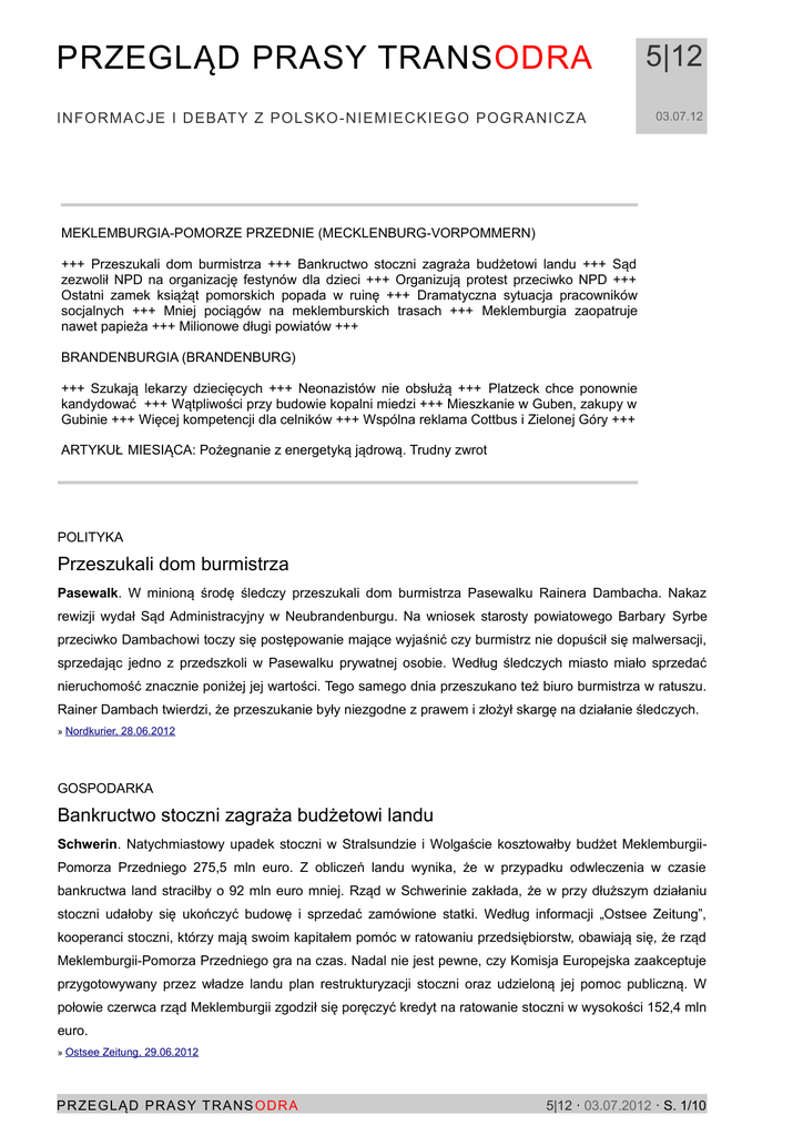 PRZEGLĄD PRASY TRANSODRA INFORMACJE I DEBAT Y Z POLSKO-NIEMIECKIEGO POGRANICZA 5|12 03.07.12 MEKLEMBURGIA-POMORZE PRZEDNIE (MECKLENBURG-VORPOMMERN) +++ Przeszukali dom burmistrza +++ Bankructwo stoczni zagraża budżetowi landu +++ Sąd zezwolił NPD na organizację festynów dla dzieci +++ Organizują protest przeciwko NPD +++ Ostatni zamek książąt pomorskich popada w ruinę +++ Dramatyczna sytuacja pracowników socjalnych +++ Mniej pociągów na meklemburskich trasach +++ Meklemburgia zaopatruje nawet papieża +++ Milionowe długi powiatów +++ BRANDENBURGIA (BRANDENBURG) +++ Szukają lekarzy dziecięcych +++ Neonazistów nie obsłużą +++ Platzeck chce ponownie kandydować +++ Wątpliwości przy budowie kopalni miedzi +++ Mieszkanie w Guben, zakupy w Gubinie +++ Więcej kompetencji dla celników +++ Wspólna reklama Cottbus i Zielonej Góry +++ ARTYKUŁ MIESIĄCA: Pożegnanie z energetyką jądrową. Trudny zwrot POLITYKA Przeszukali dom burmistrza Pasewalk. W minioną środę śledczy przeszukali dom burmistrza Pasewalku Rainera Dambacha. Nakaz rewizji wydał Sąd Administracyjny w Neubrandenburgu. Na wniosek starosty powiatowego Barbary Syrbe przeciwko Dambachowi toczy się postępowanie mające wyjaśnić czy burmistrz nie dopuścił się malwersacji, sprzedając jedno z przedszkoli w Pasewalku prywatnej osobie. Według śledczych miasto miało sprzedać nieruchomość znacznie poniżej jej wartości. Tego samego dnia przeszukano też biuro burmistrza w ratuszu. Rainer Dambach twierdzi, że przeszukanie były niezgodne z prawem i złożył skargę na działanie śledczych. » Nordkurier, 28.06.2012 GOSPODARKA Bankructwo stoczni zagraża budżetowi landu Schwerin. Natychmiastowy upadek stoczni w Stralsundzie i Wolgaście kosztowałby budżet MeklemburgiiPomorza Przedniego 275,5 mln euro. Z obliczeń landu wynika, że w przypadku odwleczenia w czasie bankructwa land straciłby o 92 mln euro mniej. Rząd w Schwerinie zakłada, że w przy dłuższym działaniu stoczni udałoby się ukończyć budowę i sprzedać zamówione statki. Według informacji „Ostsee Zeitung”, kooperanci stoczni, którzy mają swoim kapitałem pomóc w ratowaniu przedsiębiorstw, obawiają się, że rząd Meklemburgii-Pomorza Przedniego gra na czas. Nadal nie jest pewne, czy Komisja Europejska zaakceptuje przygotowywany przez władze landu plan restrukturyzacji stoczni oraz udzieloną jej pomoc publiczną. W połowie czerwca rząd Meklemburgii zgodził się poręczyć kredyt na ratowanie stoczni w wysokości 152,4 mln euro. » Ostsee Zeitung, 29.06.2012 P RZE G LĄ D P RA S Y T RA NS O DRA 5|12 · 03.07.2012 · S. 1/10 PRZEGLĄD PRASY TRANSODRA INFORMACJE I DEBAT Y Z POLSKO-NIEMIECKIEGO POGRANICZA 5|12 03.07.12 PRAWICOWY EKSTREMIZM Sąd zezwolił NPD na organizację festynów dla dzieci Ueckermünde. Neonazistowska partia NPD może organizować festyny dziecięce – orzekł Sąd Administracyjny w Greifswaldzie. Wcześniej organizacji festynu zakazała burzmistrz Ueckermünde Heidi Michaelis. W uzasadnieniu swojej decyzji burmistrz napisała: „Miasto Ueckermünde nie zezwala, by miejski park (Ueckerpark) był miejscem imprez szerzących narodowo-socjalistyczą ideologię. Poglądy NPD nie są odpowiednie dla dzieci”. Prawicowi ekstremiści zaskarżyli jednak jej decyzję do sądu, którz przyznał im rację i nakazał miastu zezwolić NPD na organizację festynów. Decyzja sądu po raz kolejny pokazuje, że nie ma podstaw prawnych do zakazania tego typu imprez. Miasto Ueckermünde osiągnęło jednak połowiczny sukces: NPD nie wystarczyło czasu, by zorganizować festyn w przewidzianym terminie. Neonaziści zapowiadają jednak, że jeszcze tego lata zorganizują w miasteczku imprezę dla dzieci. » Nordkurier, 30.06.2012 » Festyn NPD w Ueckermünde, Fot. Monika Stefanek PRAWICOWY EKSTREMIZM Organizują protest przeciwko NPD Pasewalk. 5 lipca o godz. 15.30 odbędzie się w Pasewalku na terenie dawnej lokomotywowni (Lokschuppe) pierwsze spotkanie dla osób, które chcą dołączyć do protestu przeciwko zjazdowi sympatyków partii NPD. Organizowany przez neonazistowską gazetę „Deutsche Stimme” festyn prasowy odbędzie się 10 i 11 sierpnia pod Pasewalkiem. W mieście zawiązała się przed tygodniem koalicja różnych organizacji, które chcą wspólnie protestować przeciwko imprezie. Organizatorzy protestu zamierzają poprosić o wsparcie także stronę polską. » Nordkurier, 30.06.2012 SŁUŻBA ZDROWIA Dramatyczna sytuacja pracowników socjalnych Wismar/Greifswald. W całej Meklemburgii-Pomorzu Przednim protestują przeciwko obniżce płac opiekunki osób chorych i starszych. Trzy państwowe kasy chorych zamierzają obniżyć godzinną stawkę z 4,61 na 3,72 euro. Dla porównania opiekunki w Bawarii, Hambugu oraz Badenii-Wirtembergii otrzymują o 100 procent wyższe wynagrodzenie niż w Meklemburgii. „Niższe płace odstraszają wykwalifikowanych specjalistów”, powiedziała na łamach Nordkuriera Marlis Fromm ze związku Samarytanów w Bad Kleinen. Także „Ostsee Zeitung” donosi o trudnej sytuacji opiekunek. Według informacji gazety, ponad 750 opiekunek musi pobierać P RZE G LĄ D P RA S Y T RA NS O DRA 5|12 · 03.07.2012 · S. 2/10 PRZEGLĄD PRASY TRANSODRA INFORMACJE I DEBAT Y Z POLSKO-NIEMIECKIEGO POGRANICZA 5|12 03.07.12 zasiłek z urzędu pracy podobny do tego, który jest wypłacany bezrobotnym, ponieważ nie jest w stanie utrzymać się z pensji. Opiekunki z Meklemburgii zapowiadają podjęcie krokόw prawnych przeciwko kasom chorym. » Nordkurier, 27.06.2012 » Ostsee Zeitung, 26.06.2012 ZABYTKI Ostatni Zamek Książąt Pomorskich popada w ruinę Ludwigsburg. 13 milionów euro potrzeba, by wyremontować Zamek Książąt Pomorskich oraz przynależny do niego ogród. Obiekt w Ludwigsburgu jest ostatnim na terenie Niemiec zachowanym w całości zamkiem pomorskich władców. Deklaracje landu o pomocy finansowej kończą się do tej pory na słowach. O zachowanie zabytku walc