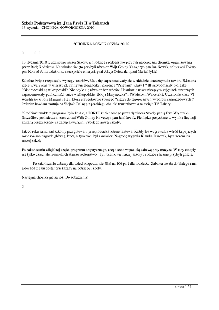 Szkoła Podstawowa im. Jana Pawła II w Tokarach 16 stycznia - CHOINKA NOWOROCZNA 2010 ?CHOINKA NOWOROCZNA 2010? 16 stycznia 2010 r. uczniowie naszej Szkoły, ich rodzice i rodzeństwo przybyli na coroczną choinkę, organizowaną przez Radę Rodziców. Na szkolne święto przybyli również Wójt Gminy Kawęczyn pan Jan Nowak, sołtys wsi Tokary pan Konrad Ambroziak oraz nauczyciele emeryci: pani Alicja Osiewała i pani Maria Nykiel. Szkolne święto rozpoczęły występy uczniów. Maluchy zaprezentowały się w układzie tanecznym do utworu ?Most na rzece Kwai? oraz w wierszu pt. ?Pingwin elegancik? i piosence ?Pingwin?. Klasy I ? III przypomniały piosenkę ?Biedroneczki są w kropeczki?. Nie obyło się również bez tańców. Uczniowie uczestniczący w zajęciach tanecznych zaprezentowały publiczności tańce wielkopolskie: ?Moja Maryneczka? i ?Wisielok i Walcerek?. Uczniowie klasy VI wcielili się w role Mariana i Heli, która przygotowuje swojego ?męża? do tegorocznych wyborów samorządowych ? ?Marian bowiem startuje na Wójta?. Relację z przebiegu choinki transmitowała telewizja TV Tokary. ?Słodkim? punktem programu była licytacja TORTU (upieczonego przez dyrektora Szkoły panią Ewę Wojtczak). Szczęśliwy posiadaczem tortu został Wójt Gminy Kawęczyn pan Jan Nowak. Pieniądze pozyskane w wyniku licytacji zostaną przeznaczone na zakup akwarium i rybek do nowej szkoły. Jak co roku samorząd szkolny przygotował i przeprowadził loterię fantową. Każdy los wygrywał, a wśród kupujących rozlosowano nagrodę główną, którą w tym roku był sandwicz. Nagrodę wygrała Klaudia Jaszczak, była uczennica naszej szkoły. Po zakończeniu oficjalnej części programu artystycznego, rozpoczęto wspaniałą zabawę przy muzyce. W tany ruszyły nie tylko dzieci ale również ich starsze rodzeństwo ( byli uczniowie naszej szkoły), rodzice i licznie przybyli goście. Po zakończeniu zabawy dla dzieci rozpoczął się ?Bal na 100 par? dla rodziców. Zabawa trwała do białego rana, a dochód z balu został przekazany na potrzeby szkoły. Następna choinka już za rok. Do zobaczenia! strona 1 / 1