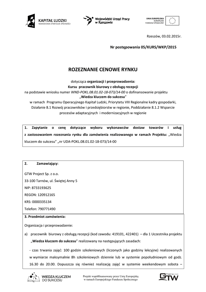 Rzeszów, 03.02.2015r. Nr postępowania 05/KURS/WKP/2015 ROZEZNANIE CENOWE RYNKU dotycząca organizacji i przeprowadzenia: Kursu pracownik biurowy z obsługą recepcji na podstawie wniosku numer WND-POKL.08.01.02-18-073/14-00 o dofinansowanie projektu „Wiedza kluczem do sukcesu” w ramach Programu Operacyjnego Kapitał Ludzki, Priorytetu VIII Regionalne kadry gospodarki, Działanie 8.1 Rozwój pracowników i przedsiębiorstw w regionie, Poddziałanie 8.1.2 Wsparcie procesów adaptacyjnych i modernizacyjnych w regionie 1. Zapytanie o cenę dotyczące wyboru wykonawców dostaw towarów i usług z zastosowaniem rozeznania rynku dla zamówienia realizowanego w ramach Projektu: „Wiedza kluczem do sukcesu” „nr UDA-POKL.08.01.02-18-073/14-00 2. Zamawiający: GTW Project Sp. z o.o. 33-100 Tarnów, ul. Świętej Anny 5 NIP: 8733193625 REGON: 120912165 KRS: 0000335134 Telefon: 790771490 3. Przedmiot zamówienia: Organizacja i przeprowadzenie: a) pracownik biurowy z obsługą recepcji (kod zawodu: 419101, 422401) – dla 1 Uczestnika projektu „Wiedza kluczem do sukcesu” realizowany na następujących zasadach: - czas trwania zajęć: 100 godzin szkoleniowych (liczonych jako godziny lekcyjne) realizowanych w wymiarze maksymalnie 8h szkoleniowych dziennie lub w systemie popołudniowym od godz. 16.30 do 20.00. Dopuszcza się również realizację zajęć w systemie weekendowym sobota – Projekt współfinansowany przez Unię Europejską w ramach Europejskiego Funduszu Społecznego niedziela w wymiarze 8h szkoleniowych dziennie, - 1 grupa licząca 1 osobę, - realizacja: między 16.02.2015 a 31.03.2015 (wstępny termin, który może ulec zmianie w momencie podpisywania umowy dotyczącej realizacji szkolenia, za zgodą obu stron) - prowadzone przez trenera posiadającego odpowiednie adekwatne do prowadzonego szkolenia, doświadczenie/wykształcenie (wyłoniony wykonawca zostanie poproszony o dostarczenie CV trenerów przed podpisaniem umowy), - proponowana tematyka powinna obejmować m.in.: podstawy działania biura, organizacja pracy biurowej w recepcji, wyposażenie i urządzenia biurowe, organizacja obiegu dokumentów, przyjmowanie i ewidencjowanie korespondencji, archiwizacja dokumentów, klasyfikacja dokumentów i systemy przechowywania akt, techniki przygotowywania dokumentów biurowych, lub inne zaproponowane przez Wykonawcę. Wybrany wykonawca będzie zobowiązany do dołączenia programu szkolenia do umowy dotyczącej jego realizacji. - zapewnienie sali multimedialnej – komputer (z zainstalowanym odpowiednim oprogramowaniem, tj. np. Microsoft Office) dla 1 uczestnika kursu, na zajęcia praktyczne, - zapewnienie sali szkoleniowej, cateringu (w postaci obiadu, kawa/herbata) i materiałów szkoleniowych (np. notatniki, długopisy, skrypt/ prezentacja multimedialna/ książka tematyczna, etc.) dla kierowanego uczestnika, - wydania certyfikatów/zaświadczeń potwierdzających uzyskanie kwalifikacji zawodowych po zakończeniu realizacji szkolenia dla uczestnika/czki, którego frekwencja wynosiła minimum 80%, - prowadzenia dziennika zajęć, zgodnie ze wzorem udostępnionym przez Zamawiającego, - przeprowadzenie egzaminu po zakończeniu szkolenia oraz dostarczenie Zamawiającemu protokołu z egzaminu. 4. Informacje ogólne: Projekt „Wiedza kluczem do sukcesu” jest skierowany do osób pochodzących z województwa podkarpackiego, pracujących w Instytucjach Sektora Oświaty, które zostały zwolnione lub są na wypowiedzeniu. Zakres zadań i obowiązków: Projekt współfinansowany przez Unię Europejską w ramach Europejskiego Funduszu Społecznego - organizacja i przeprowadzanie szkolenia dla 1 osoby pt. „Kurs pracownik biurowy z obsługa recepcji”, trwającego 100 godzin szkoleniowych, realizowanego w terminie między 16.02.2015 a 31.03.2015 r. 5. Kryteria dostępu (opis warunków koniecznych do spełnienia przez Oferentów): 5.1 Potencjał kadrowy – posiadania min. 1 osoby z wykształceniem i wiedzą w przedmiotowym zakresie oraz min. rocznym doświadczeniem zawodowym w przedmiotowym zakresie (wybrany Wykonawca zostanie poproszony o przedstawienie dokumentów potwierdzających spełnienie wymagania), 5.2 Doświadczenie – doświadczenie w zakresie realizacji min. 200h szkoleń zawodowych/kursów w ciągu ostatnich 12 miesięcy (wybrany Wykonawca zostanie poproszony o przedstawienie dokumentów potwierdzających spełnienie wymagania), 5.3 Potencjał techniczny – posiada podstawowe narzędzia pracy trenera do przeprowadzenia tego typu zajęć np. rzutnik, komputery dla każdego Uczestnika, flipchart itp. 5.4 Dyspozycyjność - możliwość wykonania usługi w wyznaczonym terminie, który podany zostanie nie później niż na 3 dni roboczych przed realizacją usługi. 6. Kryteria wyboru oferty: 100% cena W ofercie należy podać całościową stawkę wynagrodzenia brutto za Uczestnika projektu za wykonywanie usług wskazanych w punkcie 3 niniejszego rozeznania rynku. 7. Wymagania dotyczące przygotowania oferty: 7.1 Ofertę należy złożyć na druku „OFERTA”, którego wzór stanowi załącznik nr 1 do niniejszego rozeznania rynku. 7.2 Ofertę należy sporządzić w języku polskim, w formie pisemnej, na maszynie, komputerze lub nieścieralnym atramentem / długopisem. 7.3 Oferta musi zostać przesłana poczta elektroniczną lub dostarczona w wersji papierowej w terminie opisanym w punkcie 8 niniejszego rozeznania rynku. 7.4 Do oferty należy załączyć następujące dokumenty: Projekt współfinansowany przez Unię Europejską w ramach Europejskiego Funduszu Społecznego Referencje / ksero umowy potwierdzającej doświadczenie w zakresie realizacji zadań opisanych w punkcie 5.2 niniejszego rozeznania rynku. 7.5 Oferta musi zostać podpisana przez Wykonawcę. 8. Wymagania dotyczące miejsca, terminu i formy złożenia oferty: Oferta powinna zostać przesłana na adres: [email protected] lub złożona w Biurze Projektu, ul. Trembeckiego 11 A, pokój 305, 35-234 Rze
