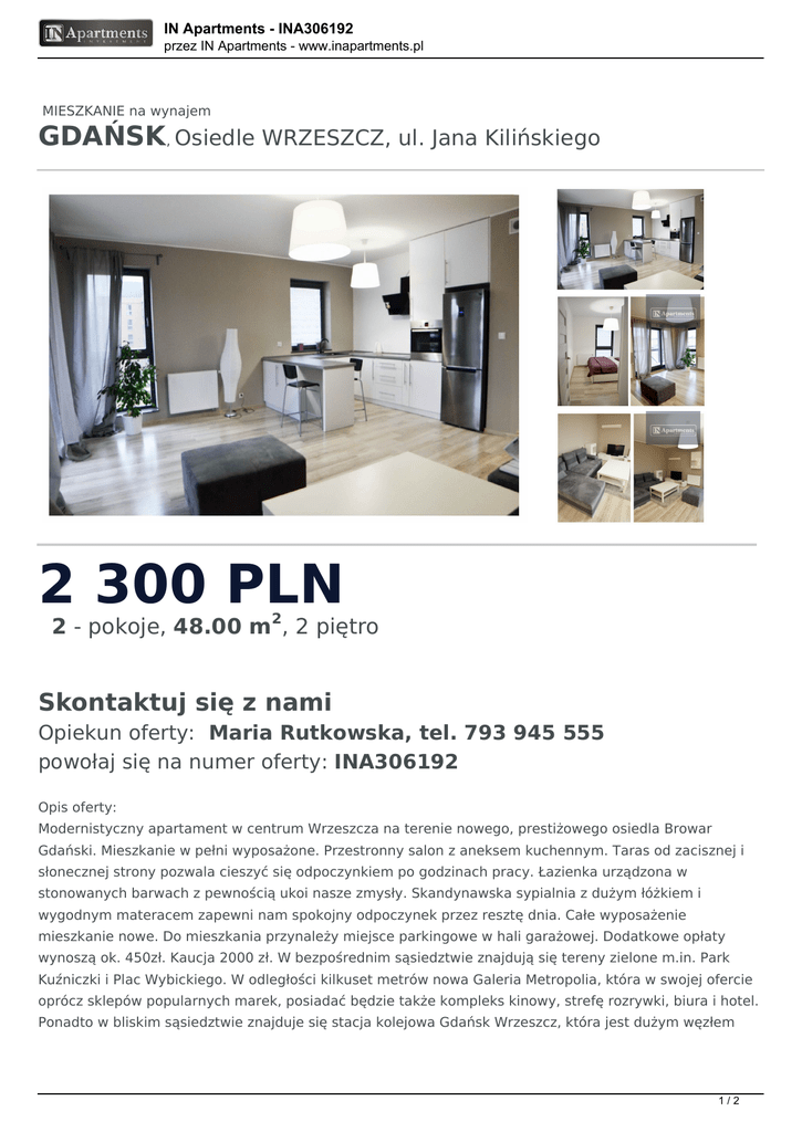 IN Apartments - INA306192 przez IN Apartments - www.inapartments.pl MIESZKANIE na wynajem GDAŃSK, Osiedle WRZESZCZ, ul. Jana Kilińskiego 2 300 PLN 2 - pokoje, 48.00 m2, 2 piętro Skontaktuj się z nami Opiekun oferty: Maria Rutkowska, tel. 793 945 555 powołaj się na numer oferty: INA306192 Opis oferty: Modernistyczny apartament w centrum Wrzeszcza na terenie nowego, prestiżowego osiedla Browar Gdański. Mieszkanie w pełni wyposażone. Przestronny salon z aneksem kuchennym. Taras od zacisznej i słonecznej strony pozwala cieszyć się odpoczynkiem po godzinach pracy. Łazienka urządzona w stonowanych barwach z pewnością ukoi nasze zmysły. Skandynawska sypialnia z dużym łóżkiem i wygodnym materacem zapewni nam spokojny odpoczynek przez resztę dnia. Całe wyposażenie mieszkanie nowe. Do mieszkania przynależy miejsce parkingowe w hali garażowej. Dodatkowe opłaty wynoszą ok. 450zł. Kaucja 2000 zł. W bezpośrednim sąsiedztwie znajdują się tereny zielone m.in. Park Kuźniczki i Plac Wybickiego. W odległości kilkuset metrów nowa Galeria Metropolia, która w swojej ofercie oprócz sklepów popularnych marek, posiadać będzie także kompleks kinowy, strefę rozrywki, biura i hotel. Ponadto w bliskim sąsiedztwie znajduje się stacja kolejowa Gdańsk Wrzeszcz, która jest dużym węzłem 1/2 IN Apartments - INA306192 przez IN Apartments - www.inapartments.pl przesiadkowym dla całego Trójmiasta łączącym w sobie SKM, PKP i PKM. Dodatkowo lokalizacja osiedla w sercu Wrzeszcza gwarantuje łatwe dotarcie do obiektów kulturalnych, czy rozrywki, a także zapewnia doskonałe skomunikowanie z całą Metropolią Trójmiejską. Idealna oferta dla osób ceniących sobie wygodę i czas. Znakomicie odnajdą się tu osoby, które pragną korzystać ze wszystkich dobrodziejstw jakie niesie centrum miasta. Mieszkanie wolne od zaraz. 2/2 Powered by TCPDF (www.tcpdf.org)