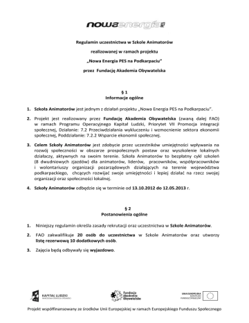 Regulamin uczestnictwa w Szkole Animatorów realizowanej w ramach projektu „Nowa Energia PES na Podkarpaciu” przez Fundację Akademia Obywatelska §1 Informacje ogólne 1. Szkoła Animatorów jest jednym z działań projektu „Nowa Energia PES na Podkarpaciu”. 2. Projekt jest realizowany przez Fundację Akademia Obywatelska (zwaną dalej FAO) w ramach Programu Operacyjnego Kapitał Ludzki, Priorytet VII Promocja integracji społecznej, Działanie: 7.2 Przeciwdziałania wykluczeniu i wzmocnienie sektora ekonomii społecznej, Poddziałanie: 7.2.2 Wsparcie ekonomii społecznej. 3. Celem Szkoły Animatorów jest zdobycie przez uczestników umiejętności wpływania na rozwój społeczności w obszarze prospołecznych postaw oraz wyszkolenie lokalnych działaczy, aktywnych na swoim terenie. Szkoła Animatorów to bezpłatny cykl szkoleń (8 dwudniowych zjazdów) dla animatorów, liderów, pracowników, współpracowników i wolontariuszy organizacji pozarządowych działających na terenie województwa podkarpackiego, chcących rozwijać swoje umiejętności i lepiej działać na rzecz swojej organizacji oraz społeczności lokalnej. 4. Szkoły Animatorów odbędzie się w terminie od 13.10.2012 do 12.05.2013 r. §2 Postanowienia ogólne 1. Niniejszy regulamin określa zasady rekrutacji oraz uczestnictwa w Szkole Animatorów. 2. FAO zakwalifikuje 20 osób do uczestnictwa w Szkole Animatorów oraz utworzy listę rezerwową 10 dodatkowych osób. 3. Zajęcia będą odbywały się wyjazdowo. Projekt współfinansowany ze środków Unii Europejskiej w ramach Europejskiego Funduszu Społecznego §3 Kryteria formalne 1. W Szkole Animatorów uczestniczyć mogą osoby: pełnoletnie, zamieszkałe (wg. Kodeksu Cywilnego) na terenie województwa podkarpackiego, pracujące lub współpracujące z organizacjami pozarządowymi, działającymi na terenie województwa podkarpackiego, które chcą uzyskać umiejętność podnoszenia poziomu aktywności społeczności lokalnych oraz zarządzania własnym potencjałem. 2. Warunkiem uczestnictwa w rekrutacji do Szkoły Animatorów jest złożenie kompletu dokumentów, określonych w §3 pkt.3 regulaminu uczestnictwa w Szkole Animatorów. 3. Osoby chcące uczestniczyć w Szkole Animatorów są zobowiązane do złożenie kompletu dokumentów: a) formularz zgłoszeniowy organizacji do projektu (załącznik nr 3 do regulaminu uczestnictwa w projekcie); b) formularz zgłoszeniowy osoby do projektu (załącznik nr 4 regulaminu uczestnictwa w projekcie); c) formularz zgłoszeniowy do Szkoły Animatorów (załącznik nr 6 uczestnictwa w projekcie); d) List polecający z organizacji pozarządowej, z którą współpracują; e) CV; f) Wydrukowany regulamin z podpisem i adnotacją o zapoznaniu z jego treścią i akceptacji jego postanowień. 4. Przyjęcie kompletu dokumentów stanowi zakończenie weryfikacji formalnej i nie jest równoznaczne z zakwalifikowaniem się do udziału w Szkole Animatorów. 5. Po złożeniu kompletu dokumentów uczestnik zostanie zaproszony pocztą elektroniczną lub telefonicznie na rozmowy rekrutacyjne, które odbędą się w dniach 26 – 27.09.2012 r. w biurze projektu, które mieści się w Rzeszowie, przy ul. Hetmańskiej 4/12. 6. Za moment zgłoszenia kandydata przyjmuje się dzień, w którym złożył wszystkie wymagane regulaminem dokumenty. Będą one przyjmowane do 19.09.2012 r. do godziny 16.00. 7. Za rekrutację odpowiedzialni są pracownicy merytoryczni projektu: specjalista ds. promocji i rekrutacji, specjalista ds. organizacji i prowadzenia szkoleń oraz doradztwa wraz z Opiekunami ITS stosownie do miejsca zamieszkania zgłaszającego. 8. Uczestnicy zostaną wybrani podczas otwartego naboru. Po spełnieniu kryteriów formalnych odbędzie się rozmowa kwalifikacyjna - badająca motywację i doświadczenie. Rozmowa zostanie przeprowadzona przez powołaną Komisję, która będzie punktować Projekt współfinansowany ze środków Unii Europejskiej w ramach Europejskiego Funduszu Społecznego poszczególne pytania. Wybrane zostaną osoby z najwyższą liczbą punktów. 9. Decyzję ostateczną o przyjęciu do Szkoły Animatorów podejmie Koordynator na podstawie złożonych dokumentów oraz protokołu z obrad Komisji po przeprowadzonych rozmowach rekrutacyjnych. 10. Wyniki naboru zostaną ogłoszone do 01.10.2012 r. Umowa z uczestnikami zostanie podpisana w dniu 05.10.2012 r. w biurze projektu - Rzeszów, ul. Hetmańskiej 4/9 i 11. §4 Monitoring uczestników projektu 1. Uczestnicy projektu zobowiązani są do rzetelnego wypełniania wszelkich dokumentów monitoringowych i ewaluacyjnych. 2. Uczestnik zobowiązuje się podać dane niezbędne do wypełnienia kwestionariuszy ewaluacyjnych oraz poinformować o wszelkich zmianach dotyczących powyższych danych w ciągu 7 dni od ich zaistnienia. 3. Uczestnik oświadcza, że wyraża zgodę na przetwarzanie swoich danych osobowych dla celów związanych z realizacją Projektu. §5 Postanowienia końcowe 1. 2. 3. 4. Sprawy nie uregulowane niniejszym Regulaminem wymagają formy pisemnej. Regulamin obowiązuje przez cały okres realizacji Projektu. Niniejszy Regulamin wchodzi w życie z dniem ogłoszenia. Projektodawca zastrzega sobie prawo jednostronnego wprowadzenia zmian w niniejszym regulaminie. 5. Projektodawca zastrzega sobie prawo zaprzestania realizacji Projektu w razie rozwiązania umowy o dofinansowanie z WUP. 6. W przypadku o którym mowa w pkt 4 i 5 Uczestnikom nie przysługuje żadne roszczenie wobec Projektodawcy. 7. Aktualna treść regulaminu dostępna jest w Biurze Projektu, Inkubatorach Trzeciego Sektora działających w ramach projektu Nowa Energia PES na Podkarpaciu oraz na stronie internetowej projektu www.energiango.pl. Projekt współfinansowany ze środków Unii Europejskiej w ramach Europejskiego Funduszu Społecznego