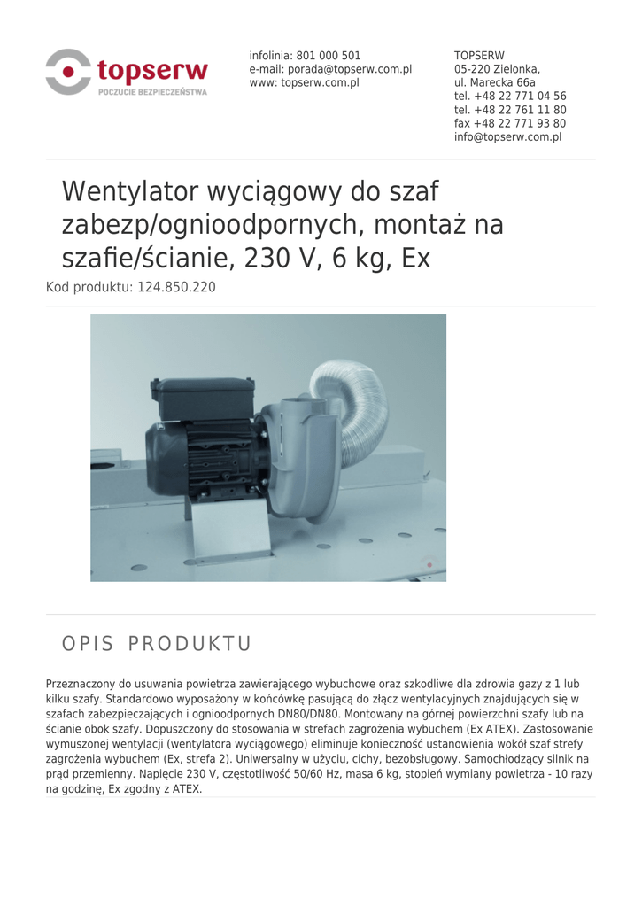 infolinia: 801 000 501 e-mail: [email protected] www: topserw.com.pl TOPSERW 05-220 Zielonka, ul. Marecka 66a tel. +48 22 771 04 56 tel. +48 22 761 11 80 fax +48 22 771 93 80 [email protected] Wentylator wyciągowy do szaf zabezp/ognioodpornych, montaż na szafie/ścianie, 230 V, 6 kg, Ex Kod produktu: 124.850.220 OPIS PRODUKTU Przeznaczony do usuwania powietrza zawierającego wybuchowe oraz szkodliwe dla zdrowia gazy z 1 lub kilku szafy. Standardowo wyposażony w końcówkę pasującą do złącz wentylacyjnych znajdujących się w szafach zabezpieczających i ognioodpornych DN80/DN80. Montowany na górnej powierzchni szafy lub na ścianie obok szafy. Dopuszczony do stosowania w strefach zagrożenia wybuchem (Ex ATEX). Zastosowanie wymuszonej wentylacji (wentylatora wyciągowego) eliminuje konieczność ustanowienia wokół szaf strefy zagrożenia wybuchem (Ex, strefa 2). Uniwersalny w użyciu, cichy, bezobsługowy. Samochłodzący silnik na prąd przemienny. Napięcie 230 V, częstotliwość 50/60 Hz, masa 6 kg, stopień wymiany powietrza - 10 razy na godzinę, Ex zgodny z ATEX. DANE TECHNICZNE