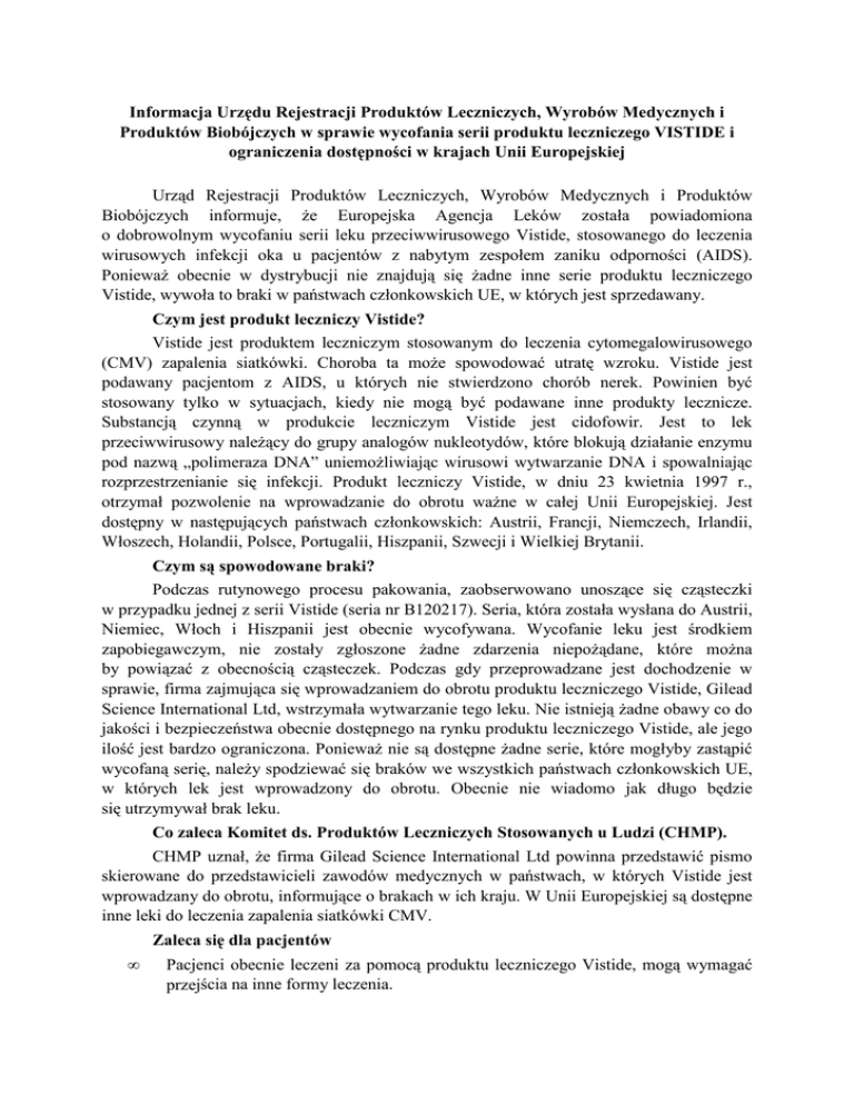 Informacja Urzędu Rejestracji Produktów Leczniczych, Wyrobów Medycznych i Produktów Biobójczych w sprawie wycofania serii produktu leczniczego VISTIDE i ograniczenia dostępności w krajach Unii Europejskiej Urząd Rejestracji Produktów Leczniczych, Wyrobów Medycznych i Produktów Biobójczych informuje, że Europejska Agencja Leków została powiadomiona o dobrowolnym wycofaniu serii leku przeciwwirusowego Vistide, stosowanego do leczenia wirusowych infekcji oka u pacjentów z nabytym zespołem zaniku odporności (AIDS). Ponieważ obecnie w dystrybucji nie znajdują się żadne inne serie produktu leczniczego Vistide, wywoła to braki w państwach członkowskich UE, w których jest sprzedawany. Czym jest produkt leczniczy Vistide? Vistide jest produktem leczniczym stosowanym do leczenia cytomegalowirusowego (CMV) zapalenia siatkówki. Choroba ta może spowodować utratę wzroku. Vistide jest podawany pacjentom z AIDS, u których nie stwierdzono chorób nerek. Powinien być stosowany tylko w sytuacjach, kiedy nie mogą być podawane inne produkty lecznicze. Substancją czynną w produkcie leczniczym Vistide jest cidofowir. Jest to lek przeciwwirusowy należący do grupy analogów nukleotydów, które blokują działanie enzymu pod nazwą „polimeraza DNA” uniemożliwiając wirusowi wytwarzanie DNA i spowalniając rozprzestrzenianie się infekcji. Produkt leczniczy Vistide, w dniu 23 kwietnia 1997 r., otrzymał pozwolenie na wprowadzanie do obrotu ważne w całej Unii Europejskiej. Jest dostępny w następujących państwach członkowskich: Austrii, Francji, Niemczech, Irlandii, Włoszech, Holandii, Polsce, Portugalii, Hiszpanii, Szwecji i Wielkiej Brytanii. Czym są spowodowane braki? Podczas rutynowego procesu pakowania, zaobserwowano unoszące się cząsteczki w przypadku jednej z serii Vistide (seria nr B120217). Seria, która została wysłana do Austrii, Niemiec, Włoch i Hiszpanii jest obecnie wycofywana. Wycofanie leku jest środkiem zapobiegawczym, nie zostały zgłoszone żadne zdarzenia niepożądane, które można by powiązać z obecnością cząsteczek. Podczas gdy przeprowadzane jest dochodzenie w sprawie, firma zajmująca się wprowadzaniem do obrotu produktu leczniczego Vistide, Gilead Science International Ltd, wstrzymała wytwarzanie tego leku. Nie istnieją żadne obawy co do jakości i bezpieczeństwa obecnie dostępnego na rynku produktu leczniczego Vistide, ale jego ilość jest bardzo ograniczona. Ponieważ nie są dostępne żadne serie, które mogłyby zastąpić wycofaną serię, należy spodziewać się braków we wszystkich państwach członkowskich UE, w których lek jest wprowadzony do obrotu. Obecnie nie wiadomo jak długo będzie się utrzymywał brak leku. Co zaleca Komitet ds. Produktów Leczniczych Stosowanych u Ludzi (CHMP). CHMP uznał, że firma Gilead Science International Ltd powinna przedstawić pismo skierowane do przedstawicieli zawodów medycznych w państwach, w których Vistide jest wprowadzany do obrotu, informujące o brakach w ich kraju. W Unii Europejskiej są dostępne inne leki do leczenia zapalenia siatkówki CMV. Zaleca się dla pacjentów • Pacjenci obecnie leczeni za pomocą produktu leczniczego Vistide, mogą wymagać przejścia na inne formy leczenia. • W czasie trwania braków lekarz prowadzący zadecyduje o wyborze innego leczenia dla indywidualnych pacjentów. • W przypadku pytań, pacjenci powinni zgłosić się do swojego lekarza lub farmaceuty. Zalecenia dla lekarzy • Przedstawiciele zawodów medycznych otrzymują informacje o brakach produktu leczniczego Vistide w ich kraju. • Wszystkie potencjalne symptomy, jakich może doświadczyć pacjent, należy zgłaszać właściwym urzędom narodowym oraz powinny być one leczone zgodnie ze standardową praktyką medyczną.