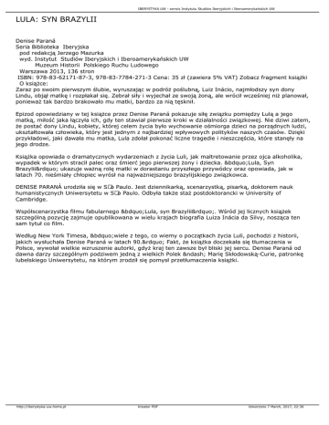 IBERYSTYKA UW - serwis Instytutu Studiów Iberyjskich i Iberoamerykańskich UW LULA: SYN BRAZYLII Denise Paraná Seria Biblioteka Iberyjska pod redakcją Jerzego Mazurka wyd. Instytut Studiów Iberyjskich i Iberoamerykańskich UW Muzeum Historii Polskiego Ruchu Ludowego Warszawa 2013, 136 stron ISBN: 978-83-62171-87-3, 978-83-7784-271-3 Cena: 35 zł (zawiera 5% VAT) Zobacz fragment książki O książce: Zaraz po swoim pierwszym ślubie, wyruszając w podróż poślubną, Luiz Inácio, najmłodszy syn dony Lindu, objął matkę i rozpłakał się. Zebrał siły i wyjechał ze swoją żoną, ale wrócił wcześniej niż planował, ponieważ tak bardzo brakowało mu matki, bardzo za nią tęsknił. Epizod opowiedziany w tej książce przez Denise Paraná pokazuje siłę związku pomiędzy Lulą a jego matką, miłość jaka łączyła ich, gdy ten stawiał pierwsze kroki w działalności związkowej. Nie dziwi zatem, że postać dony Lindu, kobiety, której celem życia było wychowanie ośmiorga dzieci na porządnych ludzi, ukształtowała człowieka, który jest jednym z najbardziej wpływowych polityków naszych czasów. Dzięki przykładowi, jaki dawała mu matka, Lula zdołał pokonać liczne tragedie i nieszczęścia, które stanęły na jego drodze. Książka opowiada o dramatycznych wydarzeniach z życia Luli, jak maltretowanie przez ojca alkoholika, wypadek w którym stracił palec oraz śmierć jego pierwszej żony i dziecka. „Lula, Syn Brazylii” ukazuje ważną rolę matki w dorastaniu przyszłego przywódcy oraz opowiada, jak w latach 70. nieśmiały chłopiec wyrósł na najważniejszego brazylijskiego związkowca. DENISE PARANÁ urodziła się w São Paulo. Jest dziennikarką, scenarzystką, pisarką, doktorem nauk humanistycznych Uniwersytetu w São Paulo. Odbyła także staż postdoktorancki w University of Cambridge. Współscenarzystka filmu fabularnego „Lula, syn Brazylii”. Wśród jej licznych książek szczególną pozycję zajmuje opublikowana w wielu krajach biografia Luiza Inácia da Silvy, nosząca ten sam tytuł co film. Według New York Timesa, „wiele z tego, co wiemy o początkach życia Luli, pochodzi z historii, jakich wysłuchała Denise Paraná w latach 90.” Fakt, że książka doczekała się tłumaczenia w Polsce, wywołał wielkie wzruszenie autorki, gdyż kraj ten zawsze był bliski jej sercu. Denise Paraná od dawna darzy szczególnym podziwem jedną z wielkich Polek – Marię Skłodowską-Curie, patronkę lubelskiego Uniwersytetu, na którym zrodził się pomysł przetłumaczenia książki. http://iberystyka-uw.home.pl Kreator PDF Utworzono 7 March, 2017, 22:36