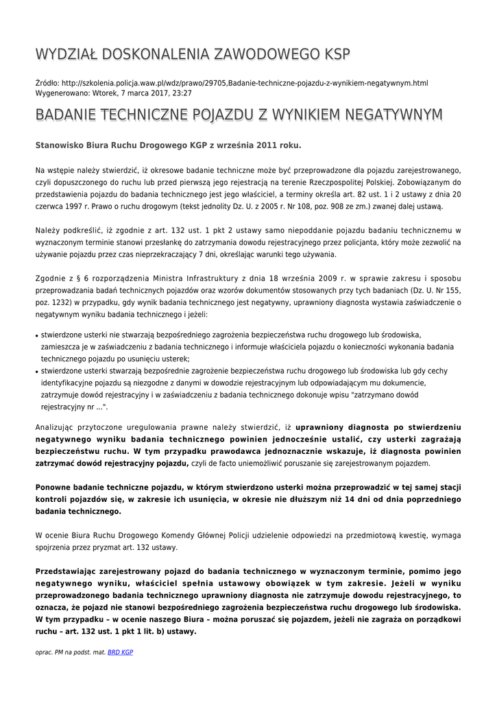 WYDZIAŁ DOSKONALENIA ZAWODOWEGO KSP Źródło: http://szkolenia.policja.waw.pl/wdz/prawo/29705,Badanie-techniczne-pojazdu-z-wynikiem-negatywnym.html Wygenerowano: Wtorek, 7 marca 2017, 23:27 BADANIE TECHNICZNE POJAZDU Z WYNIKIEM NEGATYWNYM Stanowisko Biura Ruchu Drogowego KGP z września 2011 roku. Na wstępie należy stwierdzić, iż okresowe badanie techniczne może być przeprowadzone dla pojazdu zarejestrowanego, czyli dopuszczonego do ruchu lub przed pierwszą jego rejestracją na terenie Rzeczpospolitej Polskiej. Zobowiązanym do przedstawienia pojazdu do badania technicznego jest jego właściciel, a terminy określa art. 82 ust. 1 i 2 ustawy z dnia 20 czerwca 1997 r. Prawo o ruchu drogowym (tekst jednolity Dz. U. z 2005 r. Nr 108, poz. 908 ze zm.) zwanej dalej ustawą. Należy podkreślić, iż zgodnie z art. 132 ust. 1 pkt 2 ustawy samo niepoddanie pojazdu badaniu technicznemu w wyznaczonym terminie stanowi przesłankę do zatrzymania dowodu rejestracyjnego przez policjanta, który może zezwolić na używanie pojazdu przez czas nieprzekraczający 7 dni, określając warunki tego używania. Zgodnie z § 6 rozporządzenia Ministra Infrastruktury z dnia 18 września 2009 r. w sprawie zakresu i sposobu przeprowadzania badań technicznych pojazdów oraz wzorów dokumentów stosowanych przy tych badaniach (Dz. U. Nr 155, poz. 1232) w przypadku, gdy wynik badania technicznego jest negatywny, uprawniony diagnosta wystawia zaświadczenie o negatywnym wyniku badania technicznego i jeżeli: ● stwierdzone usterki nie stwarzają bezpośredniego zagrożenia bezpieczeństwa ruchu drogowego lub środowiska, zamieszcza je w zaświadczeniu z badania technicznego i informuje właściciela pojazdu o konieczności wykonania badania technicznego pojazdu po usunięciu usterek; ● stwierdzone usterki stwarzają bezpośrednie zagrożenie bezpieczeństwa ruchu drogowego lub środowiska lub gdy cechy identyfikacyjne pojazdu są niezgodne z danymi w dowodzie rejestracyjnym lub odpowiadającym mu dokumencie, zatrzymuje dowód rejestracyjny i w zaświadczeniu z badania technicznego dokonuje wpisu "zatrzymano dowód rejestracyjny nr ...". Analizując przytoczone uregulowania prawne należy stwierdzić, iż uprawniony diagnosta po stwierdzeniu negatywnego wyniku badania technicznego powinien jednocześnie ustalić, czy usterki zagrażają bezpieczeństwu ruchu. W tym przypadku prawodawca jednoznacznie wskazuje, iż diagnosta powinien zatrzymać dowód rejestracyjny pojazdu, czyli de facto uniemożliwić poruszanie się zarejestrowanym pojazdem. Ponowne badanie techniczne pojazdu, w którym stwierdzono usterki można przeprowadzić w tej samej stacji kontroli pojazdów się, w zakresie ich usunięcia, w okresie nie dłuższym niż 14 dni od dnia poprzedniego badania technicznego. W ocenie Biura Ruchu Drogowego Komendy Głównej Policji udzielenie odpowiedzi na przedmiotową kwestię, wymaga spojrzenia przez pryzmat art. 132 ustawy. Przedstawiając zarejestrowany pojazd do badania technicznego w wyznaczonym terminie, pomimo jego negatywnego wyniku, właściciel spełnia ustawowy obowiązek w tym zakresie. Jeżeli w wyniku przeprowadzonego badania technicznego uprawniony diagnosta nie zatrzymuje dowodu rejestracyjnego, to oznacza, że pojazd nie stanowi bezpośredniego zagrożenia bezpieczeństwa ruchu drogowego lub środowiska. W tym przypadku – w ocenie naszego Biura – można poruszać się pojazdem, jeżeli nie zagraża on porządkowi ruchu – art. 132 ust. 1 pkt 1 lit. b) ustawy. oprac. PM na podst. mat. BRD KGP Ocena: 3/5 (1) Tweetnij