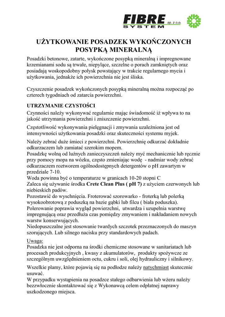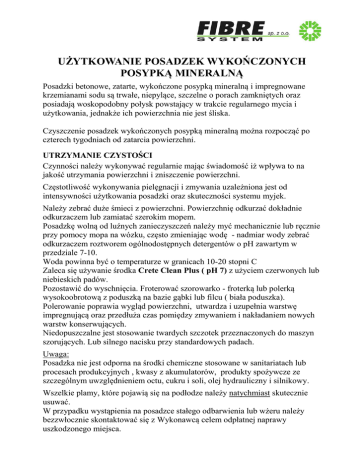 UŻYTKOWANIE POSADZEK WYKOŃCZONYCH POSYPKĄ MINERALNĄ Posadzki betonowe, zatarte, wykończone posypką mineralną i impregnowane krzemianami sodu są trwałe, niepylące, szczelne o porach zamkniętych oraz posiadają woskopodobny połysk powstający w trakcie regularnego mycia i użytkowania, jednakże ich powierzchnia nie jest śliska. Czyszczenie posadzek wykończonych posypką mineralną można rozpocząć po czterech tygodniach od zatarcia powierzchni. UTRZYMANIE CZYSTOŚCI Czynności należy wykonywać regularnie mając świadomość iż wpływa to na jakość utrzymania powierzchni i zniszczenie powierzchni. Częstotliwość wykonywania pielęgnacji i zmywania uzależniona jest od intensywności użytkowania posadzki oraz skuteczności systemu myjek. Należy zebrać duże śmieci z powierzchni. Powierzchnię odkurzać dokładnie odkurzaczem lub zamiatać szerokim mopem. Posadzkę wolną od luźnych zanieczyszczeń należy myć mechanicznie lub ręcznie przy pomocy mopa na wózku, często zmieniając wodę - nadmiar wody zebrać odkurzaczem roztworem ogólnodostępnych detergentów o pH zawartym w przedziale 7-10. Woda powinna być o temperaturze w granicach 10-20 stopni C Zaleca się używanie środka Crete Clean Plus ( pH 7) z użyciem czerwonych lub niebieskich padów. Pozostawić do wyschnięcia. Froterować szorowarko - froterką lub polerką wysokoobrotową z poduszką na bazie gąbki lub filcu ( biała poduszka). Polerowanie poprawia wygląd powierzchni, utwardza i uzupełnia warstwę impregnującą oraz przedłuża czas pomiędzy zmywaniem i nakładaniem nowych warstw konserwujących. Niedopuszczalne jest stosowanie twardych szczotek przeznaczonych do maszyn szorujących. Lub silnego nacisku przy standardowych padach. Uwaga: Posadzka nie jest odporna na środki chemiczne stosowane w sanitariatach lub procesach produkcyjnych , kwasy z akumulatorów, produkty spożywcze ze szczególnym uwzględnieniem octu, cukru i soli, olej hydrauliczny i silnikowy. Wszelkie plamy, które pojawią się na podłodze należy natychmiast skutecznie usuwać. W przypadku wystąpienia na posadzce stałego odbarwienia lub wżeru należy bezzwłocznie skontaktować się z Wykonawcą celem odpłatnej naprawy uszkodzonego miejsca. PRZYKŁADOWA TABELA CZĘSTOTLIWOŚCI KONSERWACJI POSADZKI. Zamiatanie Podłogi o małym natężeniu ruchu np. hale produkcyjne i magazynowe Podłogi o średnim natężeniu ruchu np. hale magazynowe Podłogi o dużym natężeniu ruchu np. hale sklepowe, hale cross dock, strefy przydokowe co 2-3 dni lub w zależności od potrzeby częściej. Codziennie Codziennie lub w zależności od potrzeby częściej Mycie W zależności od potrzeby, w przypadku zaobserwowania zabrudzeń, lecz nie rzadziej niż jeden raz w tygodniu Co 2-3 dni, w rejonie intensywnej eksploatacjicodziennie Codziennie KONSERWACJA DODATKOWA Zalecane dokonanie okresowych konserwacji posadzki w trakcie użytkowania. W przypadku zaistnienia konieczności zaleca się nałożenie płynu konserwującego przy pomocy mopa płaskiego bawełnianego, dokładnie rozprowadzając płyn cienką warstwę. Ilość warstw jest uzależniona od zastosowanego środka. Wskazane jest stosowanie płynów na bazie środków powierzchniowo czynnych, wosku lub polimeru. Czynności konserwacyjne należy powtarzać ( w zależności od natężenia ruchu) co 6-12 miesięcy - przy prawidłowym systemie utrzymania codziennej czystości.