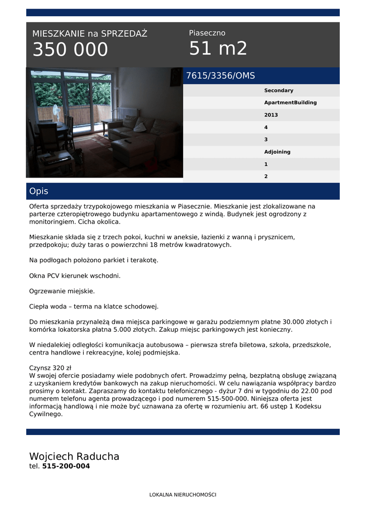 MIESZKANIE na SPRZEDAŻ 350 000 Piaseczno 51 m2 7615/3356/OMS Secondary ApartmentBuilding 2013 4 3 Adjoining 1 2 Opis Oferta sprzedaży trzypokojowego mieszkania w Piasecznie. Mieszkanie jest zlokalizowane na parterze czteropiętrowego budynku apartamentowego z windą. Budynek jest ogrodzony z monitoringiem. Cicha okolica. Mieszkanie składa się z trzech pokoi, kuchni w aneksie, łazienki z wanną i prysznicem, przedpokoju; duży taras o powierzchni 18 metrów kwadratowych. Na podłogach położono parkiet i terakotę. Okna PCV kierunek wschodni. Ogrzewanie miejskie. Ciepła woda – terma na klatce schodowej. Do mieszkania przynależą dwa miejsca parkingowe w garażu podziemnym płatne 30.000 złotych i komórka lokatorska płatna 5.000 złotych. Zakup miejsc parkingowych jest konieczny. W niedalekiej odległości komunikacja autobusowa – pierwsza strefa biletowa, szkoła, przedszkole, centra handlowe i rekreacyjne, kolej podmiejska. Czynsz 320 zł W swojej ofercie posiadamy wiele podobnych ofert. Prowadzimy pełną, bezpłatną obsługę związaną z uzyskaniem kredytów bankowych na zakup nieruchomości. W celu nawiązania współpracy bardzo prosimy o kontakt. Zapraszamy do kontaktu telefonicznego - dyżur 7 dni w tygodniu do 22.00 pod numerem telefonu agenta prowadzącego i pod numerem 515-500-000. Niniejsza oferta jest informacją handlową i nie może być uznawana za ofertę w rozumieniu art. 66 ustęp 1 Kodeksu Cywilnego. Wojciech Raducha tel. 515-200-004 LOKALNA NIERUCHOMOŚCI tel. 22 702 55 55 email: [email protected] LOKALNA NIERUCHOMOŚCI Powered by TCPDF (www.tcpdf.org)