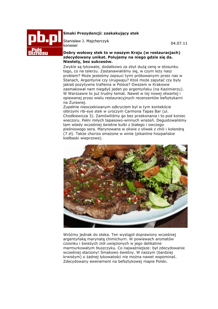 Smaki Prezydencji: zaskakujący stek Stanisław J. Majcherczyk koneser 04.07.11 Dobry wołowy stek to w naszym Kraju (w restauracjach) zdecydowany unikat. Polujemy na niego gdzie się da. Niestety, bez sukcesów. Zwykle są łykowate, dodatkowo za zbyt dużą cenę w stosunku tego, co na talerzu. Zastanawialiśmy się, w czym leży nasz problem? Może jesteśmy zepsuci tymi próbowanymi przez nas w Stanach, Argentynie czy Urugwaju? Ktoś może zapytać czy były jakieś pozytywne trafienia w Polsce? Owszem w Krakowie zasmakował nam niegdyś jeden po argentyńsku (na Kazimierzu). W Warszawie to już trudny temat. Nawet w tej nowej otwartej i opiewanej przez wielu restauracyjnych recenzentów befsztykarni na Żurawiej. Zupełnie nieoczekiwanym odkryciem był w tym kontekście olbrzymi rib-eye stek w uroczym Carmona Tapas Bar (ul. Chodkiewicza 3). Zamówiliśmy go bez przekonania i to pod koniec wieczoru. Pełni miłych tapasowo-winnych wrażeń. Degustowaliśmy tam wtedy wcześniej świetne kulki z białego i owczego pleśniowego sera. Marynowane w oliwie z oliwek z chili i kolendrą (7 zł). Także chorizo smażone w winie (pikantne hiszpańskie kiełbaski wieprzowe). Wróćmy jednak do steka. Ten wystąpił doprawiony wcześniej argentyńską marynatą chimichurri. W powiewach aromatów czosnku i świeżych ziół uwięzionych w jego delikatnie marmurkowatym tłuszczyku. Co najważniejsze: był zdecydowanie wcześniej starzony! Smakowo świetny. W naszym (bardziej krwistym) o żadnej łykowatości nie można nawet wspominać. Zdecydowany ewenement na befsztykowej mapie Polski.