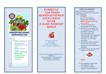 PAMIĘTAJ! NAD TWOIM BEZPIECZEŃSTWEM CZUWA WIELE SŁUŻB. W RAZIE POTRZEBY DZWOŃ WIESZ- co jest korzystne dla Twojego zdrowia POTRAFISZ-bawić się bez używek MOŻESZ- dokonywać wyborów MUSISZ – POWIEDZIEĆ NIE GDY KTOŚ NAMAWIA CIE DO RYZYKOWNYCH ZACHOWAŃ 112 numer alarmowy 997 Policja 998- Straż Pożarna 999- Pogotowie Ratunkowe Powiatowa Stacja Sanitarno-Epidemiologiczna w Myśliborzu Oświata Zdrowotna i Promocja Zdrowia 74-300 Myślibórz, ul. Spokojna 13 Tel. 97475616 Fax 957476513 NOWE ZNAJOMOŚCI Okres wakacyjny to czas gdy, spotykamy nowych ludzi i zawieramy nowe znajomości. ZAWSZE: powiedz NIE gdy ktoś zaproponuje Ci alkoholalkohol sprzyja ryzykownym zachowaniom powiedz NIE gdy ktoś zaproponuje Ci narkotyk Powiedz NIE na szybki seks bez zabezpieczeń- Każdy, kto podejmuje ryzykowne zachowana może ulec zakażeniu HIV-bez względu na wykształcenie, kolor skóry, wiek, płeć czy orientację seksualną. Zakażenienie HIV utrzymuje się całe życie i nie można rozpoznać osoby zakażonej po wyglądzie powiedz NIE w sytuacji, kiedy czujesz, że ryzykujesz NIGDY nie wsiadaj do samochodu nieznajomych osób! nie przyjmuj posiłków i napojów od nieznajomych! POSIŁKI Okres letni, wysokie temperatury sprzyjają szybszemu rozwojowi bakterii. W związku z tym łatwiej może przytrafić się nam zatrucie pokarmowe. Aby ustrzec się przykrych konsekwencji związanych z zatruciem pokarmowym zawsze: myj ręce przed przygotowywaniem i spożywaniem posiłków, myj ręce po wyjściu z toalety, przechowuj żywność w niskiej temperaturze, nigdy powtórnie nie zamrażaj artykułów spożywczych, unikaj spożywania pokarmów pochodzących od nieznanych wytwórców, zwracaj uwagę na daty przydatności do spożycia wszystkich produktów. WYPOCZYNEK NAD WODĄ I NA PLAŻY Przestrzegaj regulaminu kąpieliska, W wodzie zachowuj się w sposób nie utrudniający kąpieli innym, Nigdy nie skacz do wody w miejscach uprzednio nie rozpoznanych, Rozsądnie korzystaj z promieni słonecznych- nie zapominaj o ochronie skóry kremami z filtrami ochronnymi, Unikaj nadmiernej ekspozycji na słońce. Poparzenie słoneczne może powodować ryzyko wystąpienia nowotworu skóry Spożywaj duże ilości płynów Chroń oczy, głowę przed szkodliwym działaniem promieni ultrafioletowych . Jeśli wędrujesz pieszo po lasach, łąkach noś odpowiednie obuwie i odzież aby uniknąć kontaktu z kleszczami Po powrocie do domu dokładnie obejrzyj swoje ciało, jeśli zauważysz kleszcza natychmiast go usuń. GDY W CIĄGU KILU DNI PO USUNIĘCIU KLESZCZA W MIEJSCU UKĄSZENIA POJAWI SIĘ ZACZERWIENIENIE NIEZWŁOCZNIE ZGŁOŚ SIĘ DO LEKARZA ! Gdy zbierasz grzyby Pamiętaj! Należy zbierać tylko dobrze znane gatunki grzybów, Nie zbieraj grzybów małych, u których nie można dostrzec charakterystycznych cech gatunkowych. W przypadku wystąpienia jakichkolwiek dolegliwości po spożyciu grzybów NATYCHMIAST ZGŁOŚ SIĘ DO LEKARZA!