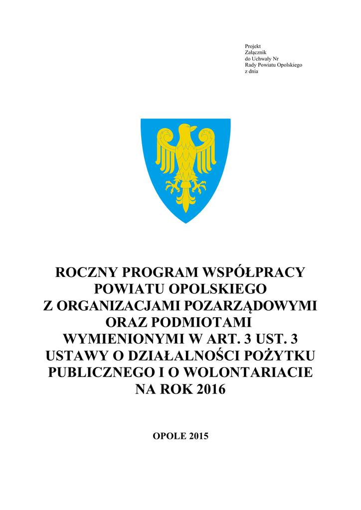 Projekt Załącznik do Uchwały Nr Rady Powiatu Opolskiego z dnia ROCZNY PROGRAM WSPÓŁPRACY POWIATU OPOLSKIEGO Z ORGANIZACJAMI POZARZĄDOWYMI ORAZ PODMIOTAMI WYMIENIONYMI W ART. 3 UST. 3 USTAWY O DZIAŁALNOŚCI POŻYTKU PUBLICZNEGO I O WOLONTARIACIE NA ROK 2016 OPOLE 2015 SPIS TREŚCI I. WPROWADZENIE............................................................................................... 3 II. CEL GŁÓWNY I CELE SZCZEGÓŁOWE PROGRAMU..............................3 III. ZASADY WSPÓŁPRACY………………………………………………………4 IV. ZAKRES PRZEDMIOTOWY ……………………………..………………...... 4 V. FORMY WSPÓŁPRACY……………………………………………………..... 4 VI. PRIORYTETOWE ZADANIA PUBLICZNE ……………….……………….. 5 VII. OKRES REALIZACJI PROGRAMU….……………………………………....6 VIII. SPOSÓB REALIZACJI PROGRAMU………………………………………... 6 IX. WYSOKOŚĆ ŚRODKÓW PLANOWANYCH NA REALIZACJĘ PROGRAMU……………………………………………………………………. 7 X. SPOSÓB OCENY REALIZAJI PROGRAMU……………………………….. 7 XI. INFORMACJA O SPOSOBIE TWORZENIA PROGRAMU ORAZ O PRZEBIEGU KOSULTACJI……………………………………………...... 7 XII. TRYB POWOŁYWANIA I ZASADY DZIAŁANIA KOMISJI KONKURSOWYCH DO OPINIOWANIA OFERT W OTWARTYCH KONKURSACH OFERT………………………………………………………. 8 XIII. POSTANOWIENIA KOŃCOWE……………………………………………... 8 I. WPROWADZENIE Współpraca Powiatu Opolskiego z organizacjami pozarządowymi oraz podmiotami, o których mowa w art. 3 ust. 3 ustawy z dnia 24 kwietnia 2003 r. o działalności pożytku publicznego i o wolontariacie (t.j. Dz. U. z 2014 r., poz. 1118 z późn. zm.) służy umacnianiu uprawnień mieszkańców Powiatu Opolskiego w procesie tworzenia więzi społecznych, odpowiedzialności za swoje otoczenie oraz zaspokajaniu potrzeb różnych grup społeczności lokalnej. Niniejszy Program jest wyrazem polityki władz Powiatu Opolskiego wobec organizacji pozarządowych i innych podmiotów prowadzących działalność pożytku publicznego, polityki zmierzającej do zapewnienia im jak najlepszych możliwości do działania, rozwoju oraz wzajemnej współpracy. 1. Ilekroć w Programie jest mowa o: 1) Ustawie – należy przez to rozumieć ustawę z 24 kwietnia 2003 r. o działalności pożytku publicznego i o wolontariacie (t.j. Dz. U. z 2014 r., poz.1118 z późn. zm). 2) Programie – należy przez to rozumieć „Roczny program współpracy Powiatu Opolskiego z organizacjami pozarządowymi oraz podmiotami wymienionymi w art. 3 ust. 3 ustawy o działalności pożytku publicznego i o wolontariacie na rok 2016”. 3) Zadaniu publicznym – należy przez to rozumieć zadanie określone w art. 4 ustawy. 4) Organizacji/ Podmiotu Programu – należy przez to rozumieć organizacje pozarządowe oraz podmioty, o których mowa w art. 3 ust. 3 ustawy. 5) Starostwie – należy przez to rozumieć Starostwo Powiatowe w Opolu. 6) Powiecie – należy przez to rozumieć Powiat Opolski. 7) Radzie – należy przez to rozumieć Radę Powiatu Opolskiego. 8) Zarządzie – należy przez to rozumieć Zarząd Powiatu Opolskiego. 2. II. Program obejmuje współpracę Powiatu z organizacjami pozarządowymi działającymi na rzecz Powiatu i jego mieszkańców. CEL GŁÓWNY I CELE SZCZEGÓŁOWE PROGRAMU 1. Celem głównym programu jest zaspokojenie potrzeb mieszkańców Powiatu, wzmocnienie rozwoju społeczeństwa obywatelskiego, budowanie partnerstwa oraz wspieranie organizacji pozarządowych w realizacji ważnych celów społecznych. 2. Celami szczegółowymi Programu są: 1) podniesienie jakości życia i pełniejsze zaspokojenie potrzeb mieszkańców Powiatu poprzez zwiększenie aktywności organizacji, 2) stworzenie warunków do powstania inicjatyw i struktur funkcjonujących na rzecz społeczności lokalnej, 3) wykorzystanie potencjału i możliwości organizacji pozarządowych, 4) otwarcie na innowacyjność i konkurencyjność w wykonywaniu zadań publicznych, 5) integracja organizacji realizujących zadania publiczne, 6) promowanie i wzmacnianie postaw obywatelskich, 7) racjonalne wykorzystanie publicznych środków finansowych. III. ZASADY WSPÓŁPRACY Współpraca Powiatu Opolskiego z organizacjami odbywa się na zasadach: 1) pomocniczości – oznacza, że Powiat powierza organizacjom realizację zadań własnych, a organizacje zapewniają ich wykonanie w sposób ekonomiczny, profesjonalny i terminowy, 2) suwerenności stron – oznacza, że stosunki pomiędzy Powiatem a organizacjami kształtowane będą z poszanowaniem wzajemnej autonomii i niezależności w swojej działalności statutowej, 3) partnerstwa – oznacza dobrowolną współpracę równorzędnych sobie podmiotów w rozwiązywaniu wspólnie zdefiniowanych problemów i osiąganiu razem wytyczonych celów, 4) efektywności – oznacza wspólne dążenie do osiągnięcia możliwie największych efektów realizacji zadań publicznych, 5) uczciwej konkurencji – oznacza wymóg udzielania tych samych informacji odnośnie wykonywanych działań zarówno przez podmioty publiczne jak i niepubliczne, a także obowiązek stosowania tych samych kryteriów przy dokonywaniu oceny tych działań i podejmowaniu decyzji odnośnie ich finansowania, 6) jawności – oznacza, że wszystkie możliwości współpracy Powiatu z organizacjami są powszechnie wiadome i dostępne oraz jasne i zrozumiałe w zakresie stosowanych procedur i kryteriów podejmowania decyzji. IV. ZAKRES PRZEDMIOTOWY Współpraca Powiatu z organizacjami pozarządowymi dotyczy realizacji zadań publicznych określonych w art. 4 ustawy o działalności pożytku publicznego i o wolontariacie, w zakresie odpowiadającym zadaniom powiatu. V. FORMY WSPÓŁPRACY Powiat podejmuje współpracę z organizacjami w formie: 1) z