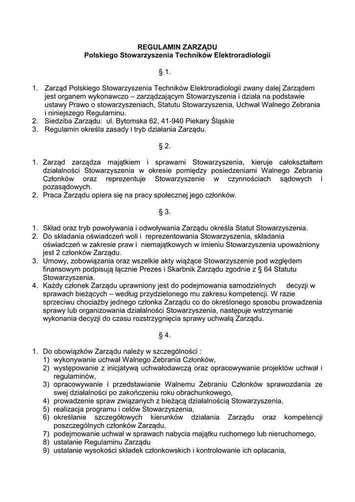 REGULAMIN ZARZĄDU Polskiego Stowarzyszenia Techników Elektroradiologii § 1. 1. Zarząd Polskiego Stowarzyszenia Techników Elektroradiologii zwany dalej Zarządem jest organem wykonawczo – zarządzającym Stowarzyszenia i działa na podstawie ustawy Prawo o stowarzyszeniach, Statutu Stowarzyszenia, Uchwał Walnego Zebrania i niniejszego Regulaminu. 2. Siedziba Zarządu: ul. Bytomska 62, 41-940 Piekary Śląskie 3. Regulamin określa zasady i tryb działania Zarządu. § 2. 1. Zarząd zarządza majątkiem i sprawami Stowarzyszenia, kieruje całokształtem działalności Stowarzyszenia w okresie pomiędzy posiedzeniami Walnego Zebrania Członków oraz reprezentuje Stowarzyszenie w czynnościach sądowych i pozasądowych. 2. Praca Zarządu opiera się na pracy społecznej jego członków. § 3. 1. Skład oraz tryb powoływania i odwoływania Zarządu określa Statut Stowarzyszenia. 2. Do składania oświadczeń woli i reprezentowania Stowarzyszenia, składania oświadczeń w zakresie praw i niemajątkowych w imieniu Stowarzyszenia upoważniony jest 2 członków Zarządu. 3. Umowy, zobowiązania oraz wszelkie akty wiążące Stowarzyszenie pod względem finansowym podpisują łącznie Prezes i Skarbnik Zarządu zgodnie z § 64 Statutu Stowarzyszenia. 4. Każdy członek Zarządu uprawniony jest do podejmowania samodzielnych decyzji w sprawach bieżących – według przydzielonego mu zakresu kompetencji. W razie sprzeciwu chociażby jednego członka Zarządu co do określonego sposobu prowadzenia sprawy lub organizowania działalności Stowarzyszenia, następuje wstrzymanie wykonania decyzji do czasu rozstrzygnięcia sprawy uchwałą Zarządu. § 4. 1. Do obowiązków Zarządu należy w szczególności : 1) wykonywanie uchwał Walnego Zebrania Członków, 2) występowanie z inicjatywą uchwałodawczą oraz opracowywanie projektów uchwał i regulaminów, 3) opracowywanie i przedstawianie Walnemu Zebraniu Członków sprawozdania ze swej działalności po zakończeniu roku obrachunkowego, 4) prowadzenie spraw związanych z bieżącą działalnością Stowarzyszenia, 5) realizacja programu i celów Stowarzyszenia, 6) określanie szczegółowych kierunków działania Zarządu oraz kompetencji poszczególnych członków Zarządu, 7) podejmowanie uchwał w sprawach nabycia majątku ruchomego lub nieruchomego, 8) ustalanie Regulaminu Zarządu 9) ustalanie wysokości składek członkowskich i kontrolowanie ich opłacania, 10) zawieranie porozumień o współpracy z organami administracji państwowej, samorządowej oraz innymi organizacjami krajowymi i zagranicznymi, 11) powoływanie specjalistów z danej dziedziny, zespołów problemowych oraz określanie ich zadań, 12) zarządzanie majątkiem i sprawami Stowarzyszenia oraz pełnienie swoich obowiązków ze starannością wymaganą w obrocie gospodarczym, finansowym, przy ścisłym przestrzeganiu przepisów prawa oraz postanowień Statutu i uchwał Walnego Zebrania Członków, 13) udzielanie Komisji Rewizyjnej oraz Walnemu Zebraniu Członków wyczerpujących wyjaśnień wraz z przedstawieniem wszelkich dokumentów i innych materiałów dotyczących przedmiotu kontroli, 14) wykonywanie zaleceń pokontrolnych Komisji Rewizyjnej, 15) przedkładanie corocznie Walnemu Zebraniu Członków do rozpatrzenia i zatwierdzenia planu finansowo – ekonomicznego oraz programu działalności gospodarczej Stowarzyszenia. § 5. Do kompetencji Zarządu należy w szczególności : 1) w sprawach członkowskich : a) przyjmowanie członków zwyczajnych i wspierających Stowarzyszenia, na zasadach określonych w Statucie, b) przyjmowanie deklaracji nowych członków o wstąpieniu do Stowarzyszenia, c) ustalanie zasad wspierania Stowarzyszenia przez członków wspierających, d) skreślanie z listy członków zwyczajnych i wspierających, e) składanie informacji Walnemu Zebraniu Członków o skreśleniu z listy członków Stowarzyszenia, f) wykluczanie członków zwyczajnych i wspierających, 2) w sprawach Walnego Zebrania Członków : a) zwoływanie Walnego Zebrania Członków, b) przygotowanie organizacyjne Walnego Zebrania Członków, c) przygotowanie niezbędnych materiałów, projektów uchwał Walnego Zebrania Członków, 3) w sprawach majątkowych : a) pozyskiwanie funduszy na działalność statutową Stowarzyszenia, b) inicjowanie i prowadzenie działalności gospodarczej w zakresie ustalonym w Statucie Stowarzyszenia. § 6. 1. Prace Zarządu organizuje i pracom tym przewodniczy Prezes Zarządu. 2. Posiedzenia Zarządu zwołuje Prezes z własnej inicjatywy albo na wniosek któregokolwiek z członków Zarządu. W razie złożenia wniosku o zwołanie posiedzenia przez członka Zarządu, Prezes zobowiązany jest zwołać posiedzenie w terminie nie dłuższym niż 3 dni. 3. Posiedzenia Zarządu odbywają się nie rzadziej niż dwa razy w roku. 4. W posiedzeniach Zarządu mogą brać udział z głosem doradczym : 1) członkowie Komisji Rewizyjnej, 2) przedstawiciele członków wspierających, 3) goście zaproszeni przez Zarząd. 5. Porządek obrad posiedzenia ustala Prezes lub zwołujący, uwzględniając wnioski złożone przez członków Zarządu. Wnioski członków Zarządu o umieszczenie poszczególnych spraw w porządku obrad wraz z projektami uchwał i innymi niezbędnymi materiałami. § 7. 1. O dacie, godzinie, miejscu i porządku posiedzenia zawiadamia się wszystkich członków Zarządu za pośrednictwem poczty email, na trzy dni przed posiedzeniem. 2. Z ważnych powodów posiedzenie może być zwołane bez zachowania trzydniowego terminu powiadomienia. 3. Obecność na posiedzeniu Zarządu jego członków jest obowiązkowa. O niemożności wzięcia udziału w posiedzeniu Zarządu należy powiadomić niezwłocznie zwołującego posiedzenie. § 8. 1. Posiedzeniom Zarządu przewodniczy Prezes, a w razie jego nieobecności Wiceprezes lub inny wskazany przez Prezesa członek Zarządu, zwany dalej Przewodniczącym posiedzenia. 2. Po otwarciu posiedzenia stwie