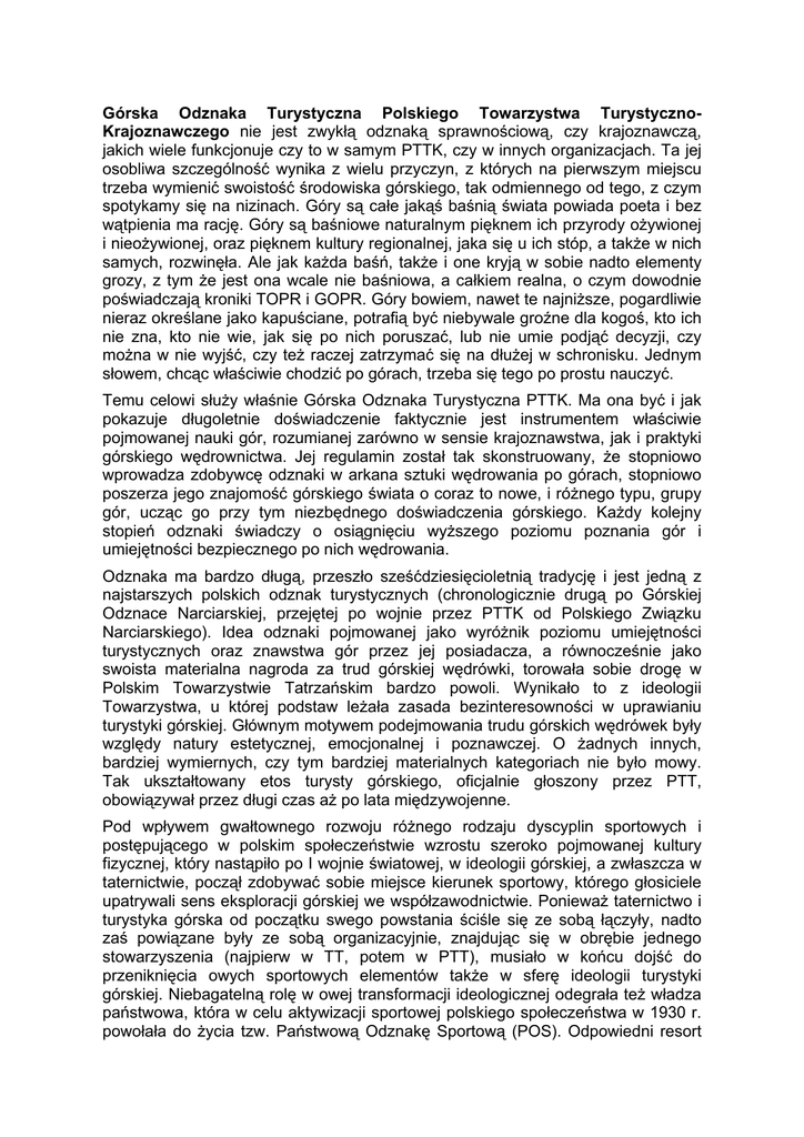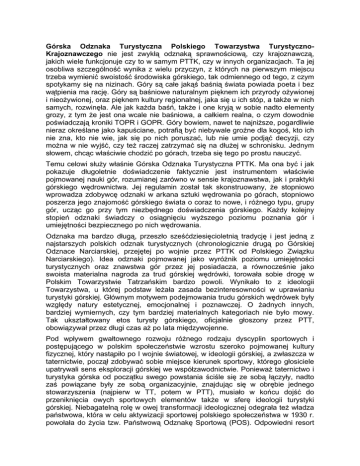 Górska Odznaka Turystyczna Polskiego Towarzystwa TurystycznoKrajoznawczego nie jest zwykłą odznaką sprawnościową, czy krajoznawczą, jakich wiele funkcjonuje czy to w samym PTTK, czy w innych organizacjach. Ta jej osobliwa szczególność wynika z wielu przyczyn, z których na pierwszym miejscu trzeba wymienić swoistość środowiska górskiego, tak odmiennego od tego, z czym spotykamy się na nizinach. Góry są całe jakąś baśnią świata powiada poeta i bez wątpienia ma rację. Góry są baśniowe naturalnym pięknem ich przyrody ożywionej i nieożywionej, oraz pięknem kultury regionalnej, jaka się u ich stóp, a także w nich samych, rozwinęła. Ale jak każda baśń, także i one kryją w sobie nadto elementy grozy, z tym że jest ona wcale nie baśniowa, a całkiem realna, o czym dowodnie poświadczają kroniki TOPR i GOPR. Góry bowiem, nawet te najniższe, pogardliwie nieraz określane jako kapuściane, potrafią być niebywale groźne dla kogoś, kto ich nie zna, kto nie wie, jak się po nich poruszać, lub nie umie podjąć decyzji, czy można w nie wyjść, czy też raczej zatrzymać się na dłużej w schronisku. Jednym słowem, chcąc właściwie chodzić po górach, trzeba się tego po prostu nauczyć. Temu celowi służy właśnie Górska Odznaka Turystyczna PTTK. Ma ona być i jak pokazuje długoletnie doświadczenie faktycznie jest instrumentem właściwie pojmowanej nauki gór, rozumianej zarówno w sensie krajoznawstwa, jak i praktyki górskiego wędrownictwa. Jej regulamin został tak skonstruowany, że stopniowo wprowadza zdobywcę odznaki w arkana sztuki wędrowania po górach, stopniowo poszerza jego znajomość górskiego świata o coraz to nowe, i różnego typu, grupy gór, ucząc go przy tym niezbędnego doświadczenia górskiego. Każdy kolejny stopień odznaki świadczy o osiągnięciu wyższego poziomu poznania gór i umiejętności bezpiecznego po nich wędrowania. Odznaka ma bardzo długą, przeszło sześćdziesięcioletnią tradycję i jest jedną z najstarszych polskich odznak turystycznych (chronologicznie drugą po Górskiej Odznace Narciarskiej, przejętej po wojnie przez PTTK od Polskiego Związku Narciarskiego). Idea odznaki pojmowanej jako wyróżnik poziomu umiejętności turystycznych oraz znawstwa gór przez jej posiadacza, a równocześnie jako swoista materialna nagroda za trud górskiej wędrówki, torowała sobie drogę w Polskim Towarzystwie Tatrzańskim bardzo powoli. Wynikało to z ideologii Towarzystwa, u której podstaw leżała zasada bezinteresowności w uprawianiu turystyki górskiej. Głównym motywem podejmowania trudu górskich wędrówek były względy natury estetycznej, emocjonalnej i poznawczej. O żadnych innych, bardziej wymiernych, czy tym bardziej materialnych kategoriach nie było mowy. Tak ukształtowany etos turysty górskiego, oficjalnie głoszony przez PTT, obowiązywał przez długi czas aż po lata międzywojenne. Pod wpływem gwałtownego rozwoju różnego rodzaju dyscyplin sportowych i postępującego w polskim społeczeństwie wzrostu szeroko pojmowanej kultury fizycznej, który nastąpiło po I wojnie światowej, w ideologii górskiej, a zwłaszcza w taternictwie, począł zdobywać sobie miejsce kierunek sportowy, którego głosiciele upatrywali sens eksploracji górskiej we współzawodnictwie. Ponieważ taternictwo i turystyka górska od początku swego powstania ściśle się ze sobą łączyły, nadto zaś powiązane były ze sobą organizacyjnie, znajdując się w obrębie jednego stowarzyszenia (najpierw w TT, potem w PTT), musiało w końcu dojść do przeniknięcia owych sportowych elementów także w sferę ideologii turystyki górskiej. Niebagatelną rolę w owej transformacji ideologicznej odegrała też władza państwowa, która w celu aktywizacji sportowej polskiego społeczeństwa w 1930 r. powołała do życia tzw. Państwową Odznakę Sportową (POS). Odpowiedni resort zwrócił się nawet do PTT z sugestią włączenia się Towarzystwa w system funkcjonowania POS, ale Towarzystwo początkowo odmówiło, motywując to sprzecznością z zasadami ideologicznymi turystyki górskiej. Idea odznaki jednak, zwłaszcza kiedy w 1932 r. Polski Związek Narciarski ustanowił swoją Górską Odznakę PZN, będącą pierwszą polską odznaką turystyczną, a więc taką, która potwierdzała stopień kwalifikacji turystycznych jej zdobywcy, poczęła zyskiwać pośród członków PTT coraz przychylniejszy grunt. Znalazło to odbicie w przystąpieniu Towarzystwa do akcji POS w 1934 r., powołaniu do życia przez Oddział PTT Beskid Śląski w Cieszynie, jeszcze w sezonie letnim tegoż roku, własnej odznaki turystycznej, a także w projekcie Odznaki Huculszczyzny PPT, z którym wystąpił z początkiem 1935 r. Oddział PTT w Stanisławowie. Pod wpływem tych działań wnet pojawiła się myśl, aby akcję odznaki rozszerzyć na całe Towarzystwo. Powołano specjalną komisję, która przygotowała konkretny projekt regulaminu, ustalający m.in. nazwę odznaki jako Odznaka Górska PTT. Owa działalność Towarzystwa nad powołaniem do życia nowej odznaki turystycznej wzbudziła sprzeciwy ze strony PZN, organizacji konkurującej z PTT o prymat w górach, której władze, nie bez podstaw zresztą, zarzuciły PTT powielanie wzorów i stwarzanie konkurencji dla Odznaki Górskiej PZN. Związek uważał, iż nazwa Odznaka Górska jest w opinii społecznej ściśle związana z instytucją Odznaki Górskiej PZN, nadto wskazywał, że użycie dla odznaki PTT zarówno sformułowania Odznaka Górska, jak i terminu przodownik (występującego w Odznace Górskiej PZN) wywoła wśród turystów zamęt i nieporozumienia. Sporne problemy rozstrzygnięto w końcu w ten sposób, iż dla nowej odznaki przyjęto nazwę Górska Odznaka Turystyczna PTT, zaproponowaną przez Stanisława Osieckiego, ówczesnego prezesa Towarzystwa, oraz zgodzono się na określenie przewodnik do GOT w miejsce przodownika. W dniu 23 