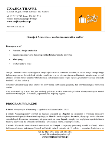 CZAJKA TRAVEL ul. Szlak 65, pok. 803 (8 piętro) 31-153 Kraków tel. 12 3121 795; kom. 506 965 755 e-mail: [email protected] www.czajkapodroze.pl NIP 685-216-22-22 Gruzja i Armenia – kaukaska mozaika kultur Dlaczego warto? Poznasz 2 kraje kaukaskie Będziesz podróżował z duetem: polski pilota i gruziński kierowca Małe grupy Wyżywienie w cenie Gruzja i Armenia - dwa sąsiadujące ze sobą kraje kaukaskie. Pozornie podobne, w końcu z tego samego kręgu kulturowego, na co dzień jednak niejako rywalizują o prym pierwszeństwa na Kaukazie: kto pierwszy przyjął chrzest? kto ma starsze zabytki? która kuchnia jest smaczniejsza? co jest lepsze: gruzińskie wino czy armeński koniak? I tak bez końca :) Gruzini i Ormianie toczą także spory o to, który naród jest bardziej gościnny. Ten spór rozstrzygnąć niebywale trudno. Aby przekonać się o tym, kto jest bardziej gościnny a także doświadczyć wielu niezapomnianych wrażeń zarówno w Gruzji jak i w Armenii, zapraszamy na wspólny wyjazd. PROGRAM WYJAZDU 1 dzień: Nocny wylot z Warszawy – zgodnie z rozkładem lotów: 23.55. 2 dzień: Wczesnoporanny przylot do Kutaisi; przejazd do Zugdidi na śniadanie i wymianę pieniędzy; kontynuowanie przejazdu malowniczą drogą do Mestii – stolicy regionu Swanetia, słynącego z wież obronnomieszkalnych. Po drodze zatrzymamy się przy tamie na rzece Inguri – drugiej pod względem wysokości tamie łukowej na świecie. Po krótkim odpoczynku – zwiedzanie Mestii. Nocleg w Mestii. 3 dzień: Wycieczka samochodami terenowymi do Uszguli – najwyżej położonej wioski w Gruzji. Mimo krótkiego dystansu dzielącego Uszguli od Mestii dojazd zajmuje ok. 3 godzin – wspaniałe krajobrazy po tel. 12 3121 795; kom. 506 965 755 e-mail: [email protected] www.czajkapodroze.pl drodze i górska droga nie pozwalają na rozwijanie nadmiernej szybkości. Spacer wsród starej zabudowy Uszguli do cerkwi Lamaria z niesamowitym widokiem na najwyższy szczyt Gruzji – Szcharę. Powrót na nocleg do Mestii. 4 dzień: Przejazd do Tbilisi – stolicy Gruzji. Na trasie przystanek w Jaskini Prometeusza w okolicach Kutaisi – jaskini z przepięknymi formami naciekowymi. Kontynuowanie przejazdu do Tbilisi. Nocleg w Tbilisi. 5 dzień: Całodzienne zwiedzanie Tbilisi. Spacer urokliwymi uliczkami Starego Miasta, zwiedzanie cerkwi Metechi, Sioni, Anczischati; podziwianie panoramy miasta z Twierdzy Narikała. Nocleg w Tbilisi. 6 dzień: Przejazd przez półpustynię do Dawid Garedża – pięknie położonego klasztoru, tuż przy granicy z Azerbejdżanem. Potem przejedziemy do Kachetii – regionu słynącego z uprawy winorośli. Degustacja wina u lokalnego gospodarza oraz degustacja czurczcheli. Zwiedzanie malowniczego miasteczka Sighnaghi. Nocleg w okolicach Sighnaghi. 7 dzień: Przejazd Gruzińską Drogą Wojenną aż do miasteczka Kazbegi. Po drodze przystanek w Mcchecie – dawnej stolicy Gruzji, zwiedzanie Dżwari – górującego nad Mcchetą oraz twierdzy Ananuri, malowniczo położonej nad zbiornikiem Żinwalskim. Nocleg w Kazbegi (obecnie Stepancminda). 8 dzień: Zwiedzanie jednej z wizytówek Gruzji – malowniczo położnej cerkwi Cminda Sameba z widokiem na najsłynniejszy szczyt Gruzji – Kazbek. Powrót do Tbilisi. Dla chętnych na trasie rafting na jednej z bystrych rzek Pszaweti. Nocleg w Tbilisi. 9 dzień: Przejazd do Armenii. Zwiedzanie zabytków Armenii Północnej, malowniczo położonych wśród wzgórz kompleksów świątynnych: Sanahin i Haghpat. Nocleg w Sewan lub Vanadzor. 10 dzień: Poranne zwiedzanie kompleksu Sevanavank – położonego nad jeziorem Sewan, które nazywane jest Morzem Armenii. Przejazd do Noratus – zwiedzanie cmentarza, gdzie mieści się największa w Armenii liczba chaczkarów. Przejazd do Noravank – zwiedzanie kompleksu klasztornego wybudowanego wśród czerwonych skał. Następnie przejazd w kierunku Erewania – stolicy Armenii. Po drodze możliwość przystanku w fabryce wina na degustację. Popołudniowy spacer po stolicy Armenii. Nocleg w Erewaniu. 11 dzień: Przejazd i zwiedzanie Garni, które słynie z bazaltowej świątyni poświęconej bogu słońca. Następnie przejazd do Gegard – zespołu klasztornego z IV w. Powrót do Erewania – zwiedzanie stolicy Armenii: Plac Republiki, Plac Wolności, Kaskady i nocna panorama miasta. Nocleg w Erewaniu. 12 dzień: Przejazd do Wardzi – zwiedzanie skalnego miasta z XIIw. Przejazd do Achalcyche i zwiedzanie twierdzy Rabati z ciekawym muzeum prezentującym historię Samcche Dżawachetii. Nocleg w Achalcyche. 13 dzień: Poranny wyjazd do Batumi – stolicy Adżarii nad Morzem Czarnym. Nocleg w Batumi. 14 dzień: Odpoczynek w Batumi. Dla chętnych możliwość zwiedzania najpiękniejszego na Kaukazie Ogrodu Botanicznego i ruin rzymskiej twierdzy Gonio. Nocleg w Batumi. 15 dzień: Odpoczynek w Batumi. Ostatnie zakupy. Nocleg w Batumi. Nocny wyjazd z Batumi do Kutaisi (około godziny 1 w nocy). Przejazd na lotnisko, odprawa, wylot do Polski o 5.50 rano. 16 dzień: Wczesnoporanny przylot do Polski (ok. 7.00) Kolejność zwiedzania może ulec zmianie. tel. 12 3121 795; kom. 506 965 755 e-mail: [email protected] www.czajkapodroze.pl CENA OBEJMUJE: 14 noclegów zgodnie z programem Wyżywienie dwa razy dziennie: śniadania i obiadokolacje (w kilku miejscach zamiast obiadokolacji obiad) Opiekę polskiego pilota Transport zgodnie z programem Ubezpieczenie KL, NNW, bagażu CENA NIE OBEJMUE: Wydatków na pamiątki Biletów wstępu - ok 40 USD Raftingu – dla chętnych 25-30 USD Wycieczki do Uszguli – ok. 30-40 USD TERMINY/CENY TERMIN CENA 12.07 – 27.07.2015 1370 PLN + 870 USD + przelot 12.08 – 27.08.2015 1370 PLN + 870 USD + przelot 13.09 – 28.09.2015 1370 PLN + 870 USD + przelot UWAGA: Część w PLN: zaliczka (500zł) płatna w biurze przed wyjazdem; pozostała kwota w PLN - 60 dni przed wyjazdem Część w USD: płatna pilotowi pierwszego dnia po przylocie na miejsce. Banknoty USD muszą być wydane po 1996