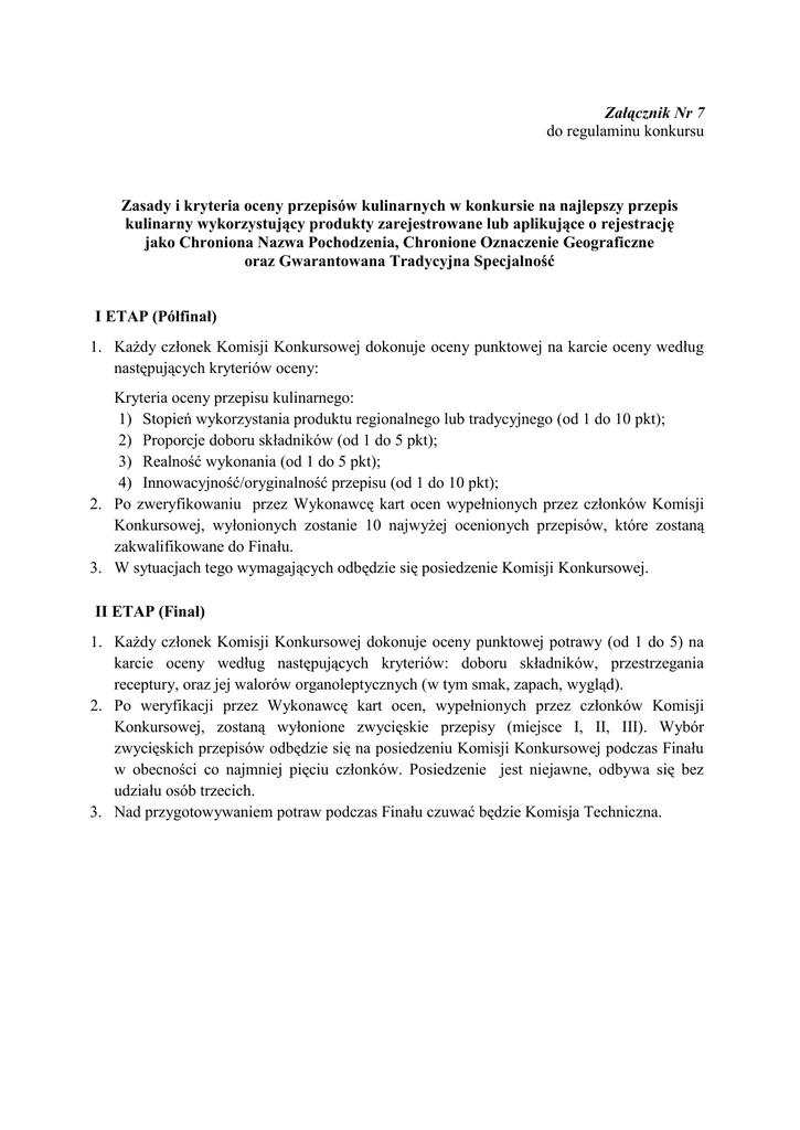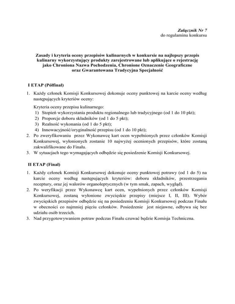 Załącznik Nr 7 do regulaminu konkursu Zasady i kryteria oceny przepisów kulinarnych w konkursie na najlepszy przepis kulinarny wykorzystujący produkty zarejestrowane lub aplikujące o rejestrację jako Chroniona Nazwa Pochodzenia, Chronione Oznaczenie Geograficzne oraz Gwarantowana Tradycyjna Specjalność I ETAP (Półfinał) 1. Każdy członek Komisji Konkursowej dokonuje oceny punktowej na karcie oceny według następujących kryteriów oceny: Kryteria oceny przepisu kulinarnego: 1) Stopień wykorzystania produktu regionalnego lub tradycyjnego (od 1 do 10 pkt); 2) Proporcje doboru składników (od 1 do 5 pkt); 3) Realność wykonania (od 1 do 5 pkt); 4) Innowacyjność/oryginalność przepisu (od 1 do 10 pkt); 2. Po zweryfikowaniu przez Wykonawcę kart ocen wypełnionych przez członków Komisji Konkursowej, wyłonionych zostanie 10 najwyżej ocenionych przepisów, które zostaną zakwalifikowane do Finału. 3. W sytuacjach tego wymagających odbędzie się posiedzenie Komisji Konkursowej. II ETAP (Finał) 1. Każdy członek Komisji Konkursowej dokonuje oceny punktowej potrawy (od 1 do 5) na karcie oceny według następujących kryteriów: doboru składników, przestrzegania receptury, oraz jej walorów organoleptycznych (w tym smak, zapach, wygląd). 2. Po weryfikacji przez Wykonawcę kart ocen, wypełnionych przez członków Komisji Konkursowej, zostaną wyłonione zwycięskie przepisy (miejsce I, II, III). Wybór zwycięskich przepisów odbędzie się na posiedzeniu Komisji Konkursowej podczas Finału w obecności co najmniej pięciu członków. Posiedzenie jest niejawne, odbywa się bez udziału osób trzecich. 3. Nad przygotowywaniem potraw podczas Finału czuwać będzie Komisja Techniczna.