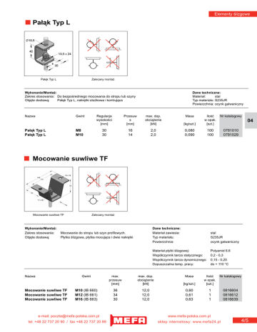Elementy ślizgowe Pałąk Typ L Pałąk Typ L Zalecany montaż Wykonanie/Montaż: Zakres stosowania: Do bezpośredniego mocowania do stropu lub szyny Objęte dostawą: Pałąk Typ L, nakrętki stożkowa i kontrująca Nazwa Gwint Pałąk Typ L Pałąk Typ L Dane techniczne: Materiał: stal Typ materiału: S235JR Powierzchnia: ocynk galwaniczny Regulacja wysokości [mm] Przesuw s [mm] max. dop. obciążenie [kN] 30 30 16 14 2,0 2,0 M8 M10 Masa Nr katalogowy [kg/szt.] Ilość w opak. [szt.] 0,080 0,090 100 100 0781010 0781029 04 Mocowanie suwliwe TF Mocowanie suwliwe TF Wykonanie/Montaż: Zakres stosowania: Objęte dostawą: Zalecany montaż Mocowanie do stropu lub szyn profilowych. Płytka ślizgowa, płytka mocująca i dwie nakrętki Nazwa Gwint Mocowanie suwliwe TF Mocowanie suwliwe TF Mocowanie suwliwe TF M10 (IB 660) M12 (IB 661) M16 (IB 663) e-mail: [email protected] tel. +48 22 737 20 90 / fax +48 22 737 20 89 Dane techniczne: Materiał zawiesia: Typ materiału: Powierzchnia: stal S235JR ocynk galwaniczny Materiał płytki ślizgowej: Współczynnik tarcia statycznego: Współczynnik tarcia dynamicznego: Dopuszczalna temp. pracy: Polyamid 6.6 0,2 - 0,3 0,15 - 0,25 do + 110 °C max. przesuw [mm] max. dop. obciążenie [kN] 36 34 30 12,0 12,0 12,0 Masa Nr katalogowy [kg/szt.] Ilość w opak. [szt.] 0,60 0,61 0,63 1 1 1 0816604 0816612 0816639 www.mefa-polska.com.pl sklep internetowy: www.mefa24.pl 4/5