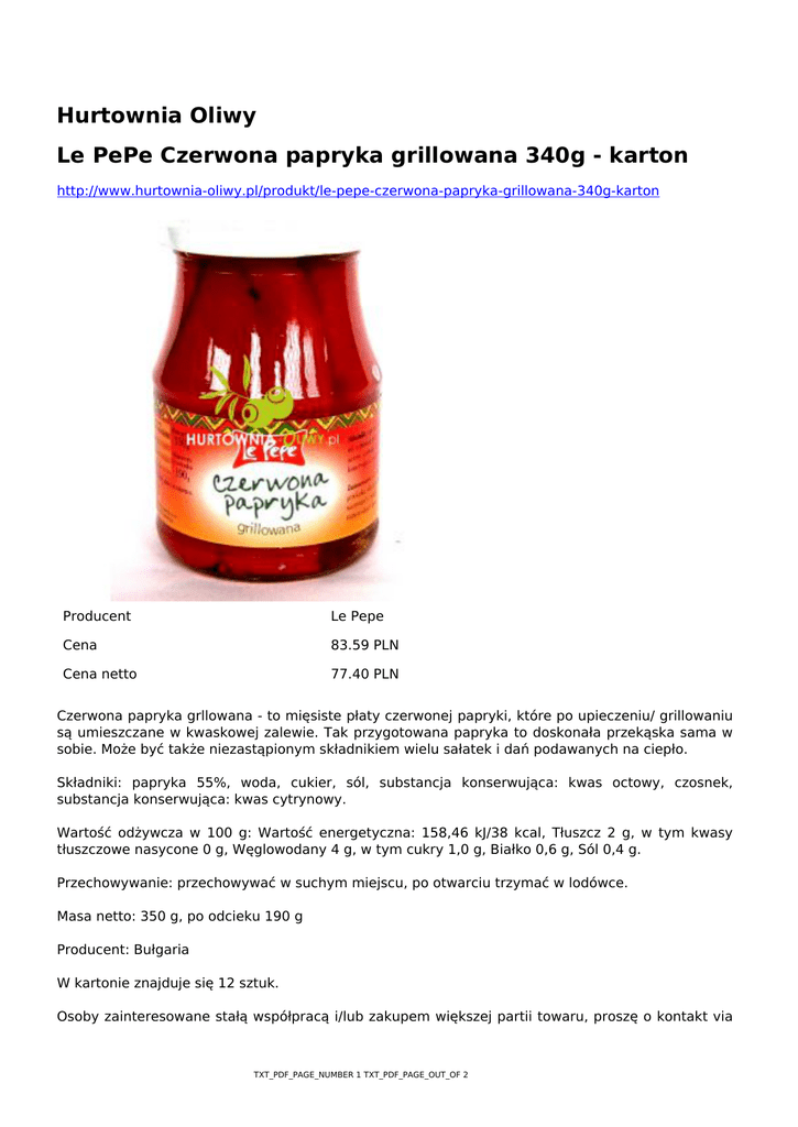 Hurtownia Oliwy Le PePe Czerwona papryka grillowana 340g - karton http://www.hurtownia-oliwy.pl/produkt/le-pepe-czerwona-papryka-grillowana-340g-karton Producent Le Pepe Cena 83.59 PLN Cena netto 77.40 PLN Czerwona papryka grllowana - to mięsiste płaty czerwonej papryki, które po upieczeniu/ grillowaniu są umieszczane w kwaskowej zalewie. Tak przygotowana papryka to doskonała przekąska sama w sobie. Może być także niezastąpionym składnikiem wielu sałatek i dań podawanych na ciepło. Składniki: papryka 55%, woda, cukier, sól, substancja konserwująca: kwas octowy, czosnek, substancja konserwująca: kwas cytrynowy. Wartość odżywcza w 100 g: Wartość energetyczna: 158,46 kJ/38 kcal, Tłuszcz 2 g, w tym kwasy tłuszczowe nasycone 0 g, Węglowodany 4 g, w tym cukry 1,0 g, Białko 0,6 g, Sól 0,4 g. Przechowywanie: przechowywać w suchym miejscu, po otwarciu trzymać w lodówce. Masa netto: 350 g, po odcieku 190 g Producent: Bułgaria W kartonie znajduje się 12 sztuk. Osoby zainteresowane stałą współpracą i/lub zakupem większej partii towaru, proszę o kontakt via TXT_PDF_PAGE_NUMBER 1 TXT_PDF_PAGE_OUT_OF 2 e-mail - prześlemy ofertę cenową, skorygowaną odpowiednio pod zapotrzebowanie klienta. TXT_PDF_PAGE_NUMBER 2 TXT_PDF_PAGE_OUT_OF 2