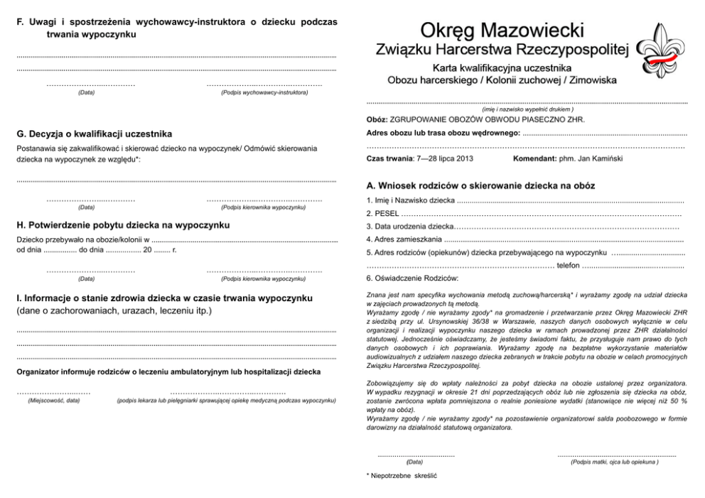 F. Uwagi i spostrzeżenia wychowawcy-instruktora o dziecku podczas trwania wypoczynku ……………………………………………………………………………………………………………………………………………….. ……………………………………………………………………………………………………………………………………………….. …………………...………… ………………..…………..…………. (Data) (Podpis wychowawcy-instruktora) ………………………………………………………………………………………………………………………………………………... (imię i nazwisko wypełnić drukiem ) Obóz: ZGRUPOWANIE OBOZÓW OBWODU PIASECZNO ZHR. G. Decyzja o kwalifikacji uczestnika Adres obozu lub trasa obozu wędrownego: ............................................................................... Postanawia się zakwalifikować i skierować dziecko na wypoczynek/ Odmówić skierowania dziecka na wypoczynek ze względu*: ………………………………………………………………………………………………………………. ……………………………………………………………………………………………………………………………………………….. …………………...………… (Data) ………………..…………..…………. (Podpis kierownika wypoczynku) Czas trwania: 7—28 lipca 2013 Komendant: phm. Jan Kamiński A. Wniosek rodziców o skierowanie dziecka na obóz 1. Imię i Nazwisko dziecka ............................................................................................................. 2. PESEL …………………………………………………………………………………………………. H. Potwierdzenie pobytu dziecka na wypoczynku 3. Data urodzenia dziecka……………………………………………………………………………… Dziecko przebywało na obozie/kolonii w …………………………………………………………………………………... od dnia ................ do dnia ................. 20 ........ r. 4. Adres zamieszkania ................................................................................................................... …………………...………… (Data) ………………..…………..…………. (Podpis kierownika wypoczynku) I. Informacje o stanie zdrowia dziecka w czasie trwania wypoczynku (dane o zachorowaniach, urazach, leczeniu itp.) ……………………………………………………………………………………………………………………………………………….. ……………………………………………………………………………………………………………………………………………….. ……………………………………………………………………………………………………………………………………………….. Organizator informuje rodziców o leczeniu ambulatoryjnym lub hospitalizacji dziecka …………………...…… ………………..…………..…………. (Miejscowość, data) (podpis lekarza lub pielęgniarki sprawującej opiekę medyczną podczas wypoczynku) 5. Adres rodziców (opiekunów) dziecka przebywającego na wypoczynku …................................ ………………………………………………………………… telefon …................................….......... 6. Oświadczenie Rodziców: Znana jest nam specyfika wychowania metodą zuchową/harcerską* i wyrażamy zgodę na udział dziecka w zajęciach prowadzonych tą metodą. Wyrażamy zgodę / nie wyrażamy zgody* na gromadzenie i przetwarzanie przez Okręg Mazowiecki ZHR z siedzibą przy ul. Ursynowskiej 36/38 w Warszawie, naszych danych osobowych wyłącznie w celu organizacji i realizacji wypoczynku naszego dziecka w ramach prowadzonej przez ZHR działalności statutowej. Jednocześnie oświadczamy, że jesteśmy świadomi faktu, że przysługuje nam prawo do tych danych osobowych i ich poprawiania. Wyrażamy zgodę na bezpłatne wykorzystanie materiałów audiowizualnych z udziałem naszego dziecka zebranych w trakcie pobytu na obozie w celach promocyjnych Związku Harcerstwa Rzeczypospolitej. Zobowiązujemy się do wpłaty należności za pobyt dziecka na obozie ustalonej przez organizatora. W wypadku rezygnacji w okresie 21 dni poprzedzających obóz lub nie zgłoszenia się dziecka na obóz, zostanie zwrócona wpłata pomniejszona o realnie poniesione wydatki (stanowiące nie więcej niż 50 % wpłaty na obóz). Wyrażamy zgodę / nie wyrażamy zgody* na pozostawienie organizatorowi salda poobozowego w formie darowizny na działalność statutową organizatora. ..................................... (Data) * Niepotrzebne skreślić ......................................................... (Podpis matki, ojca lub opiekuna ) B. Informacje rodziców o stanie zdrowia dziecka i szczepieniach C. Pieczęć szkoły (obowiązkowo) (prosimy udzielić niezbędnej informacji) 1. Imię i nazwisko dziecka ......................................................... Grupa krwi ................................. 2. Przebyte choroby (podać w którym roku życia) odra .................... ospa wietrzna ..................... różyczka............... świnka .................. szkarlatyna …............... WZW .............. astma ............... padaczka …................... alergie …................................................................................................ inne (podać trwające choroby przewlekle)...................................................................................... ………………………………………………………………………………………………………………. 3. Dziecko przeszło szczep