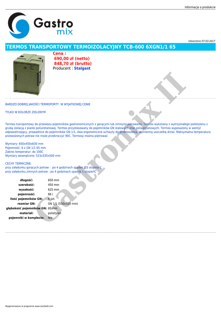 Informacje o produkcie Utworzono 07-03-2017 TERMOS TRANSPORTOWY TERMOIZOLACYJNY TCB-600 6XGN1/1 65 Cena : 690,00 zł (netto) 848,70 zł (brutto) II Producent : Stalgast BARDZO DOBREJ JAKOŚCI TERMOPORTY W WYJATKOWEJ CENIE ix TYLKO W KOLORZE ZIELONYM tr o Wymiary: 650x450x630 mm Pojemność: 6 x GN 1/1 65 mm Zakres temperatur: do 100C Wymiary wewnętrzne: 515x335x500 mm m Termos transportowy do przewozu pojemników gastronomicznych z gorącymi lub zimnymi potrawami. Termos wykonany z wytrzymałego polietylenu z grubą izolacją z pianki poliuretanowej. Termos przystosowany do pojemników GN stalowych oraz poliwęglanowych. Termos wyposażony w wentyl odpowietrzający, prowadnice do pojemników GN 1/1, dwa ergonomiczne uchwyty do przenoszenia, wymienną uszczelkę drzwi. Maksymalna temperatura przewożonych potraw nie może przekroczyć 90C. Termosy można piętrować. CECHY TERMICZNE: przy załadunku gorących potraw : po 4 godzinach spadek 1,5 stopnia C. przy załadunku zimnych potraw : po 4 godzinach spadek 1 stopieńC 650 mm 450 mm wysokość: pojemność: as długość: szerokość: ilość pojemników GN: rozmiar GN: 625 mm 86 l 6 szt. GN 1/1 (530x325 mm) G głębokość pojemników GN: 65 mm materiał: pojemniki w komplecie: polietylen Nie Wygenerowano w programie www.oscGold.com