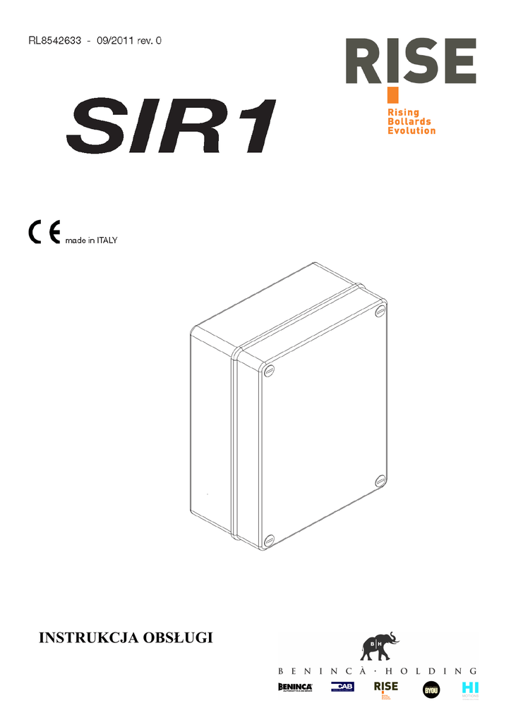 INSTRUKCJA OBSŁUGI Przełączniki DIP SWITCH Sygnalizacja zasilania impuls wyjściowy NO Potencjometr czułości zasilanie centralki SIR1 1) zasilanie centralki SIR1 – zaciski (POWER -/+) 24V ac/dc 2) impuls wyjściowy NO – zaciski SW1 3) ustawianie czułości urządzania – potencjometr SENSITIVITY DIP 1 „YLP”: Wykrywa tylko specjalne "dźwięki" syren, używany tylko w niektórych krajach DIP 1 „YDT”: Wykrywa wszystkie syreny lub dźwięki kontynuowane przez ponad 2,5 sek. (zalecane) DIP 2 „RLS”: Syrena nie koliduje z otwartym urządzeniem(zalecana) DIP 2 „LAT”: Po wykryciu syreny wyjście SW1 jest aktywne do momentu wciśnięcia przycisku RESET lub zrestartowania centrali SIR1. DIP 3 „MT”: Komenda „otwórz” jest aktywna (styk zwarty) przez kilka sekund (zalecane) DIP 3 „15M”: Komenda „otwórz” jest aktywna (styk zwarty) przez 15minut DIP 4 „+5S”: Dodaje 5 sekund do ustawień DIP3 (zalecane) DIP 4 „+5M”: Dodaje 5 minut do ustawień DIP3 DIP 5 „OFF”: Wciskając „RESET” wszystkie ustawienia są modyfikowane (zalecane) DIP 5 „PGM”: Wciskając „RESET” dodaje, do czasu zamknięcia styku SW1 ,dodatkowe 5 sekund lub 5 minut (w zależności od ustawień DIP 4) Beninca Polonia Sp. z o.o., Al. Jerozolimskie 271, 05-816 MICHAŁOWICE, [email protected] , tel. 22 723 90 99, 723 91 01 www. beninca.pl.