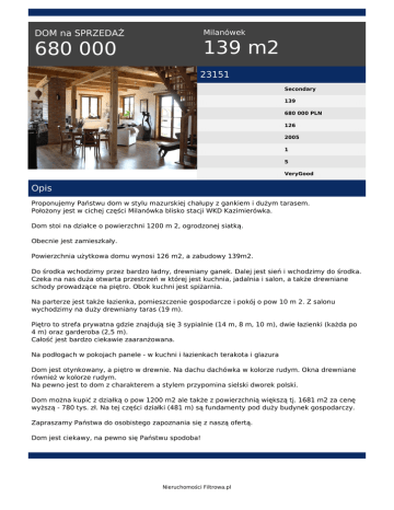 Milanówek DOM na SPRZEDAŻ 139 m2 680 000 23151 Secondary 139 680 000 PLN 126 2005 1 5 VeryGood Opis Proponujemy Państwu dom w stylu mazurskiej chałupy z gankiem i dużym tarasem. Położony jest w cichej części Milanówka blisko stacji WKD Kazimierówka. Dom stoi na działce o powierzchni 1200 m 2, ogrodzonej siatką. Obecnie jest zamieszkały. Powierzchnia użytkowa domu wynosi 126 m2, a zabudowy 139m2. Do środka wchodzimy przez bardzo ładny, drewniany ganek. Dalej jest sień i wchodzimy do środka. Czeka na nas duża otwarta przestrzeń w której jest kuchnia, jadalnia i salon, a także drewniane schody prowadzące na piętro. Obok kuchni jest spiżarnia. Na parterze jest także łazienka, pomieszczenie gospodarcze i pokój o pow 10 m 2. Z salonu wychodzimy na duży drewniany taras (19 m). Piętro to strefa prywatna gdzie znajdują się 3 sypialnie (14 m, 8 m, 10 m), dwie łazienki (każda po 4 m) oraz garderoba (2,5 m). Całość jest bardzo ciekawie zaaranżowana. Na podłogach w pokojach panele - w kuchni i łazienkach terakota i glazura Dom jest otynkowany, a piętro w drewnie. Na dachu dachówka w kolorze rudym. Okna drewniane również w kolorze rudym. Na pewno jest to dom z charakterem a stylem przypomina sielski dworek polski. Dom można kupić z działką o pow 1200 m2 ale także z powierzchnią większą tj. 1681 m2 za cenę wyższą - 780 tys. zł. Na tej części działki (481 m) są fundamenty pod duży budynek gospodarczy. Zapraszamy Państwa do osobistego zapoznania się z naszą ofertą. Dom jest ciekawy, na pewno się Państwu spodoba! Nieruchomości Filtrowa.pl Nieruchomości Filtrowa.pl tel. 602 109 102 email: [email protected] Nieruchomości Filtrowa.pl Powered by TCPDF (www.tcpdf.org)
