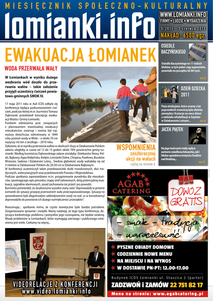 MIESIĘCZNIK SPOŁECZNO-KULTURALNY WWW.LOMIANKI.INFO FIRMY•LUDZIE•WYDARZENIA 5/2011 – 7 czerwca 2011 NAKŁAD: 6500 egz. EWAKUACJA ŁOMIANEK WODA PRZERWAŁA WAŁY W Łomiankach w wyniku dużego wezbrania wód doszło do przerwania wałów – takie założenie przyjęli uczestnicy ćwiczeń powiatowo-gminnych SMOK IV. Reasumując... spotkanie mimo, że czysto teoretyczne było bardzo potrzebne. Zorganizowane sprawnie i zwięźle. Mamy nadzieję, że tego typu konferencja, dotycząca konkretnego problemu i pomysłów jego rozwiązania, nie będzie ostatnią. Wszak problemów w Łomiankach, które wymagają szerszego i publicznego omówienia jest wiele. Czekamy na więcej... VIDEORELAC JE z konferencji www.video.lomianki.info Osiedle Baczyńskiego to 11 niskich bloków, w tym jeden ciąg segmentów, powstałe na początku lat 80-tych. str. 2 DZIEŃ DZIECKA 2011 Poza atrakcjami, które znamy z lat poprzednich nowością była zbiórka pieniędzy i licytacje na rzecz dzieci z oddziału rehabilitacji w Szpitalu w Dziekanowie Leśnym... str. 8 JACEK PIĄTEK Wspomnienia zeszłorocznej akcji na wałach czytaj na stronie 6 Na jego twórczość miały wpływ zarówno osiedlowa łobuzerka, jak i bliskie sąsiedztwo Instytutu Studiów nad Rodziną... str.17 REKLAMA 17 maja 2011 roku w Auli ICDS odbyła się konferencja będąca podsumowaniem ćwiczeń, podczas której m.in. burmistrz Tomasz Dąbrowski przedstawił koncepcję ewakuacji Miasta i Gminy Łomianki. Punktem odniesienia prac związanych z planowaniem ewentualnej ewakuacji mieszkańców, zwierząt i mienia był najwyższy dotychczas odnotowany w 1844 roku poziom wody w Wiśle – o około 70 cm wyżyszy niż ten z zeszłego – 2010 roku. Założono, że w wyniku przerwania wałów w okolicach śluzy w Dziakanowie Polskim zalaniu uległoby w czasie od 12 do 15 godzin około 70% powierzchni gminy Łomianki. Według burmistrza Dąbrowskiego zalane zostałyby: Dziekanów Nowy, Polski, Bajkowy, Kępa Kiełpińska, Kiełpin, Łomianki Dolne, Chopina, Pawłowo, Buraków Wrzosów, Sadowa i Dziakanów Leśny... Średnia głębokość wody wahałaby się od 3 metrów w Dziekanowie Polskim do 20-50 cm w Dziekanowie Bajkowym. W konferencji uczestniczyli także przedstawiciele służb mundurowych, służ medycznych, weterynaryjnych oraz przedstawiciele Powiatu i Województwa. Podczas spotkania zapowiedziano m.in. przygotowanie poradnika dla mieszkańców, zawierającego opis procedur, mapę stref zalewowych, dróg potencjalnej ewakuacji, sygnałów alarmowych, zasad zachowania się przed i po powodzi. Burmistrz potwierdził, że zeszłoroczne wysokie stany wód "doprowadziły w gmienie Łomianki do sytuacji grożącej przerwaniem wału przeciwpowodziowego. Sytuacja ta spowodowana była długotrwałym oddziaływaniem wody na wał, co w konsekwencji doprowadziło do powstania ich dużego rozmiękczenia i przesiąków". OSIEDLE BACZYŃSKIEGO INFORMATOR adresy,telefony... Urząd Miejski ul. Warszawska 115, t: 22 768 6300, ul. Warszawska 71, t: 22 768 6203 Policja ul. Warszawska 87, t: 24h: 22 751 1007, tel alarm: 997, kom: 112, Straż Miejska t: 24h: 22 751 3503, Pogototowie energetyczne t: 991, 22 774 2727 Pogototowie Gazowe t: 992, 022 628 4587, Straż pożarna t: 998, 22 751 3222 Pogotowie ratunkowe t: 999, Szpital dziecięcy w Dziek. Leśnym t: 22 751 3003 Nocna pomoc lekarska (20.00-8.00) ul. Żeromskiego 13, t: 22 834 2431 Przychodnie lekararskie S zpitalna 6, t: 22 751 1055; Warszawska 31, t: 22 751 6991; Wiślana 36, t: 22 250 1445 Apteki 22 751 3108, 22 751 5674, 22 751 0001, 22 751 3325, Apteka24h 22 834 5804 Zakład Wodociągów i Kanalizacji ul. Rolnicza 244, t: 22 751 3504, Komunikacja Miejska Łomianki ul. Rolnicza 248, t: 22 751 3379 Ośrodek Pomocy Społecznej ul. Szpitalna 7, t:: 22 751 9057, 22 751 4089 Starostwo Powiatu Warszawskiego Zachodniego t: 22 733 72 00 Filia Wydziału Komunikacji PWZ ul. Warszawska 73, 751 18 55 Poczta: Łomianki, 22 751 1035, Kiełpin 22 732 0303, Dąbrowa 22 751 8488 Dom Kultury w Łomiankach ul. Wiejska 12a, t: 22 751 7059, 22 751 3502 Biblioteka Publiczna w Łomiankach ul. Wiejska 12a, t: 022 751 3223, Integracyjne Centrum Dydaktyczno Sportowe ul. Staszica 2, t: 22 751 0474 Awarie oświetlenia ulicznego t: 0606 724 298, Awarie sygnalizacji świetlnej t: 0501 260 930 Awarie wodociągów i kanalizacji t: 22 751 0113 Informacja dla bezdomnych t: 9287 KALENDARIUM co gdzie kiedy... 10.06 – Jack & The Back Tracks – rock'n'rollowa uczta – koncert w Lemon Tree – g.20 11.06 – Integracyjna impreza dla dzieci – Łomianki Chopina – WIlczeniec – g.13-18 11.06 – Rajd rowerowy do Izabelina KPN – start g.9 przy ICDS 12.06 – Kabaret Tenor Czesław Jakubiec – Tarasowa Scena Kabaretowa ul.Żywiczna 24 – g.20 13.06 – Wieczór kabaretowy Emiliana Kamińskiego – ICDS – g.20 12.06 – Turniej Jednego Wiersza "Na strychu w Łomiankach" – organizator Dom Kultury – Aula ICDS – g.18 15.06 – Warsztaty artystyczne – Biżuteria koralikowa – Filia Domu Kultury Buraków – g.18 (zapisy) 16.06 – Karaoke – First club&restaurant – każdy czwartek – g.20 17.06 – Wieczór Szant i piosenki wędrownej, wernisaż wystawy współczesnego malarstwa pt. LATO – Kokko Art, ul. Pancerz 6 18.06. – Festyn Powitanie lata! – ICDS 19.06 –Integracyjna impreza dla dzieci – Kiełpin – placu zabaw w Kiełpinie przy ul. Cienistej – g.14-22 24.06 – Karaoke Night with DJ Marek – Lemon Tree – g.20 21.06 – Teatralne powitanie lata – Spektakle plenerowe na dziedzińcu Szkoły Podstawowej nr 1 w Łomiankach, g.15 – „Smok z Promienistej Krainy” Pracownia Teatralno-Plastyczna KOT z Wrocławia oraz Teatr Prawdziwy z Bielawy, g. 21.30 – „Siewca” Teatr A z Gliwic 25.06 – Gala MMA – eliminacje Mistrzostw Polski (impreza w trakcie organizacji) >>> więcej na www.LOMIANKI.INFO Niezbędnik Mieszkańca Łomianek Przyjazny i podręczny pomocnik, przewodnik i poradnik – tak w najw