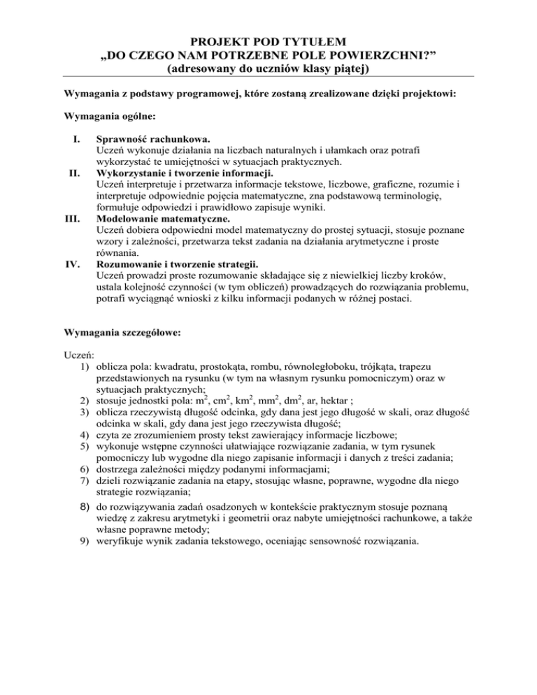 PROJEKT POD TYTUŁEM „DO CZEGO NAM POTRZEBNE POLE POWIERZCHNI?” (adresowany do uczniów klasy piątej) Wymagania z podstawy programowej, które zostaną zrealizowane dzięki projektowi: Wymagania ogólne: I. II. III. IV. Sprawność rachunkowa. Uczeń wykonuje działania na liczbach naturalnych i ułamkach oraz potrafi wykorzystać te umiejętności w sytuacjach praktycznych. Wykorzystanie i tworzenie informacji. Uczeń interpretuje i przetwarza informacje tekstowe, liczbowe, graficzne, rozumie i interpretuje odpowiednie pojęcia matematyczne, zna podstawową terminologię, formułuje odpowiedzi i prawidłowo zapisuje wyniki. Modelowanie matematyczne. Uczeń dobiera odpowiedni model matematyczny do prostej sytuacji, stosuje poznane wzory i zależności, przetwarza tekst zadania na działania arytmetyczne i proste równania. Rozumowanie i tworzenie strategii. Uczeń prowadzi proste rozumowanie składające się z niewielkiej liczby kroków, ustala kolejność czynności (w tym obliczeń) prowadzących do rozwiązania problemu, potrafi wyciągnąć wnioski z kilku informacji podanych w różnej postaci. Wymagania szczegółowe: Uczeń: 1) oblicza pola: kwadratu, prostokąta, rombu, równoległoboku, trójkąta, trapezu przedstawionych na rysunku (w tym na własnym rysunku pomocniczym) oraz w sytuacjach praktycznych; 2) stosuje jednostki pola: m2, cm2, km2, mm2, dm2, ar, hektar ; 3) oblicza rzeczywistą długość odcinka, gdy dana jest jego długość w skali, oraz długość odcinka w skali, gdy dana jest jego rzeczywista długość; 4) czyta ze zrozumieniem prosty tekst zawierający informacje liczbowe; 5) wykonuje wstępne czynności ułatwiające rozwiązanie zadania, w tym rysunek pomocniczy lub wygodne dla niego zapisanie informacji i danych z treści zadania; 6) dostrzega zależności między podanymi informacjami; 7) dzieli rozwiązanie zadania na etapy, stosując własne, poprawne, wygodne dla niego strategie rozwiązania; 8) do rozwiązywania zadań osadzonych w kontekście praktycznym stosuje poznaną wiedzę z zakresu arytmetyki i geometrii oraz nabyte umiejętności rachunkowe, a także własne poprawne metody; 9) weryfikuje wynik zadania tekstowego, oceniając sensowność rozwiązania. Cele projektu i kryteria ich osiągnięcia: Cele projektu (czego chcemy się dowiedzieć? co chcemy osiągnąć?) Kryteria do każdego z celów (po czym poznamy, że cel został osiągnięty −kryteria) Gdzie w życiu codziennym stosujesz pojęcie pola powierzchni figury? Potrafisz wymienić dziedziny życia, w których istnieje potrzeba obliczania pola powierzchni i podać konkretne przykłady zastosowania takich obliczeń. W jaki sposób obliczysz pola figur? Potrafisz podać wzory na pola czworokątów (prostokąta, kwadratu, równoległoboku, rombu i trapezu), trójkąta. Umiesz wykorzystasz te wzory do obliczania pól tych figur oraz wielokątów składających się z tych figur. Rozwiążesz problemy praktyczne związane z planowaniem inwestycji w różnych dziedzinach życia. Potrafisz obliczyć koszty związane np. z remontem domu, uprawą ziemi; ilości materiałów potrzebnych do realizacji przedsięwzięcia. Umiesz wybrać najkorzystniejszą ofertę zakupu działki lub mieszkania. Znasz jednostki pola i potrafisz je zamieniać. Opiszesz świat liczbami. Potrafisz porównać (korzystając z odpowiednich źródeł) powierzchnie lądów i mórz, terytoria państw. Odczytasz powierzchnię obszaru z mapy lub planu. Zmierzysz długości odcinków na mapie. Potrafisz obliczyć rzeczywistą odległość i pole. Pomysł na realizację projektu. W projekcie uczestniczy pięć grup uczniów. Każda grupa wylosuje dla siebie jeden problem z listy: 1. Pola figur – jak je obliczać? 2. Remont domu – co ma do tego pole powierzchni? 3. Co ma rolnik wspólnego z polem? 4. Jaka jest powierzchnia naszej Ziemi? 5. Kupuję działkę lub mieszkanie. Oprócz teoretycznego omówienia problemów, grupy przygotowałyby kilka zadań ilustrujących zagadnienia. Prezentacja projektu mogłaby odbyć się na lekcji powtórzeniowej dotyczącej pól wielokątów. Uczniowie nie biorący udziału w prezentowaniu efektów swojej pracy rozwiązywaliby zadania przygotowane przez kolegów. Narzędzia TIK: strony internetowe poświęcone zagadnieniom matematycznym, danym statystycznym, ogłoszeniom dotyczącym sprzedaży towarów, mieszkań itp.; PowerPoint lub Prezi; GeoGebra lub inny program graficzny; http://learningapps.org/ - aplikacje interaktywne; aparat fotograficzny, kamera cyfrowa; programy do obróbki zdjęć. Opracowała: Anna Bobrowska SP nr 1 w Opocznie