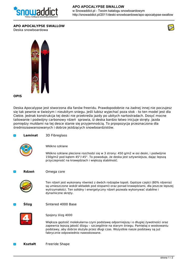 APO APOCALYPSE SWALLOW w Snowaddict.pl - Twoim katalogu snowboardowym http://snowaddict.pl/2011/deski-snowboardowe/apo-apocalypse-swallow APO APOCALYPSE SWALLOW Deska snowboardowa OPIS Deska Apocalypse jest stworzona dla fanów freeridu. Prawdopodobnie na żadnej innej nie poczujesz się tak pewnie w świeżym i nieubitym sniegu. Jeśli lubisz wyjechać poza stok - to ten model jest dla Ciebie. Jednak konstrukcja tej deski nie przekreśla jazdy po ubitych nartostradach. Dosyć mocne taliowanie i podwójny carbonowy rdzeń sprawia, iż deska bardzo łatwo inicjuje skręty. Jazda pomiędzy muldami na tej desce stanie się przyjemnością. To prpopozycja przeznaczona dla średniozaawansowanych i dobrze jeżdzących snowboardzistów. Laminat 3D Fibreglass Włókno szklane Włókno szklane plecione rozchodzi się w 3 strony: 450 g/m2 w osi deski, i podwójnie 150g/m2 pod kątem 45°/-45°. To powoduje, że deska jest sztywniejsza, dając lepszą przyczepność na krawędziach i większą stabilność. Rdzeń Omega core Ten rdzeń jest wykonany również z dwóch rodzajów topoli. Gęstsze części (80% rdzenia) są umieszczone wokół wkładek pod stopami) oraz ponad krawędziami, dla jeszcze lepszej wytrzymałości. Ten solidny i energetyczny rdzeń pozwala wykonywać stabilne i dynamiczne skręty. Ślizg Sintered 4000 Base Spojony ślizg 4000 Większa gęstość molekularna czyni podstawę odporniejszą i o długiej żywotności oraz zapewnia lepszą jakość ślizgu – szczególnie na starym śniegu. Pamiętaj o woskowaniu podstawy, aby dobrze służyła przez długi czas. Wszystkie nasze podstawy są już fabrycznie odpowiednio nawoskowane. Kształt Freeride Shape strona 1 / 2 APO APOCALYPSE SWALLOW w Snowaddict.pl - Twoim katalogu snowboardowym http://snowaddict.pl/2011/deski-snowboardowe/apo-apocalypse-swallow 100% Kierunkowy: Dłuższy, progresywny przód i bardziej miękki tył z większym promieniem skrętu czyni deski o freeridowym kształcie bardziej stabilne i wydajne na i poza stokami. Profil Classic camber Snowboard zaczął się rozwijać przy użyciu klasycznego wygięcia - classic camber. Wygięte deski są tak zrobione aby nimi jeździć wszędzie, oferując dobrą kontrolę, dynamiczność, precyzją i siłę. Flex 9 Długości 186 Wymiary KE 1310mm ST 254mm PS 12.0m SB - KE - krawędź efektywna ST - szerokość talii PS - promień skrętu SB - setback Płeć Mężczyźni Więcej na temat tego produktu pod adresem: http://snowaddict.pl/2011/deski-snowboardowe/apo-apocalypse-swallow Dokument PDF pochodzi ze Snowaddict.pl - Twój katalog snowboardowy Data i czas pobrania dokumentu: 2017-03-07 23:36:56 © 2011-2017 Snowaddict.pl - Twój katalog snowboardowy strona 2 / 2 Powered by TCPDF (www.tcpdf.org)