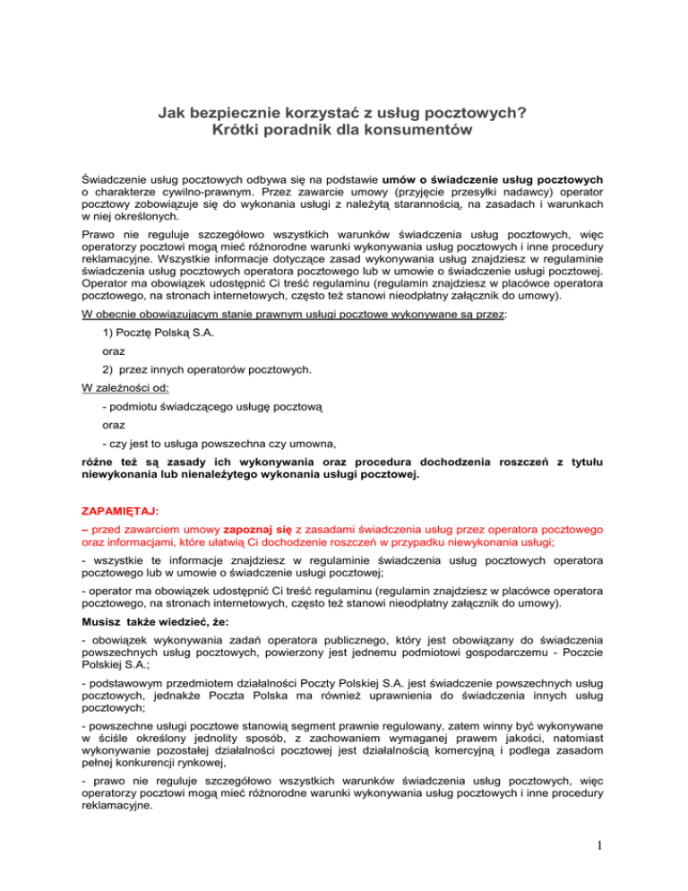 Jak bezpiecznie korzystać z usług pocztowych? Krótki poradnik dla konsumentów Świadczenie usług pocztowych odbywa się na podstawie umów o świadczenie usług pocztowych o charakterze cywilno-prawnym. Przez zawarcie umowy (przyjęcie przesyłki nadawcy) operator pocztowy zobowiązuje się do wykonania usługi z naleŜytą starannością, na zasadach i warunkach w niej określonych. Prawo nie reguluje szczegółowo wszystkich warunków świadczenia usług pocztowych, więc operatorzy pocztowi mogą mieć róŜnorodne warunki wykonywania usług pocztowych i inne procedury reklamacyjne. Wszystkie informacje dotyczące zasad wykonywania usług znajdziesz w regulaminie świadczenia usług pocztowych operatora pocztowego lub w umowie o świadczenie usługi pocztowej. Operator ma obowiązek udostępnić Ci treść regulaminu (regulamin znajdziesz w placówce operatora pocztowego, na stronach internetowych, często teŜ stanowi nieodpłatny załącznik do umowy). W obecnie obowiązującym stanie prawnym usługi pocztowe wykonywane są przez: 1) Pocztę Polską S.A. oraz 2) przez innych operatorów pocztowych. W zaleŜności od: - podmiotu świadczącego usługę pocztową oraz - czy jest to usługa powszechna czy umowna, róŜne teŜ są zasady ich wykonywania oraz procedura dochodzenia roszczeń z tytułu niewykonania lub nienaleŜytego wykonania usługi pocztowej. ZAPAMIĘTAJ: – przed zawarciem umowy zapoznaj się z zasadami świadczenia usług przez operatora pocztowego oraz informacjami, które ułatwią Ci dochodzenie roszczeń w przypadku niewykonania usługi; - wszystkie te informacje znajdziesz w regulaminie świadczenia usług pocztowych operatora pocztowego lub w umowie o świadczenie usługi pocztowej; - operator ma obowiązek udostępnić Ci treść regulaminu (regulamin znajdziesz w placówce operatora pocztowego, na stronach internetowych, często teŜ stanowi nieodpłatny załącznik do umowy). Musisz takŜe wiedzieć, Ŝe: - obowiązek wykonywania zadań operatora publicznego, który jest obowiązany do świadczenia powszechnych usług pocztowych, powierzony jest jednemu podmiotowi gospodarczemu - Poczcie Polskiej S.A.; - podstawowym przedmiotem działalności Poczty Polskiej S.A. jest świadczenie powszechnych usług pocztowych, jednakŜe Poczta Polska ma równieŜ uprawnienia do świadczenia innych usług pocztowych; - powszechne usługi pocztowe stanowią segment prawnie regulowany, zatem winny być wykonywane w ściśle określony jednolity sposób, z zachowaniem wymaganej prawem jakości, natomiast wykonywanie pozostałej działalności pocztowej jest działalnością komercyjną i podlega zasadom pełnej konkurencji rynkowej, - prawo nie reguluje szczegółowo wszystkich warunków świadczenia usług pocztowych, więc operatorzy pocztowi mogą mieć róŜnorodne warunki wykonywania usług pocztowych i inne procedury reklamacyjne. 1 I. Odpowiedzialność operatora publicznego w zakresie powszechnych usług pocztowych W przypadku niewywiązania się z zawartej z nadawcą umowy podlega on odpowiedzialności za niewykonanie lub nienaleŜyte wykonanie usługi pocztowej. JednakŜe UWAGA - odpowiedzialność operatora publicznego wobec klientów z tytułu świadczenia powszechnej usługi pocztowej jest ograniczona do przypadków określonych w ustawie, a odszkodowanie przysługuje: 1) za utratę przesyłki poleconej - w wysokości Ŝądanej przez nadawcę, nie wyŜszej jednak niŜ pięćdziesięciokrotność opłaty pobranej przez operatora publicznego za traktowanie przesyłki jako przesyłki poleconej; 2) za utratę paczki pocztowej - w wysokości Ŝądanej przez nadawcę, nie wyŜszej jednak niŜ dziesięciokrotność opłaty pobranej za jej nadanie; 3) za utratę przesyłki z zadeklarowaną wartością - w wysokości Ŝądanej przez nadawcę, nie wyŜszej jednak niŜ zadeklarowana wartość przesyłki; 4) za ubytek zawartości lub uszkodzenie paczki pocztowej lub przesyłki poleconej w wysokości Ŝądanej przez nadawcę lub w wysokości zwykłej wartości utraconych lub uszkodzonych rzeczy, nie wyŜszej jednak niŜ maksymalna wysokość odszkodowania, o którym mowa w pkt 1 lub 2; 5) za ubytek zawartości przesyłki z zadeklarowaną wartością - w wysokości zwykłej wartości utraconych rzeczy; 6) za uszkodzenie zawartości przesyłki z zadeklarowaną wartością - w wysokości zwykłej wartości rzeczy, których uszkodzenie stwierdzono. W przypadku niezrealizowania przekazu pocztowego przysługuje odszkodowanie w wysokości pięciokrotnej opłaty pobranej za jego nadanie. Ponadto zwrotowi podlega kwota pienięŜna określona w przekazie pocztowym. W razie niewykonania usługi operator, niezaleŜnie od naleŜnego odszkodowania, zwraca w całości opłatę pobraną za wykonanie usługi. JeŜeli droga postępowania reklamacyjnego została wyczerpana, to spór konsumenta z Pocztą Polską ma charakter cywilnoprawny i moŜe zostać rozstrzygnięty w drodze postępowania mediacyjnego, postępowania przed stałym polubownym sądem konsumenckim przy Prezesie Urzędu Komunikacji Elektronicznej lub w drodze postępowania cywilnego przed sądem powszechnym. Drogę postępowania reklamacyjnego uwaŜa się za wyczerpaną w przypadku: - odmowy uznania reklamacji przez operatora albo - niezapłacenia dochodzonej naleŜności w terminie 90 dni od dnia wniesienia reklamacji. Kiedy moŜna wnieść reklamację? Prawo przewiduje kilka przypadków, kiedy moŜesz wnieść reklamacje w kwestiach pocztowych: 2 • Kiedy Twoja przesyłka rejestrowana lub zawiadomienie o jej próbie (np. list polecony) nie zostały doręczone w ciągu 14 dni roboczych, wówczas juŜ 15 dnia moŜesz wnieść Twoją reklamację, nie później jednak niŜ w terminie 12 miesięcy od dnia ich nadania. • Kiedy doręczenie kwoty pienięŜnej określonej w przekazie pocztowym lub zawiadomienia o próbie doręczenia tej kwoty nie nastąpiło w terminie 14 dni od dnia nadania, wówczas juŜ 15 dnia moŜesz wnieś