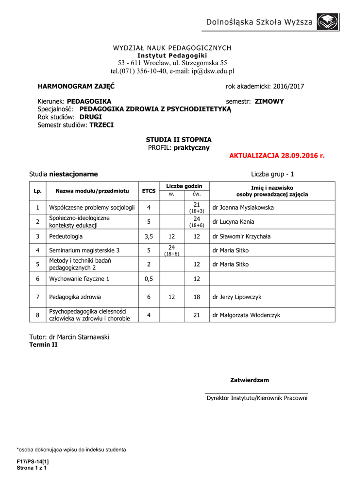 WYDZIAŁ NAUK PEDAGOGICZNYCH In st y tu t P e da g og ik i 53 - 611 Wrocław, ul. Strzegomska 55 tel.(071) 356-10-40, e-mail: [email protected] HARMONOGRAM ZAJĘĆ rok akademicki: 2016/2017 Kierunek: PEDAGOGIKA semestr: ZIMOWY Specjalność: PEDAGOGIKA ZDROWIA Z PSYCHODIETETYKĄ Rok studiów: DRUGI Semestr studiów: TRZECI STUDIA II STOPNIA PROFIL: praktyczny AKTUALIZACJA 28.09.2016 r. Studia niestacjonarne Liczba grup - 1 Liczba godzin w. ćw. Lp. Nazwa modułu/przedmiotu ETCS 1 Współczesne problemy socjologii 4 2 Społeczno-ideologiczne konteksty edukacji 5 3 Pedeutologia 4 Seminarium magisterskie 3 5 5 Metody i techniki badań pedagogicznych 2 2 12 6 Wychowanie fizyczne 1 0,5 12 7 Pedagogika zdrowia 6 8 Psychopedagogika cielesności człowieka w zdrowiu i chorobie 4 3,5 21 dr Joanna Mysiakowska 24 dr Lucyna Kania 12 dr Sławomir Krzychała (18+3) (18+6) 12 24 dr Maria Sitko (18+6) 12 Imię i nazwisko osoby prowadzącej zajęcia dr Maria Sitko 18 dr Jerzy Lipowczyk 21 dr Małgorzata Włodarczyk Tutor: dr Marcin Starnawski Termin II Zatwierdzam ________________________________ Dyrektor Instytutu/Kierownik Pracowni *osoba dokonująca wpisu do indeksu studenta F17/PS-14[1] Strona 1 z 1 Pedagogika zdrowia z psychodietetyką 2 rok 3 semestr – II stopień 9.00 – 11.15 sobota 24.09.16 r. Tutorial dr M. Starnawski s.34 ul. SZKOCKA 64 niedziela 25.09.16 r. sobota 8.10.16 r. 9.00 – 11.15 Pedagogika zdrowia wykład (1) dr J. Lipowczyk s. 34 ul. SZKOCKA 64 niedziela 9.10.16 r. niedziela 23.10.16 r. Zjazd nr 2 (8, 9 października 2016 r.) 11.30 – 13.45 14.00 - 16.15 Pedagogika zdrowia Współczesne problemy ćwiczenia socjologii (1) (2) dr J. Lipowczyk dr J. Mysiakowska s. 34 s. 34 ul. SZKOCKA 64 ul. SZKOCKA 64 Pedeutologia wykład (1) dr S. Krzychała s. 27 aula ul. Strzegomska 55 9.00 – 11.15 sobota 22.10.16 r. Zjazd nr 1 (24, 25 września 2016 r.) 11.30 – 13.45 14.00 - 16.15 Metody i techniki badań Metody i techniki badań pedagogicznych2 pedagogicznych2 (1) (2) dr M. Sitko dr M. Sitko s. 34 s. 34 ul. SZKOCKA 64 ul. SZKOCKA 64 Psychopedagogika Społeczno-ideologiczne cielesności człowieka w konteksty edukacji zdrowiu i chorobie (1) (1) dr L. Kania dr M. Włodarczyk s. 34 s. 34 ul. SZKOCKA 64 ul. SZKOCKA 64 WF ul. Szkocka 64 Zjazd nr 3 (22, 23 października 2016 r.) 11.30 – 13.45 14.00 - 16.15 Pedagogika zdrowia Psychopedagogika wykład cielesności człowieka w (2) zdrowiu i chorobie dr J. Lipowczyk (2) s. 34 dr M. Włodarczyk ul. SZKOCKA 64 s. 34 ul. SZKOCKA 64 Pedeutologia Społeczno-ideologiczne wykład konteksty edukacji (2) (2) dr S. Krzychała dr L. Kania s. 27 aula s. 106 ul. Strzegomska 55 ul. Strzegomska 55 16.30 - 18.45 Seminarium magisterskie3 (1) dr M. Sitko s. 34 ul. SZKOCKA 64 Współczesne problemy socjologii (1) dr J. Mysiakowska s. 34 ul. SZKOCKA 64 16.30 - 18.45 WF ul. Szkocka 64 16.30 - 18.45 Pedeutologia ćwiczenia (1) dr S. Krzychała s. 34 ul. SZKOCKA 64 Współczesne problemy socjologii (3) dr J. Mysiakowska s. 106 ul. Strzegomska 55 Pedagogika zdrowia z psychodietetyką 2 rok 3 semestr – II stopień sobota 5.11.16 r. niedziela 6.11.16 r. sobota 26.11.16 r. niedziela 27.11.16 r. sobota 10.12.16 r. niedziela 11.12.16 r. 9.00 – 11.15 Pedeutologia wykład (3) dr S. Krzychała s. 27 aula ul. Strzegomska 55 Współczesne problemy socjologii (4) dr J. Mysiakowska s. 34 ul. SZKOCKA 64 9.00 – 11.15 Pedeutologia ćwiczenia (2) dr S. Krzychała s. 34 ul. SZKOCKA 64 Seminarium magisterskie3 (3) dr M. Sitko s. 07 ul. Strzegomska 47 9.00 – 11.15 Pedagogika zdrowia wykład (3) dr J. Lipowczyk s. 106 ul. Strzegomska 55 Współczesne problemy socjologii (6) dr J. Mysiakowska s. 34 ul. SZKOCKA 64 Zjazd nr 4 (5, 6 listopada 2016 r.) 11.30 – 13.45 14.00 - 16.15 Psychopedagogika Metody i techniki badań cielesności człowieka w pedagogicznych2 zdrowiu i chorobie (3) (3) dr M. Sitko dr M. Włodarczyk s. 106 s. 106 ul. Strzegomska 55 ul. Strzegomska 55 Społeczno-ideologiczne WF konteksty edukacji ul. Szkocka 64 (3) dr L. Kania s. 34 ul. SZKOCKA 64 Zjazd nr 5 (26, 27 listopada 2016 r.) 11.30 – 13.45 14.00 - 16.15 Psychopedagogika Psychopedagogika cielesności człowieka w cielesności człowieka w zdrowiu i chorobie zdrowiu i chorobie (4) (5) dr M. Włodarczyk dr M. Włodarczyk s. 34 s. 34 ul. SZKOCKA 64 ul. SZKOCKA 64 Pedagogika zdrowia Metody i techniki badań ćwiczenia pedagogicznych2 (2) (4) dr J. Lipowczyk dr M. Sitko s. 07 s. 07 ul. Strzegomska 47 ul. Strzegomska 47 Zjazd nr 6 (10, 11 grudnia 2016 r.) 11.30 – 13.45 14.00 - 16.15 Pedagogika zdrowia ćwiczenia Seminarium magisterskie3 (3) (4) dr J. Lipowczyk dr M. Sitko s. 106 s. 106 ul. Strzegomska 55 ul. Strzegomska 55 Społeczno-ideologiczne konteksty edukacji (5) dr L. Kania s. 34 ul. SZKOCKA 64 Społeczno-ideologiczne konteksty edukacji (6) dr L. Kania s. 34 ul. SZKOCKA 64 16.30 - 18.45 Seminarium magisterskie3 (2) dr M. Sitko s. 106 ul. Strzegomska 55 WF ul. Szkocka 64 16.30 - 18.45 Społeczno-ideologiczne konteksty edukacji (4) dr L. Kania s. 34 ul. SZKOCKA 64 Współczesne problemy socjologii (5) dr J. Mysiakowska s. 07 ul. Strzegomska 47 16.30 - 18.45 Pedeutologia wykład (4) dr S. Krzychała s. 27 aula ul. Strzegomska 55 Pedagogika zdrowia z psychodietetyką 2 rok 3 semestr – II stopień sobota 7.01.17 r. niedziela 8.01.17 r. 9.00 – 11.15 Pedagogika zdrowia wykład (4) dr J. Lipowczyk s. 34 ul. SZKOCKA 64 Seminarium magisterskie3 (5) dr M. Sitko s. 212 ul. Strzegomska 47 9.00 – 11.15 sobota 21.01.17 r. niedziela 22.01.17 r. Seminarium magisterskie3 (6) dr M. Sitko s. 34 ul. SZKOCKA 64 Pedeutologia ćwiczenia (3) dr S. Krzychała s. 34 ul. SZKOCKA 64 9.00 – 11.15 sobota 04.02.17 r. niedziela 05.02.17 r. X Zjazd nr 7 (7, 8 stycznia 2017 r.) 11.30 – 13.45 14.00 - 16.15 Pedagogika zdrowia Psychopedagogika ćwiczenia cielesności człowieka w (4) zdrowiu i chorobie dr J. Lipowczyk (6) s. 34 dr M. Włodarczyk ul. SZKOCKA 64 s. 34 ul. SZKOCKA 64 Pedeutologia Współczesne problemy ćwiczenia s