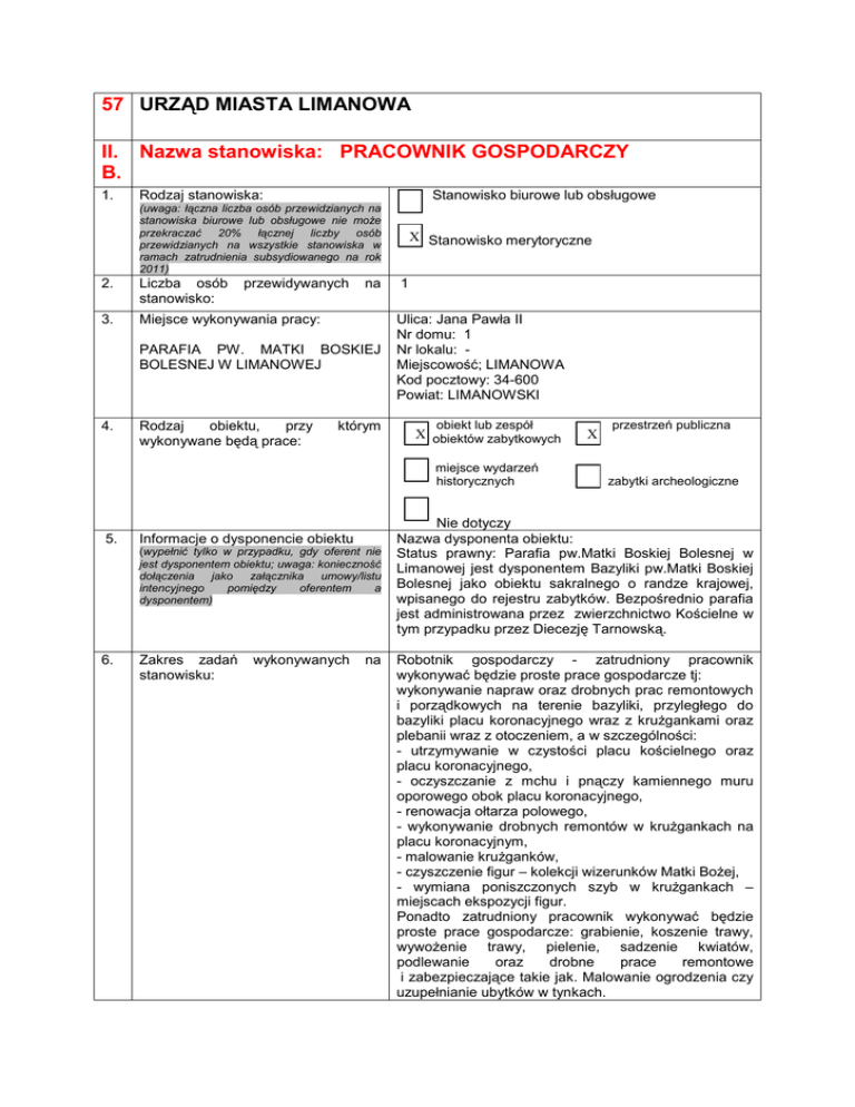 57 URZĄD MIASTA LIMANOWA II. Nazwa stanowiska: PRACOWNIK GOSPODARCZY B. 1. Rodzaj stanowiska: Stanowisko biurowe lub obsługowe (uwaga: łączna liczba osób przewidzianych na stanowiska biurowe lub obsługowe nie może przekraczać 20% łącznej liczby osób przewidzianych na wszystkie stanowiska w ramach zatrudnienia subsydiowanego na rok 2011) 2. Liczba osób stanowisko: przewidywanych 3. Miejsce wykonywania pracy: na PARAFIA PW. MATKI BOSKIEJ BOLESNEJ W LIMANOWEJ 4. Rodzaj obiektu, przy wykonywane będą prace: którym X Stanowisko merytoryczne 1 Ulica: Jana Pawła II Nr domu: 1 Nr lokalu: Miejscowość; LIMANOWA Kod pocztowy: 34-600 Powiat: LIMANOWSKI obiekt lub zespół X obiektów zabytkowych miejsce wydarzeń historycznych 5. Informacje o dysponencie obiektu (wypełnić tylko w przypadku, gdy oferent nie jest dysponentem obiektu; uwaga: konieczność dołączenia jako załącznika umowy/listu intencyjnego pomiędzy oferentem a dysponentem) 6. Zakres zadań stanowisku: wykonywanych na X przestrzeń publiczna zabytki archeologiczne Nie dotyczy Nazwa dysponenta obiektu: Status prawny: Parafia pw.Matki Boskiej Bolesnej w Limanowej jest dysponentem Bazyliki pw.Matki Boskiej Bolesnej jako obiektu sakralnego o randze krajowej, wpisanego do rejestru zabytków. Bezpośrednio parafia jest administrowana przez zwierzchnictwo Kościelne w tym przypadku przez Diecezję Tarnowską. Robotnik gospodarczy - zatrudniony pracownik wykonywać będzie proste prace gospodarcze tj: wykonywanie napraw oraz drobnych prac remontowych i porządkowych na terenie bazyliki, przyległego do bazyliki placu koronacyjnego wraz z krużgankami oraz plebanii wraz z otoczeniem, a w szczególności: - utrzymywanie w czystości placu kościelnego oraz placu koronacyjnego, - oczyszczanie z mchu i pnączy kamiennego muru oporowego obok placu koronacyjnego, - renowacja ołtarza polowego, - wykonywanie drobnych remontów w krużgankach na placu koronacyjnym, - malowanie krużganków, - czyszczenie figur – kolekcji wizerunków Matki Bożej, - wymiana poniszczonych szyb w krużgankach – miejscach ekspozycji figur. Ponadto zatrudniony pracownik wykonywać będzie proste prace gospodarcze: grabienie, koszenie trawy, wywożenie trawy, pielenie, sadzenie kwiatów, podlewanie oraz drobne prace remontowe i zabezpieczające takie jak. Malowanie ogrodzenia czy uzupełnianie ubytków w tynkach. 7. Na ile planowane stanowisko wpisuje się w strategię działania wnioskodawcy, w tym w nowe projekty i inicjatywy? Wykorzystywanie Sanktuarium jako miejsca kultu religijnego oraz obiektu zabytkowego o randze krajowej do wzrostu ruchu pielgrzymkowego i turystycznego w Polsce. Sanktuarium Matki Boskiej Bolesnej w Limanowej jest niewątpliwie jedną z atrakcji turystycznych miasta i powiatu limanowskiego, które od lat przyciąga pielgrzymów zorganizowanych, jak i indywidualnych. Główna przyczyną dla której do Limanowej co roku pielgrzymują setki osób jest oczywiście łaskami słynąca figura Matki Boskiej Bolesnej. Przyciąga również sama bazylika jako ciekawy obiekt architektury początku XX wieku. Ponieważ obiekt stanowi cenny zabytek koniecznym jest staranie się o jego renowacje, odnowienie i drobne remonty. Z roku na rok obiekty w tym i otoczenie bazyliki niszczeją i wymagają drobnych napraw. Ponieważ zaleceń remontowych jest bardzo dużo niezbędnym staje się zaangażowanie co najmniej kilku osób do prac gospodarczych. Oczekiwania, co do wymagań kwalifikacyjnych: 8. Wykształcenie: Niezbędne: ZAWODOWE Niezbędne: Praktyki zawodowe Niezbędne: ŚREDNIE Niezbędne: Praktyki zawodowe 9. Doświadczenie zawodowe: 10. Umiejętności: Niezbędne: Wykonywanie prac remontowo-konserwatorskich i porządkowych Niezbędne: Wykonywanie prac remontowokonserwatorskich i porządkowych 11. Cechy osobowe: Niezbędne: KOMUNIKATYWNOŚC, KREATYWNOŚĆ, Pożądane: POMYSŁOWOŚC INNOWACYJNOŚĆ 12. Oferta jest kierowana również do osób z niepełnosprawnością Tak X Nie Wstępne wymagania dotyczące sprawności kandydata (np. stopień sprawności fizycznej, intelektualnej, wzroku, słuchu, odporność na stres itp.) 13. Umiejętności, które osoba nabędzie na stanowisku: Efektem pracy zatrudnionej osoby będzie zagospodarowanie otoczenia bazyliki i bezpośredniego otoczenia oraz placu koronacyjnego z krużgankami, W/w czynności pozwolą osobie zatrudnionej na nabycie umiejętności pracy przy obiekcie użyteczności w tym przy zabytkowym obiekcie sakralnym. 14. Sposób wprowadzenia osoby na stanowisko (szkolenia wewnętrzne, instruktaże): Szkolenie podstawowe - pierwotne oraz codzienne instruktaże przez osobę nadzorującą tj. Proboszcza Limanowskiej Parafii. 15. Sposób nadzoru/ monitorowania pracy na stanowisku: 16. Sposób organizacji pracy – czas pracy, np. Czy stanowisko wymaga dyspozycyjności w soboty/ niedzielę/ święta? Codzienny nadzór stałych pracowników oraz okresowa (cotygodniowa)analiza efektów pracy. Osobą nadzorującą pracę zatrudnionej w programie osoby będzie: Ks.dr Wiesław Piotrowski – Proboszcz Parafii . Stanowisko nie wymaga pracy w soboty i niedziele. Przewidywany czas pracy zatrudnionego to : Poniedziałek – piątek od godz. 8.00 do 16.00 17. Czy istnieje możliwość zatrudnienia przez Wnioskodawcę po zatrudnieniu subsydiowanym? W stosunku do ilu osób zgłaszanych na stanowisko objęte niniejszą ofertą Wnioskodawca deklaruje możliwość zatrudnienia. 18. Dodatkowe informacje, które mogą być istotne przy ocenie oferty: X Tak Nie Liczba osób: 2 Bazylika pw.Matki Boskiej Bolesnej w Limanowej jest obiektem sakralnym , wpisanym do rejestru zabytków. Zespół Bazyliki Matki Boskiej Bolesnej i obiektów sanktuaryjnych - Bazylika Matki Boskiej Bolesnej wzniesiona została w latach 1912-1918 według projektu architekta Zdzisława Mączeńskiego, jako pomnik 100lecia Konstytucji 3-Maja. Monumentalności budowli nadaje kamienna wykładzina ścian zewnętrznych oraz 65 metrowa wieża nakr