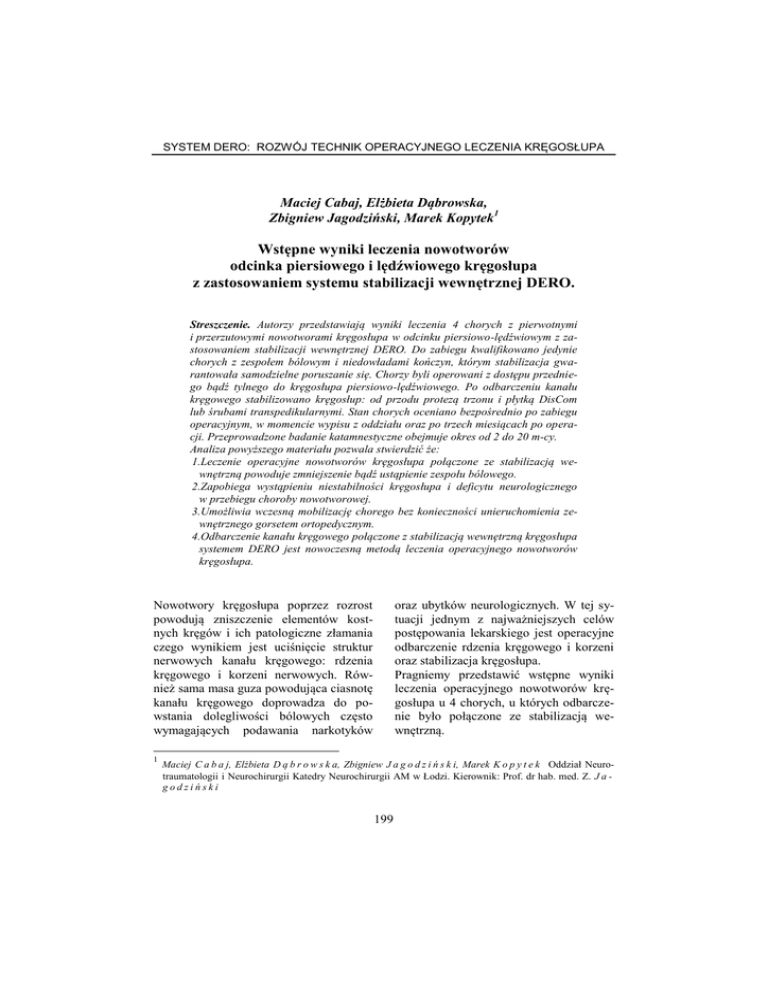 SYSTEM DERO: ROZWÓJ TECHNIK OPERACYJNEGO LECZENIA KRĘGOSŁUPA Maciej Cabaj, Elżbieta Dąbrowska, Zbigniew Jagodziński, Marek Kopytek1 Wstępne wyniki leczenia nowotworów odcinka piersiowego i lędźwiowego kręgosłupa z zastosowaniem systemu stabilizacji wewnętrznej DERO. Streszczenie. Autorzy przedstawiają wyniki leczenia 4 chorych z pierwotnymi i przerzutowymi nowotworami kręgosłupa w odcinku piersiowo-lędźwiowym z zastosowaniem stabilizacji wewnętrznej DERO. Do zabiegu kwalifikowano jedynie chorych z zespołem bólowym i niedowładami kończyn, którym stabilizacja gwarantowała samodzielne poruszanie się. Chorzy byli operowani z dostępu przedniego bądź tylnego do kręgosłupa piersiowo-lędźwiowego. Po odbarczeniu kanału kręgowego stabilizowano kręgosłup: od przodu protezą trzonu i płytką DisCom lub śrubami transpedikularnymi. Stan chorych oceniano bezpośrednio po zabiegu operacyjnym, w momencie wypisu z oddziału oraz po trzech miesiącach po operacji. Przeprowadzone badanie katamnestyczne obejmuje okres od 2 do 20 m-cy. Analiza powyższego materiału pozwala stwierdzić że: 1.Leczenie operacyjne nowotworów kręgosłupa połączone ze stabilizacją wewnętrzną powoduje zmniejszenie bądź ustąpienie zespołu bólowego. 2.Zapobiega wystąpieniu niestabilności kręgosłupa i deficytu neurologicznego w przebiegu choroby nowotworowej. 3.Umożliwia wczesną mobilizację chorego bez konieczności unieruchomienia zewnętrznego gorsetem ortopedycznym. 4.Odbarczenie kanału kręgowego połączone z stabilizacją wewnętrzną kręgosłupa systemem DERO jest nowoczesną metodą leczenia operacyjnego nowotworów kręgosłupa. Nowotwory kręgosłupa poprzez rozrost powodują zniszczenie elementów kostnych kręgów i ich patologiczne złamania czego wynikiem jest uciśnięcie struktur nerwowych kanału kręgowego: rdzenia kręgowego i korzeni nerwowych. Również sama masa guza powodująca ciasnotę kanału kręgowego doprowadza do powstania dolegliwości bólowych często wymagających podawania narkotyków 1 oraz ubytków neurologicznych. W tej sytuacji jednym z najważniejszych celów postępowania lekarskiego jest operacyjne odbarczenie rdzenia kręgowego i korzeni oraz stabilizacja kręgosłupa. Pragniemy przedstawić wstępne wyniki leczenia operacyjnego nowotworów kręgosłupa u 4 chorych, u których odbarczenie było połączone ze stabilizacją wewnętrzną. Maciej C a b a j, Elżbieta D ą b r o w s k a, Zbigniew J a g o d z i ń s k i, Marek K o p y t e k Oddział Neurotraumatologii i Neurochirurgii Katedry Neurochirurgii AM w Łodzi. Kierownik: Prof. dr hab. med. Z. J a godziński 199 200 M. Cabaj, E. Dąbrowska, Z. Jagodziński, M. Kopytek Materiał i metoda Od września 95 do grudnia 96 operowano 4 chorych (2 kobiety i 2 mężczyzn) w wieku od 52 do 70 lat z chorobą nowotworową kręgosłupa. Pacjenci byli skierowani do naszego oddziału z oddziałów ortopedycznych, gdzie rozpoznano złamanie kręgosłupa. Zmiany o typie złamania patologicznego zloklizowane były w 3 przypadkach w odcinku piersiowym kręgosłupa i w 1 przypadku w odcinku lędźwiowym (tab.1) Tab. 1. Lokalizacja złamania Poziom złamania Trzon Th3 Trzon Th 11 Trzon L4 Liczba chorych 1 2 1 śmy chorych, którym zabieg gwarantował częściową lub pełną samodzielność. W chwili przyjęcia do oddziału chorzy byli w średnim stanie ogólnym, cierpieli z powodu dużego zespołu bólowego (2 stopnia wg. WHO). Stan neurologiczny pacjentów przedstawia tabela: Tab.2. Stan neurologiczny przedoperacyjny Zespół neurologiczny Niedowład k. dolnych typ C Niedowład k. dolnych typ E Zaburzenia zwieraczy Liczba chorych 3 1 1 niedowład oceniano wg. skali Frankela . Chorych operowano z dostępu przedniego w jednym przypadku i w trzech przypadkach z dostępu tylnego do kręgosłupa. Przy wyborze metody operacyjnej kierowaliśmy się lokalizacją zmiany, jej rozległością oraz stanem ogólnym chorego. W przypadku zmiany zlokalizowanej w trzonie L4, z dostępu przedniego wykonaliśmy resekcję trzonu oraz stabilizację przednią przy pomocy protezy trzonu i zestawu DisCom firmy LfC - ryc. 2 a i b. Ryc.1. Rtg. - projekcje typowe AP i boczne. Przerzut nowotworowy L4. Ognisko pierwotne było znane tylko w jednym przypadku i było to Ca mammae. Chorzy byli zdiagnozowani radiologicznie przy pomocy zdjęć konwencjonalnych w projekcji przednio-tylnej oraz bocznej. Dodatkowo wykonaliśmy badanie CT i MRI kręgosłupa celem określenia charakteru i rozległośc i zmiany oraz oceny stopnia zwężenia kanału kręgowego. Do leczenia operacyjnego kwalifikowali- Ryc. 2. Resekcja trzonu - stabilizacja przy pomocy protezy trzonu oraz zestawem DERO DisCom . W pozostałych trzech przypadkach zmian położonych w trzonach Th3 i Th11, z dostępu tylnego wykonaliśmy laminektomię, Wstępne wyniki leczenia nowotworów odcinka piersiowego i lędźwiowego kręgosłupa ... odbarczenie rdzenia kręgowego i korzeni nerwowych oraz stabilizację transpedikularną zestawem DERO. Usunięte tkanki poddano badaniu histopatologicznemu. Chorych uruchamiano w trzeciej dobie po zabiegu operacyjnym, wszystkich poddano wczesnej i intensywnej rehabilitacji przyłóżkowej. Wyniki Średni okres pobytu w oddziale wynosił 14 dni. W tym okresie u wszystkich chorych ustąpiły dolegliwości bólowe kręgosłupa, objawy neurologiczne pozostały niezmienione. Chorych wypisano do oddziałów rehabilitacyjnych celem dalszego leczenia. Wyniki badań histopatologicznych przedstawia tabela: Tab. 3. Rozpoznanie histopatologiczne Wynik hist.-pat. Ca metastaticum Plasmocytoma Liczba chorych 2 2 W 20-miesięcznym okresie obserwacji zmarł jeden chory po 6 miesiącach po zabiegu. Badanie kontrolne przeprowadzono u pozostałych trzech chorych. Stwierdzono ustąpienie bólu w jednym przypadku i zmniejszenie się jego nasilenia w 2 przypadkach. Uzyskano poprawę stanu neurologicznego w 2 przypadkach (tab.4.) Tab. 4. Stan neurologiczny Zespół 