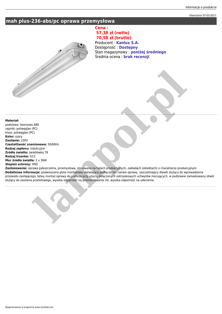 Informacje o produkcie Utworzono 07-03-2017 mah plus-236-abs/pc oprawa przemysłowa Cena : 57,38 zł (netto) 70,58 zł (brutto) l.p l Producent : Kanlux S.A. Dostępność : Dostępny Stan magazynowy : poniżej średniego Średnia ocena : brak recenzji la m po Materiał: podstawa: tworzywo ABS zapinki: poliwęglan (PC) klosz: poliwęglan (PC) Kolor: szary Zasilanie: 230V Częstotliwość znamionowa: 50/60Hz Rodzaj zapłonu: indukcyjne Źródło światła: świetlówka T8 Rodzaj trzonka: G13 Moc źródła światła: 2 x 36W Stopień ochrony: IP65 Zastosowanie: oprawa pyłoszczelna, przemysłowa, stosowana na halach produkcyjnych, zakładach (obiektach) o charakterze produkcyjnym Dodatkowe informacje: podwieszana płyta montażowa ułatwiająca podłączenie i serwis oprawy, uszczelniający dławik służący do wprowadzenia przewodu zasilającego, łatwy montaż oprawy do podłoża przy użyciu dołączonych zatrzaskowych uchwytów mocujących, w podstawie zamaskowany otwór służący do zasilania przelotowego, wysoka odporność na promieniowanie UV, wysoka odporność na uderzenia. Wygenerowano w programie www.oscGold.com