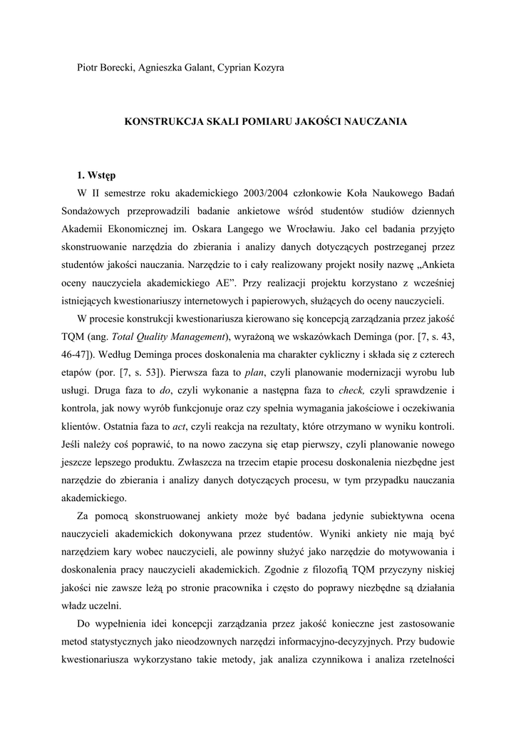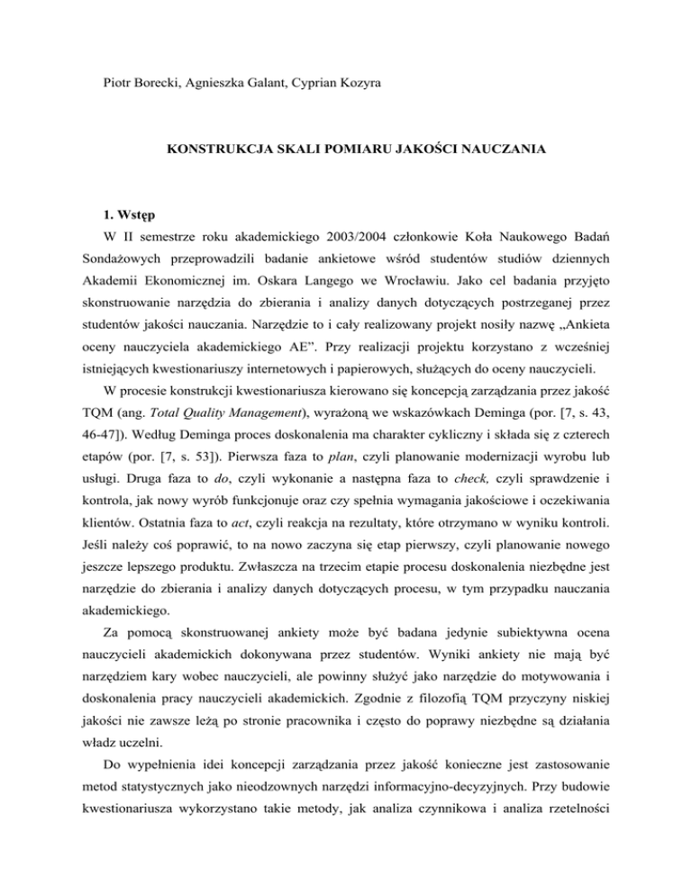 Piotr Borecki, Agnieszka Galant, Cyprian Kozyra KONSTRUKCJA SKALI POMIARU JAKOŚCI NAUCZANIA 1. Wstęp W II semestrze roku akademickiego 2003/2004 członkowie Koła Naukowego Badań Sondażowych przeprowadzili badanie ankietowe wśród studentów studiów dziennych Akademii Ekonomicznej im. Oskara Langego we Wrocławiu. Jako cel badania przyjęto skonstruowanie narzędzia do zbierania i analizy danych dotyczących postrzeganej przez studentów jakości nauczania. Narzędzie to i cały realizowany projekt nosiły nazwę „Ankieta oceny nauczyciela akademickiego AE”. Przy realizacji projektu korzystano z wcześniej istniejących kwestionariuszy internetowych i papierowych, służących do oceny nauczycieli. W procesie konstrukcji kwestionariusza kierowano się koncepcją zarządzania przez jakość TQM (ang. Total Quality Management), wyrażoną we wskazówkach Deminga (por. [7, s. 43, 46-47]). Według Deminga proces doskonalenia ma charakter cykliczny i składa się z czterech etapów (por. [7, s. 53]). Pierwsza faza to plan, czyli planowanie modernizacji wyrobu lub usługi. Druga faza to do, czyli wykonanie a następna faza to check, czyli sprawdzenie i kontrola, jak nowy wyrób funkcjonuje oraz czy spełnia wymagania jakościowe i oczekiwania klientów. Ostatnia faza to act, czyli reakcja na rezultaty, które otrzymano w wyniku kontroli. Jeśli należy coś poprawić, to na nowo zaczyna się etap pierwszy, czyli planowanie nowego jeszcze lepszego produktu. Zwłaszcza na trzecim etapie procesu doskonalenia niezbędne jest narzędzie do zbierania i analizy danych dotyczących procesu, w tym przypadku nauczania akademickiego. Za pomocą skonstruowanej ankiety może być badana jedynie subiektywna ocena nauczycieli akademickich dokonywana przez studentów. Wyniki ankiety nie mają być narzędziem kary wobec nauczycieli, ale powinny służyć jako narzędzie do motywowania i doskonalenia pracy nauczycieli akademickich. Zgodnie z filozofią TQM przyczyny niskiej jakości nie zawsze leżą po stronie pracownika i często do poprawy niezbędne są działania władz uczelni. Do wypełnienia idei koncepcji zarządzania przez jakość konieczne jest zastosowanie metod statystycznych jako nieodzownych narzędzi informacyjno-decyzyjnych. Przy budowie kwestionariusza wykorzystano takie metody, jak analiza czynnikowa i analiza rzetelności pomiaru. W dalszych częściach artykułu przedstawiony jest proces konstrukcji było posiadanie kwestionariusza oraz wyniki badania ankietowego. 2. Utworzenie pozycji skali Do realizacji postawionego celu badawczego niezbędne odpowiedniego zbioru danych uzyskanego na podstawie odpowiedzi studentów na pytania ankietowe dotyczące jakości nauczania. Funkcjonująca wcześniej na uczelni ankieta nie zapewniała takiego zbioru danych, który byłby zgodny z koncepcją zarządzania przez jakość. Z tego powodu zbudowano nowy kwestionariusz ankietowy i za jego pomocą zebrano dane pierwotne. Ponieważ narzędzie badawcze ma służyć do pomiaru postrzeganej jakości, zdecydowano się na konstrukcję pytań i możliwych odpowiedzi zgodnie z często wykorzystywaną do tego celu sumacyjną skalą Likerta. Metodyka konstrukcji takiej skali jest szeroko opisana w pracach obcojęzycznych (np. [1], [3]), a jej elementy i stosowane metody analizy również w pracach polskich autorów (np. [4], [5]). Przed przystąpieniem do konstrukcji kwestionariusza, należało określić populację, próbę oraz sposób jej pobrania. Badanie miało dotyczyć pracowników dydaktycznych Akademii Ekonomicznej we Wrocławiu, dlatego populacją oceniających byli aktualni studenci tejże uczelni. Do badania pilotażowego zdecydowano się na nielosowy dobór próby metodą łatwości dostępu, jednak przy dystrybucji kwestionariuszy starano się zapewnić różnorodną grupę respondentów pod względem płci, wydziału i roku studiów. Ponadto przyjęto, że respondenci będą wypełniać ankietę anonimowo, oraz że nie będzie pytania o dane personalne ocenianych nauczycieli. Ta podwójna anonimowość miała zapewnić wiarygodność zbieranych danych. Każdy respondent był proszony o wypełnienie trzech kwestionariuszy oceny, jednak wielu studentów wypełniło tylko jedną ankietę, oceniając zapewne nauczycieli najbardziej zapadających w pamięć. Tacy nauczyciele są często postrzegani jednowymiarowo – bądź ogólnie źle, bądź ogólnie dobrze. Zjawisko to może utrudniać stosowanie analizy czynnikowej w celu wyodrębnienia kilku różnych kryteriów oceny nauczyciela, do czego są potrzebni nauczyciele lepiej oceniani przez studentów pod względem jednej cechy, a słabiej pod względem innej. Następnym etapem było ułożenie pytań ankiety. W efekcie zastosowania „burzy mózgów” otrzymano obszerną listę cech, które powinien posiadać idealny nauczyciel. Docelowo jednak miało być wyróżnionych tylko kilka najważniejszych aspektów osobowości odnoszących się do jakości nauczania. Z listy cech zostały wybrane najważniejsze i ułożone dla nich pytania. W skład pierwotnego kwestionariusza weszły pytania: 1. Czy prowadzący stwarza przyjazną i swobodną atmosferę podczas zajęć? 2. Czy zajęcia są nudne? 3. Czy odpowiada Tobie poczucie humoru prowadzącego okazywane podczas zajęć? 4. Czy prowadzący wzbudza szacunek dla swojej osoby? 5. Czy prowadzący jest konsekwentny w stawianiu wymagań? 6. Czy prowadzący tłumaczy zagadnienia w sposób jasny i zrozumiały? 7. Czy prowadzący sprawiedliwie ocenia studentów, zgodnie z ich wiedzą, umiejętnościami i włożoną pracą? 8. Czy wymagania na egzamin lub zaliczenie są adekwatne do tematyki poruszanej na zajęciach? 9. Czy wymagania obowiązujące na egzaminie lub zaliczeniu są odpowiednio wcześnie sformułowane? 10. Czy prowadzący solidnie przygotowuje się do zajęć? 11. Czy prowadzący posiada wiedzę i umiejętności merytoryczne do prowadzenia zajęć? 12. Czy prowadzący potrafi przekazać