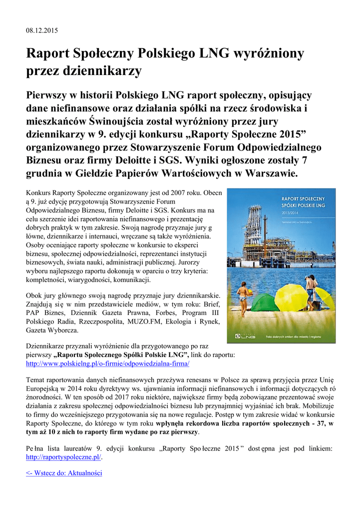 08.12.2015 Raport Społeczny Polskiego LNG wyróżniony przez dziennikarzy Pierwszy w historii Polskiego LNG raport społeczny, opisujący dane niefinansowe oraz działania spółki na rzecz środowiska i mieszkańców Świnoujścia został wyróżniony przez jury dziennikarzy w 9. edycji konkursu „Raporty Społeczne 2015” organizowanego przez Stowarzyszenie Forum Odpowiedzialnego Biznesu oraz firmy Deloitte i SGS. Wyniki ogłoszone zostały 7 grudnia w Giełdzie Papierów Wartościowych w Warszawie. Konkurs Raporty Społeczne organizowany jest od 2007 roku. Obecn ą 9. już edycję przygotowują Stowarzyszenie Forum Odpowiedzialnego Biznesu, firmy Deloitte i SGS. Konkurs ma na celu szerzenie idei raportowania niefinansowego i prezentację dobrych praktyk w tym zakresie. Swoją nagrodę przyznaje jury g łówne, dziennikarze i internauci, wręczane są także wyróżnienia. Osoby oceniające raporty społeczne w konkursie to eksperci biznesu, społecznej odpowiedzialności, reprezentanci instytucji biznesowych, świata nauki, administracji publicznej. Jurorzy wyboru najlepszego raportu dokonują w oparciu o trzy kryteria: kompletności, wiarygodności, komunikacji. Obok jury głównego swoją nagrodę przyznaje jury dziennikarskie. Znajdują się w nim przedstawiciele mediów, w tym roku: Brief, PAP Biznes, Dziennik Gazeta Prawna, Forbes, Program III Polskiego Radia, Rzeczpospolita, MUZO.FM, Ekologia i Rynek, Gazeta Wyborcza. Dziennikarze przyznali wyróżnienie dla przygotowanego po raz pierwszy „Raportu Społecznego Spółki Polskie LNG”, link do raportu: http://www.polskielng.pl/o-firmie/odpowiedzialna-firma/ Temat raportowania danych niefinansowych przeżywa renesans w Polsce za sprawą przyjęcia przez Unię Europejską w 2014 roku dyrektywy ws. ujawniania informacji niefinansowych i informacji dotyczących ró żnorodności. W ten sposób od 2017 roku niektóre, największe firmy będą zobowiązane prezentować swoje działania z zakresu społecznej odpowiedzialności biznesu lub przynajmniej wyjaśniać ich brak. Mobilizuje to firmy do wcześniejszego przygotowania się na nowe regulacje. Postęp w tym zakresie widać w konkursie Raporty Społeczne, do którego w tym roku wpłynęła rekordowa liczba raportów społecznych - 37, w tym aż 10 z nich to raporty firm wydane po raz pierwszy. Pe łna lista laureatów 9. edycji konkursu „Raporty Spo łeczne 2015 ” dost ępna jest pod linkiem: http://raportyspoleczne.pl/. <- Wstecz do: Aktualności