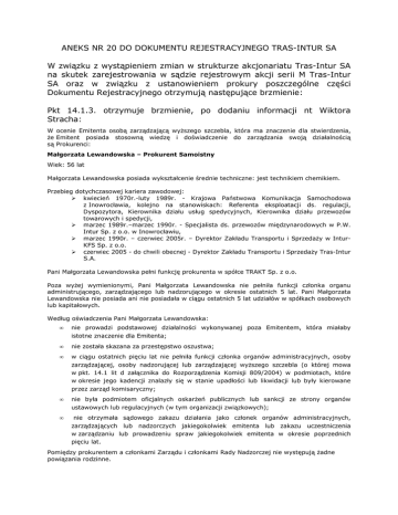 ANEKS NR 20 DO DOKUMENTU REJESTRACYJNEGO TRAS-INTUR SA W związku z wystąpieniem zmian w strukturze akcjonariatu Tras-Intur SA na skutek zarejestrowania w sądzie rejestrowym akcji serii M Tras-Intur SA oraz w związku z ustanowieniem prokury poszczególne części Dokumentu Rejestracyjnego otrzymują następujące brzmienie: Pkt 14.1.3. otrzymuje brzmienie, po dodaniu informacji nt Wiktora Stracha: W ocenie Emitenta osobą zarządzającą wyŜszego szczebla, która ma znaczenie dla stwierdzenia, Ŝe Emitent posiada stosowną wiedzę i doświadczenie do zarządzania swoją działalnością są Prokurenci: Małgorzata Lewandowska – Prokurent Samoistny Wiek: 56 lat Małgorzata Lewandowska posiada wykształcenie średnie techniczne: jest technikiem chemikiem. Przebieg dotychczasowej kariera zawodowej: kwiecień 1970r.-luty 1989r. - Krajowa Państwowa Komunikacja Samochodowa z Inowrocławia, kolejno na stanowiskach: Referenta eksploatacji ds. regulacji, Dyspozytora, Kierownika działu usług spedycyjnych, Kierownika działu przewozów towarowych i spedycji, marzec 1989r.–marzec 1990r. - Specjalista ds. przewozów międzynarodowych w P.W. Intur Sp. z o.o. w Inowrocławiu, marzec 1990r. – czerwiec 2005r. – Dyrektor Zakładu Transportu i SprzedaŜy w InturKFS Sp. z o.o. czerwiec 2005 - do chwili obecnej - Dyrektor Zakładu Transportu i SprzedaŜy Tras-Intur S.A. Pani Małgorzata Lewandowska pełni funkcję prokurenta w spółce TRAKT Sp. z o.o. Poza wyŜej wymienionymi, Pani Małgorzata Lewandowska nie pełniła funkcji członka organu administrującego, zarządzającego lub nadzorującego w okresie ostatnich 5 lat. Pani Małgorzata Lewandowska nie posiada ani nie posiadała w ciągu ostatnich 5 lat udziałów w spółkach osobowych lub kapitałowych. Według oświadczenia Pani Małgorzata Lewandowska: • nie prowadzi podstawowej działalności wykonywanej poza Emitentem, która miałaby istotne znaczenie dla Emitenta; • nie została skazana za przestępstwo oszustwa; • w ciągu ostatnich pięciu lat nie pełniła funkcji członka organów administracyjnych, osoby zarządzającej, osoby nadzorującej lub zarządzającej wyŜszego szczebla (o której mowa w pkt. 14.1 lit d załącznika do Rozporządzenia Komisji 809/2004) w podmiotach, które w okresie jego kadencji znalazły się w stanie upadłości lub likwidacji lub były kierowane przez zarząd komisaryczny; • nie była podmiotem oficjalnych oskarŜeń publicznych lub sankcji ze strony organów ustawowych lub regulacyjnych (w tym organizacji związkowych); • nie otrzymała sądowego zakazu działania jako członek organów administracyjnych, zarządzających lub nadzorczych jakiegokolwiek emitenta lub zakazu uczestniczenia w zarządzaniu lub prowadzeniu spraw jakiegokolwiek emitenta w okresie poprzednich pięciu lat. Pomiędzy prokurentem a członkami Zarządu i członkami Rady Nadzorczej nie występują Ŝadne powiązania rodzinne. Wiktor Strach – Prokurent Samoistny Wiek: 35 lat Pan Wiktor Strach posiada wyŜsze wykształcenie techniczne – w 1996 r. ukończył Akademię Techniczno – Rolniczą w Bydgoszczy. Przebieg kariery zawodowej: 2006 – V 2007 - Tras Intur S.A. / Członek Zarządu Dyrektor Techniczny 2002 – nadal – prowadzenie własnej działalności gospodarczej pod firmą Stalbud, działalność handlowa – branŜa stalowa. 1998 – 2001 r. – dyrektor handlowy w Artmet Bis Sp. z o.o., 1996 – 1998 r. – specjalista ds. handlowych w P.W. Artmet, Wiktor Strach nie jest i nie był w ciągu ostatnich 5 lat członkiem organów administracyjnych, zarządzających lub nadzorczych oraz wspólnikiem jakiejkolwiek spółki kapitałowej i osobowej. Według złoŜonego oświadczenia Wiktor Strach: • nie prowadzi podstawowej działalności wykonywanej poza Emitentem, która miałaby istotne znaczenie dla Emitenta; • nie został skazany za przestępstwo oszustwa; • w ciągu ostatnich pięciu lat nie pełnił funkcji członka organów administracyjnych, osoby zarządzającej, osoby nadzorującej lub zarządzającej wyŜszego szczebla (o której mowa w pkt. 14.1 lit d załącznika do Rozporządzenia Komisji 809/2004) w podmiotach, które w okresie jego kadencji znalazły się w stanie upadłości lub likwidacji lub były kierowane przez zarząd komisaryczny; • nie był podmiotem oficjalnych oskarŜeń publicznych lub sankcji ze strony organów ustawowych lub regulacyjnych (w tym organizacji związkowych); • nie otrzymał sądowego zakazu działania jako członek organów administracyjnych, zarządzających lub nadzorczych jakiegokolwiek emitenta lub zakazu uczestniczenia w zarządzaniu lub prowadzeniu spraw jakiegokolwiek emitenta w okresie poprzednich pięciu lat. Pomiędzy członkami Zarządu nie występują Ŝadne powiązania rodzinne. Pomiędzy członkami Zarządu a członkami Rady Nadzorczej oraz osobą zarządzającą wyŜszego szczebla nie występują powiązania rodzinne. Pkt 16.1.3. otrzymuje brzmienie: Małgorzata Lewandowska pełni funkcję prokurenta od 6 lipca 2005 roku. Wiktor Strach pełni funkcję prokurenta od 17 maja 2007 r. Pkt 16.2. otrzymuje brzmienie: Jan Mazur jest zatrudniony w Spółce na podstawie umowy o pracę. W przypadku rozwiązania umowy o pracę przysługują mu odszkodowania i odprawy, wynikające z kodeksu pracy. Paweł Puszczyński jest zatrudniony w Spółce na podstawie umowy o pracę. W przypadku rozwiązania umowy o pracę przysługują mu odszkodowania i odprawy, wynikające z kodeksu pracy. Małgorzata Lewandowska jest zatrudniona w Spółce na podstawie umowy o pracę. W przypadku rozwiązania umowy o pracę przysługują jej odszkodowania i odprawy, wynikające z kodeksu pracy. Wiktor Strach jest zatrudniony w Spółce na podstawie umowy o pracę. W przypadku rozwiązania umowy o pracę przysługują jej odszkodowania i odprawy, wynikające z kodeksu pracy. Członkowie Rady Nadzorczej nie są zatrudnieni przez Emitenta. Nie istnieją Ŝadne umowy o świadczenie