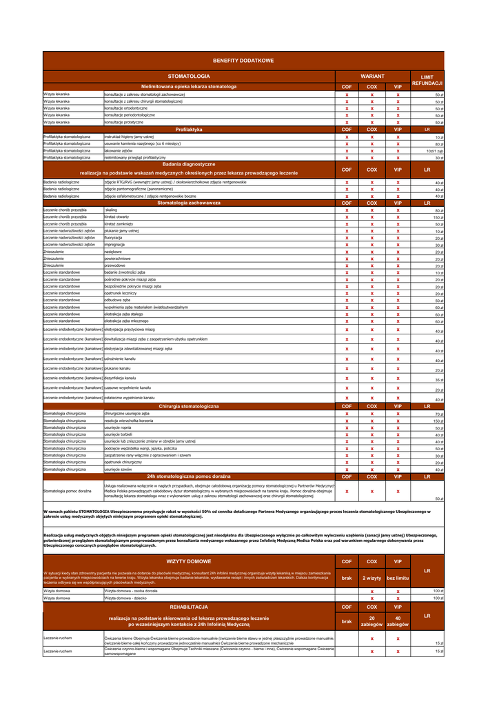 BENEFITY DODATKOWE STOMATOLOGIA Nielimitowana opieka lekarza stomatologa WARIANT LIMIT REFUNDACJI COF COX VIP x x x x x x x x x x x x x x x COF COX VIP x x x x x x x x x x x x COF COX VIP x x x x x x x x x COF COX VIP x x x x x x x x x x x x x x x x x x x x x x x x x x x x x x x x x x x x x x x x x x x x x x x x x x x Leczenie endodentyczne (kanałowe) ekstyrpacja przyżyciowa miazg x x x 40 zł Leczenie endodentyczne (kanałowe) dewitalizacja miazgi zęba z zaopatrzeniem ubytku opatrunkiem x x x 40 zł Leczenie endodentyczne (kanałowe) ekstyrpacja zdewitalizowanej miazgi zęba x x x 40 zł Leczenie endodentyczne (kanałowe) udrożnienie kanału x x x 40 zł Leczenie endodentyczne (kanałowe) płukanie kanału x x x 20 zł Leczenie endodentyczne (kanałowe) dezynfekcja kanału x x x 35 zł Leczenie endodentyczne (kanałowe) czasowe wypełnienie kanału x x x 20 zł Leczenie endodentyczne (kanałowe) ostateczne wypełnienie kanału x x x COF COX VIP x x x x x x x x x x x x x x x x x x x x x x x x x x x COF COX VIP x x x Wizyta lekarska konsultacje z zakresu stomatologii zachowawczej Wizyta lekarska konsultacje z zakresu chirurgii stomatologicznej Wizyta lekarska konsultacje ortodontyczne Wizyta lekarska konsultacje periodontologiczne Wizyta lekarska konsultacje protetyczne Profilaktyka Profilaktyka stomatologiczna instruktaż higieny jamy ustnej Profilaktyka stomatologiczna usuwanie kamienia nazębnego (co 6 miesięcy) Profilaktyka stomatologiczna lakowanie zębów Profilaktyka stomatologiczna nielimitowany przegląd profilaktyczny 50 zł 50 zł 50 zł 50 zł 50 zł LR 10 zł 80 zł 10zl/1 ząb 30 zł Badania diagnostyczne realizacja na podstawie wskazań medycznych określonych przez lekarza prowadzącego leczenie Badania radiologiczne zdjęcie RTG/RVG (wewnątrz jamy ustnej) / okołowierzchołkowe zdjęcia rentgenowskie Badania radiologiczne zdjęcie pantomograficzne (panoramiczne) Badania radiologiczne zdjęcie cefalometryczne / zdjęcie rentgenowskie boczne Stomatologia zachowawcza Leczenie chorób przyzębia skaling Leczenie chorób przyzębia kiretaż otwarty Leczenie chorób przyzębia kiretaż zamknięty Leczenie nadwrażliwości zębów płukanie jamy ustnej Leczenie nadwrażliwości zębów fluoryzacja Leczenie nadwrażliwości zębów impregnacja Znieczulenie nasiękowe Znieczulenie powierzchniowe Znieczulenie przewodowe Leczenie standardowe badanie żywotności zęba Leczenie standardowe pośrednie pokrycie miazgi zęba Leczenie standardowe bezpośrednie pokrycie miazgi zęba Leczenie standardowe opatrunek leczniczy Leczenie standardowe odbudowa zęba Leczenie standardowe wypełnienia zęba materiałem światłoutwardzalnym Leczenie standardowe ekstrakcja zęba stałego Leczenie standardowe ekstrakcja zęba mlecznego Chirurgia stomatologiczna Stomatologia chirurgiczna chirurgiczne usunięcie zęba Stomatologia chirurgiczna resekcja wierzchołka korzenia Stomatologia chirurgiczna usunięcie ropnia Stomatologia chirurgiczna usunięcie torbieli Stomatologia chirurgiczna usunięcie lub zniszczenie zmiany w obrębie jamy ustnej Stomatologia chirurgiczna podcięcie wędzidełka wargi, języka, policzka Stomatologia chirurgiczna zaopatrzenie rany włącznie z opracowaniem i szwem Stomatologia chirurgiczna opatrunek chirurgiczny Stomatologia chirurgiczna usunięcie szwów 24h stomatologiczna pomoc doraźna Stomatologia pomoc doraźna Usługa realizowana wyłącznie w nagłych przypadkach, obejmuje całodobową organizację pomocy stomatologicznej u Partnerów Medycznych Medica Polska prowadzących całodobowy dyżur stomatologiczny w wybranych miejscowościach na terenie kraju. Pomoc doraźna obejmuje konsultację lekarza stomatologa wraz z wykonaniem usług z zakresu stomatologii zachowawczej oraz chirurgii stomatologicznej LR 40 zł 40 zł 40 zł LR 80 zł 150 zł 50 zł 10 zł 20 zł 30 zł 20 zł 20 zł 20 zł 10 zł 20 zł 20 zł 20 zł 50 zł 60 zł 60 zł 60 zł 40 zł LR 70 zł 150 zł 50 zł 40 zł 40 zł 50 zł 30 zł 20 zł 40 zł LR 50 zł W ramach pakietu STOMATOLOGIA Ubezpieczonemu przysługuje rabat w wysokości 50% od cennika detalicznego Partnera Medycznego organizującego proces leczenia stomatologicznego Ubezpieczonego w zakresie usług medycznych objętych niniejszym programem opieki stomatologicznej. Realizacja usług medycznych objętych niniejszym programem opieki stomatologicznej jest nieodpłatna dla Ubezpieczonego wyłącznie po całkowitym wyleczeniu uzębienia (sanacji jamy ustnej) Ubezpieczonego, potwierdzonej przeglądem stomatologicznym przeprowadzonym przez konsultanta medycznego wskazanego przez Infolinię Medyczną Medica Polska oraz pod warunkiem regularnego dokonywania przez Ubezpieczonego corocznych przeglądów stomatologicznych. WIZYTY DOMOWE W sytuacji kiedy stan zdrowotny pacjenta nie pozwala na dotarcie do placówki medycznej, konsultant 24h infolinii medycznej organizuje wizytę lekarską w miejscu zamieszkania pacjenta w wybranych miejscowościach na terenie kraju. Wizyta lekarska obejmuje badanie lekarskie, wystawienie recept i innych zaświadczeń lekarskich. Dalsza kontynuacja leczenia odbywa się we współpracujących placówkach medycznych. Wizyta domowa Wizyta domowa - osoba dorosła Wizyta domowa Wizyta domowa - dziecko Leczenie ruchem Leczenie ruchem COF COX VIP brak 2 wizyty bez limitu x x x x COX VIP LR REHABILITACJA COF realizacja na podstawie skierowania od lekarza prowadzącego leczenie po wcześniejszym kontakcie z 24h Infolinią Medyczną brak Ćwiczenia bierne Obejmuje:Ćwiczenia bierne prowadzone manualnie (ćwiczenie bierne stawu w jednej płaszczyźnie prowadzone manualnie, ćwiczenie bierne całej kończyny prowadzone jednocześnie manualnie) Ćwiczenia bierne prowadzone mechanicznie Ćwiczenia czynno-bierne i wspomagane Obejmuje:Techniki mieszane (Ćwiczenie czynno - bierne i inne), Ćwiczenie wspomagane Ćwiczenie samowspomagane 20 40 zabiegów zabiegów x x x x 100 zł 100 zł LR 15 zł 15 zł Leczenie ruchem Ćwicze