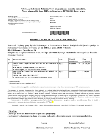 UWAGA!!! Z dniem 06 lipca 2015r. ulega zmianie siedziba kancelarii. Nowy adres od 06 lipca 2015: ul. Solankowa 20/5 88-100 Inowrocław Komornik Sądowy przy Sądzie Rejonowym w Inowrocławiu Izabela Podgórska-Wójtowicz Kancelaria Komornicza Solankowa 20/5, 88-100 Inowrocław tel. 052-357-19-11 e-mail: [email protected] www.komornik.inowroclaw.pl Km 2651/16 Inowrocław, dnia 24-01-2017 Sz P Marcin Kuczma Gogółkowo 36 88-410 Gąsawa *0020001900341* #IP *0020001900341*/0419/ OBWIESZCZENIE O LICYTACJI RUCHOMOŚCI Komornik Sądowy przy Sądzie Rejonowym w Inowrocławiu Izabela Podgórska-Wójtowicz podaje do publicznej wiadomości, że w dniu 27-02-2017r. o godz. 08:30 w lokalu: 88-410 Gąsawa, Gogółkowo 36 odbędzie się w trybie ustalonym w art. 867 kpc pierwsza licytacja ruchomości należących do dłużnika i składających się z: Lp. Nazwa ruchomości Ilość 1 PRZYCZEPA CIĘŻAROWA ROLNICZA METAL-FACH 1 [szt.] T7 30/3 ROK PROD. 2013 KOLOR: CZERWONY Wartość szacunkowa 35 000,00 **) Cena wywołania 26 250,00 .nr rej. CZNEF68, VIN 730311301554, kolor czerwony 2 SAMOCHÓD OSOBOWY VOLKSWAGEN PASSAT 1.9 TDI ROK PROD. 2001 KOLOR: ZIELONY 1 [szt.] 10 000,00 *) 7 500,00 .nr rej. CZNGG78, VIN WVWZZZ3BZ2E095206, kolor zielony *) cena za sztukę **) kwota brutto zawiera podatek VAT Ruchomości można oglądać w dzień licytacji w miejscu i czasie oznaczonym wyżej. Suma wywołania wynosi 75% sumy oszacowania. Przystępujący do przetargu obowiązany jest złożyć rękojmię w wysokości jednej dziesiątej części sumy oszacowania. Rękojmię złożoną przez licytanta, któremu udzielono przybicia, zatrzymuje się; pozostałym licytantom rękojmię zwraca się niezwłocznie. Jeżeli nabywca nie wykonał w terminie warunków licytacji co do zapłaty ceny, traci rękojmię, a skutki przybicia wygasają. Z utraconej rękojmi pokrywa się koszty egzekucji związanej ze sprzedażą, a reszta wchodzi w skład sumy uzyskanej w egzekucji albo jeżeli egzekucja została umorzona jest przelewana na dochód Skarbu Państwa (art. 8671 kpc). W przetargu nie mogą uczestniczyć: dłużnik, komornik, ich małżonkowie, dzieci, rodzice i rodzeństwo, osoby obecne na licytacji w charakterze urzędowym oraz licytant, który nie wykonał warunków poprzedniej licytacji. Stawienie się jednego licytanta wystarcza do odbycia przetargu. Pełnomocnictwo do udziału w przetargu powinno być stwierdzone dokumentem z podpisem urzędowo poświadczonym, chyba że chodzi o pełnomocnictwo udzielone adwokatowi lub radcy prawnemu (art. 8672 kpc) Komornik w oparciu o art.18 ustawy z dnia 11 marca 2004r o podatku od towarów i usług (Dz.U. Nr 54, poz.535) wystawia faktury VAT. UWAGA: Licytacja może się nie odbyć bez podania przyczyny. Jeżeli drzwi będą zamknięte, będą otwierane na koszt i odpowiedzialność obowiązanegodłużnika. Asesor Komornik Sądowy Monika Kozłowska Izabela Podgórska-Wójtowicz 1 2