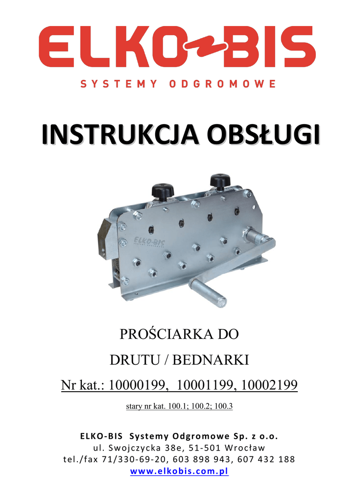 INSTRUKCJA OBSŁUGI PROŚCIARKA DO DRUTU / BEDNARKI Nr kat.: 10000199, 10001199, 10002199 stary nr kat. 100.1; 100.2; 100.3 ELK O - B IS Sy st em y O dg ro mo we S p. z o . o . ul . S w oj cz y c ka 3 8 e, 51 - 50 1 W ro c ła w t el . /f ax 7 1 / 3 3 0 - 6 9- 2 0 , 6 0 3 8 9 8 9 4 3 , 6 0 7 4 3 2 1 8 8 ww w. e lko bis. c o m. pl Instrukcja obsługi Szanowny Kliencie, dziękujemy za zakup prościarki do drutu/bednarki 10000199, 10001199, 10002199 firmy ELKO-BIS. Podczas użytkowania prościarki zaleca się przestrzeganie wszelkich przepisów bezpieczeństwa pracy. Przed użyciem prościarki prosimy zapoznać się z niniejszą instrukcją obsługi urządzenia. 1. Zastosowanie: Prościarka 10000199 służy do prostowania drutu odgromowego Ø 6 – Ø 8. Prościarka 10001199 służy do prostowania bednarki max 40x4. Prościarka 10002199 służy do prostowania drutu odgromowego Ø 6 – Ø 8 i bednarki max 40x4. 2. Montaż Przed rozpoczęciem pracy z prościarką, należy wybrać miejsce zapewniające wystarczająco dużo wolnej przestrzeni do obsługi urządzenia z zachowaniem wszelkich zasad bezpieczeństwa. Podczas pracy prościarka powinna być przymocowana przy pomocy czterech śrub do podłoża. 3. Dane techniczne: Zdolność prostowania: Drut odgromowy FzNe: Ø6, Ø7, Ø8 Drut odgromowy Cu Ø6, Ø7, Ø8 Drut odgromowy Mi, Al Ø8 Bednarka Max 40x4 Prędkość: ok. 9 m/min Prędkość prostowania zależy od szybkości kręcenia korbą. 4. Budowa prościarki: 1. Prowadnica 2. Pokrętła regulacyjne 3. Uchwyt do manualnej obsługi urządzenia 4. Uchwyty do przenoszenia 5. Prostowanie drutu: Aby przystąpić do prostowania drutu odgromowego/bednarki za pomocą prościarki należy kolejno wykonać wymienione poniżej operacje: a. Przymocować prościarkę do podłoża ( np. do palety drewnianej). b. Przy użyciu uchwytów do prostowania drutu firmy ELKO-BIS (nr kat. 98600101) wyprostować początek drutu długości ok. 30 cm. (dla prościarki 10000199 i 10002199) c. Wyprostowany drut/bednarkę wprowadzić do prowadnicy drutu (1). d. Pokrętła regulacyjne (2) odkręcić w celu swobodnego wprowadzenia drutu/bednarki e. Za pomocą pokręteł regulacyjnych (2) ustawić docisk rolek do danej średnicy prostowanego drutu/bednarki. Czynność należy wykonać delikatnie i z wyczuciem. f. Drut/bednarkę prostować równomiernie kręcąc korbą (3) aż do uzyskania pożądanej długości prostego drutu/bednarki. Czynności od b do e należy wykonać dla każdej kolejnej partii drutu/bednarki! 6. Instrukcja w zakresie bezpieczeństwa BHP i konserwacji: 1. Obsługujący urządzenie powinien być ubrany w odzież roboczą i ochronną. Nie wolno nosić luźnych ubrań oraz ozdób. Włosy powinny być spięte lub przykryte czapką. Mankiety przy ubraniu lub koszuli powinny dokładnie przylegać. 2. Miejsce pracy powinno być zawsze czyste i uporządkowane a stanowisko pracy dobrze oświetlone. 3. Przed rozpoczęciem pracy należy sprawdzić: o ogólny stan prościarki. 4. Podczas pracy prościarką należy zachować bezpieczeństwo, aby: o nie trzymać rąk w zasięgu rolek prostujących i ograniczników, o nie używać prościarki do innych celów niż jej przeznaczenie. 5. Pracownikowi obsługującemu prościarkę zabrania się : o manipulować ręką w pobliżu obracających się rolek prostujących, 6. W razie wątpliwości co do bezpieczeństwa przy wykonywanej pracy, pracownik ma prawo przerwać pracę i zwrócić się do przełożonego w celu wyjaśnienia sytuacji. 7. Po zakończeniu pracy należy przeprowadzić konserwację urządzenia: o dokładnie oczyścić rolki oraz koła zębate z wszelkich zanieczyszczeń, które mogły dostać się do urządzenia podczas pracy (piasek, pył, opiłki metalu itp.), z zawartości (drutu). o zabezpieczyć prościarkę przed działaniem brudu i wilgoci. Ostrzeżenie! Nieprzestrzeganie zaleceń przedstawionych w niniejszej instrukcji może doprowadzić do narażenia zdrowia i życia użytkownika bądź do uszkodzenia urządzenia!