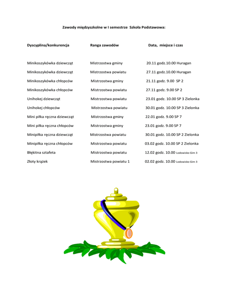 Zawody międzyszkolne w I semestrze Szkoła Podstawowa: Dyscyplina/konkurencja Ranga zawodów Data, miejsce i czas Minikoszykówka dziewcząt Mistrzostwa gminy 20.11 godz.10.00 Huragan Minikoszykówka dziewcząt Mistrzostwa powiatu 27.11 godz.10.00 Huragan Minikoszykówka chłopców Mistrzostwa gminy 21.11 godz. 9.00 SP 2 Minikoszykówka chłopców Mistrzostwa powiatu 27.11 godz. 9.00 SP 2 Unihokej dziewcząt Mistrzostwa powiatu 23.01 godz. 10.00 SP 3 Zielonka Unihokej chłopców Mistrzostwa powiatu 30.01 godz. 10.00 SP 3 Zielonka Mini piłka ręczna dziewcząt Mistrzostwa gminy 22.01 godz. 9.00 SP 7 Mini piłka ręczna chłopców Mistrzostwa gminy 23.01 godz. 9.00 SP 7 Minipiłka ręczna dziewcząt Mistrzostwa powiatu 30.01 godz. 10.00 SP 2 Zielonka Minipiłka ręczna chłopców Mistrzostwa powiatu 03.02 godz. 10.00 SP 2 Zielonka Błękitna sztafeta Mistrzostwa powiatu 12.02 godz. 10.00 Lodowisko Gim 3 Złoty krążek Mistrzostwa powiatu 1 02.02 godz. 10.00 Lodowisko Gim 3