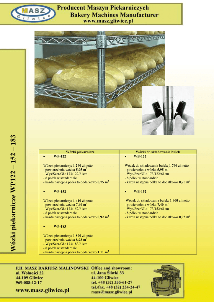 Wózki piekarnicze WP122 – 152 – 183 Wózki piekarnicze WP-122 Wózki do składowania bułek WB-122 Wózek piekarniczy: 1 290 zł netto - powierzchnia wózka 5,95 m2 - Wys/Szer/Gł.: 173/122/61cm - 8 półek w standardzie - każda następna półka to dodatkowo 0,75 m2 Wózek do składowania bułek: 1 790 zł netto - powierzchnia wózka 5,95 m2 - Wys/Szer/Gł.: 173/122/61cm - 8 półek w standardzie - każda następna półka to dodatkowo 0,75 m2 WP-152 Wózek piekarniczy: 1 410 zł netto - powierzchnia wózka 7,40 m2 - Wys/Szer/Gł.: 173/152/61cm - 8 półek w standardzie - każda następna półka to dodatkowo 0,92 m2 WP-183 Wózek piekarniczy: 1 890 zł netto - powierzchnia wózka 8,93 m2 - Wys/Szer/Gł.: 173/183/61cm - 8 półek w standardzie - każda następna półka to dodatkowo 1,11 m2 WB-152 Wózek do składowania bułek: 1 900 zł netto - powierzchnia wózka 7,40 m2 - Wys/Szer/Gł.: 173/152/61cm - 8 półek w standardzie - każda następna półka to dodatkowo 0,92 m2